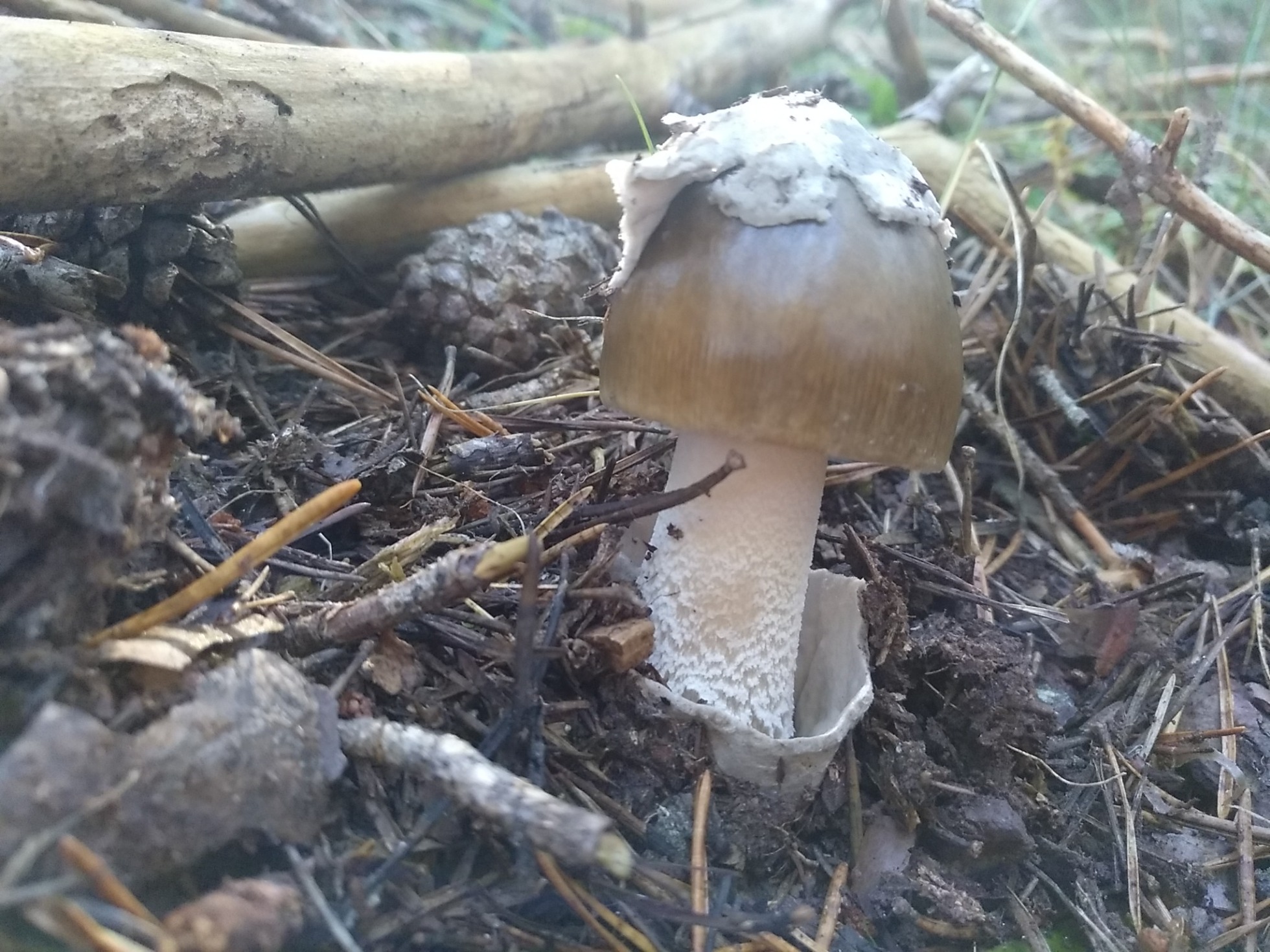 La primera creo que es una Oronja Enfundada muy joven de unos 7 u 8 cm. Había varios ejemplares bajo los últimos pinos que dan comienzo a un prado con un riachuelo. Había varias.