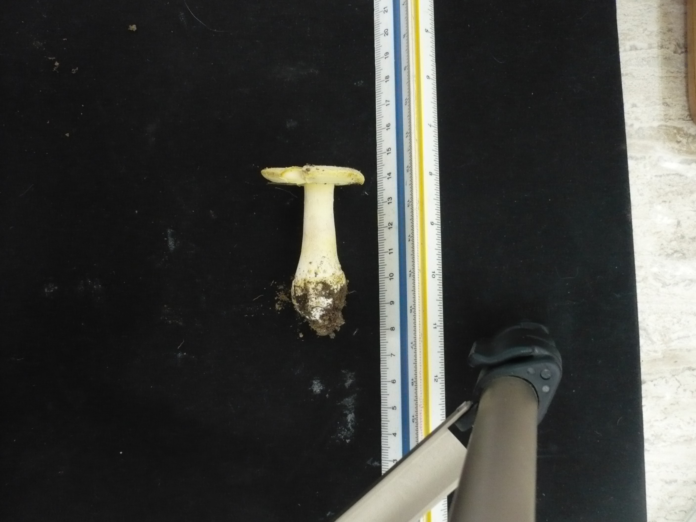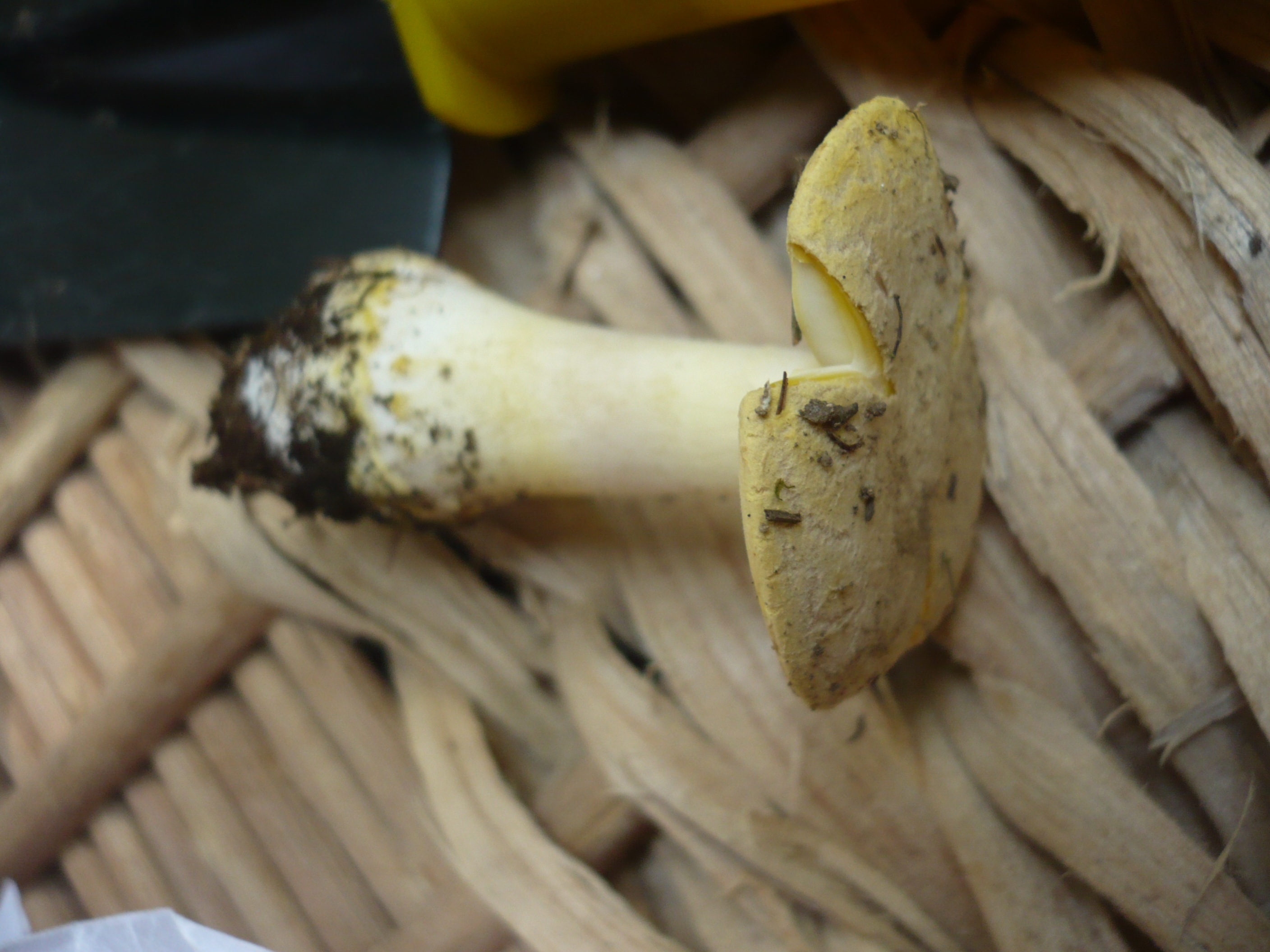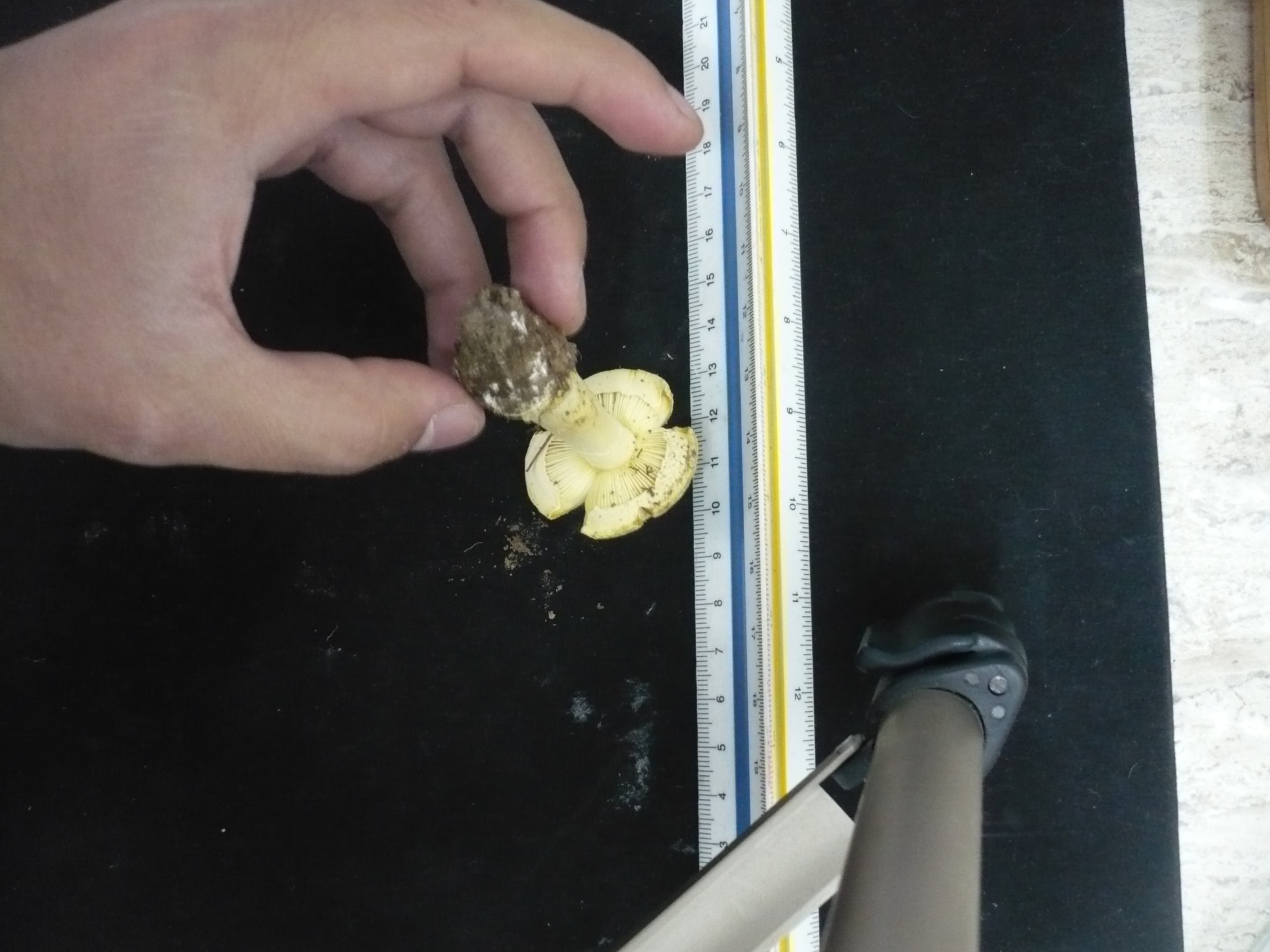 Por esos tonos amarillos, para mi es claramente Amanita franchetii, en este caso el anillo se le ha quedado en el sombrero en vez del pie.