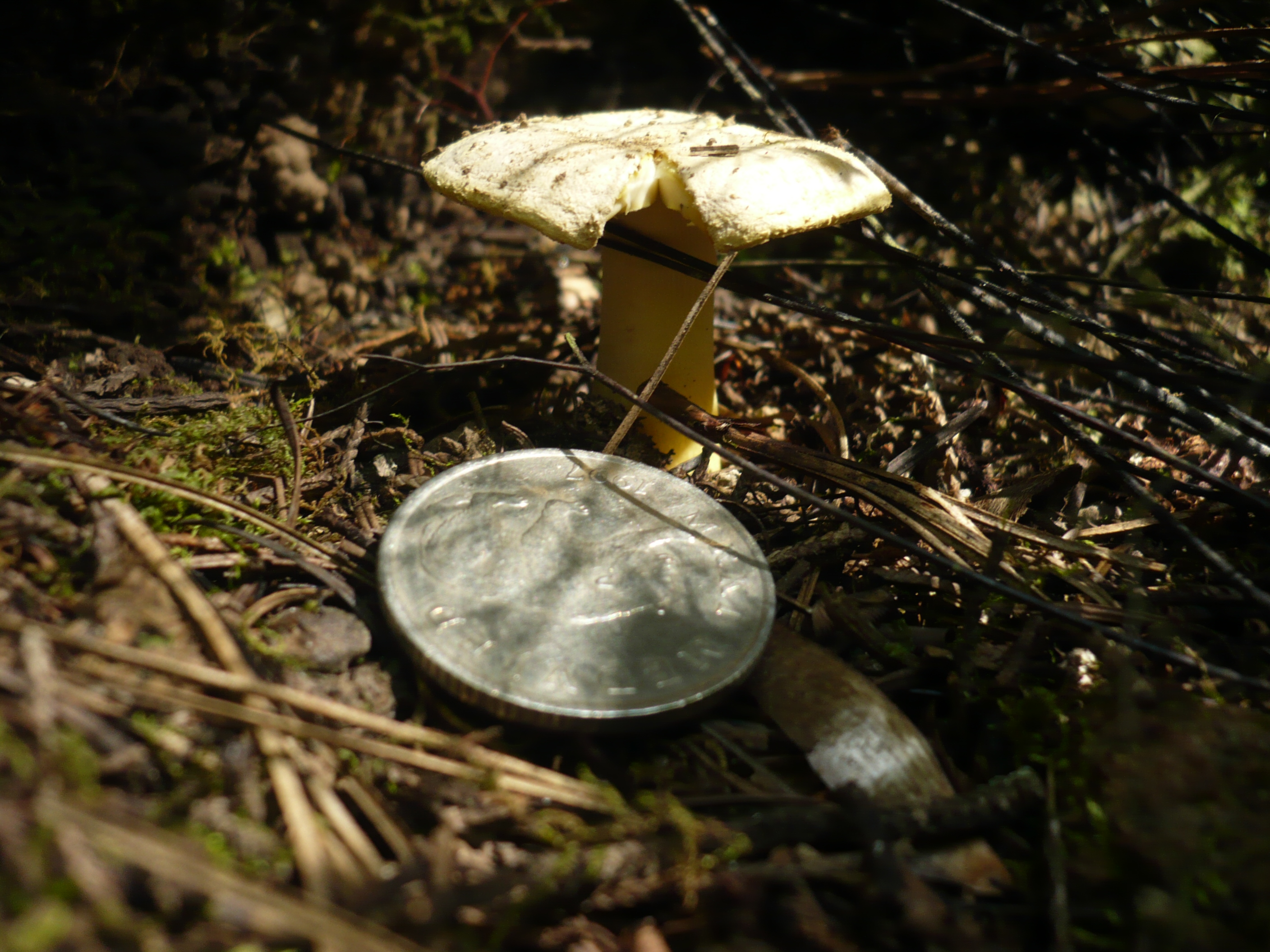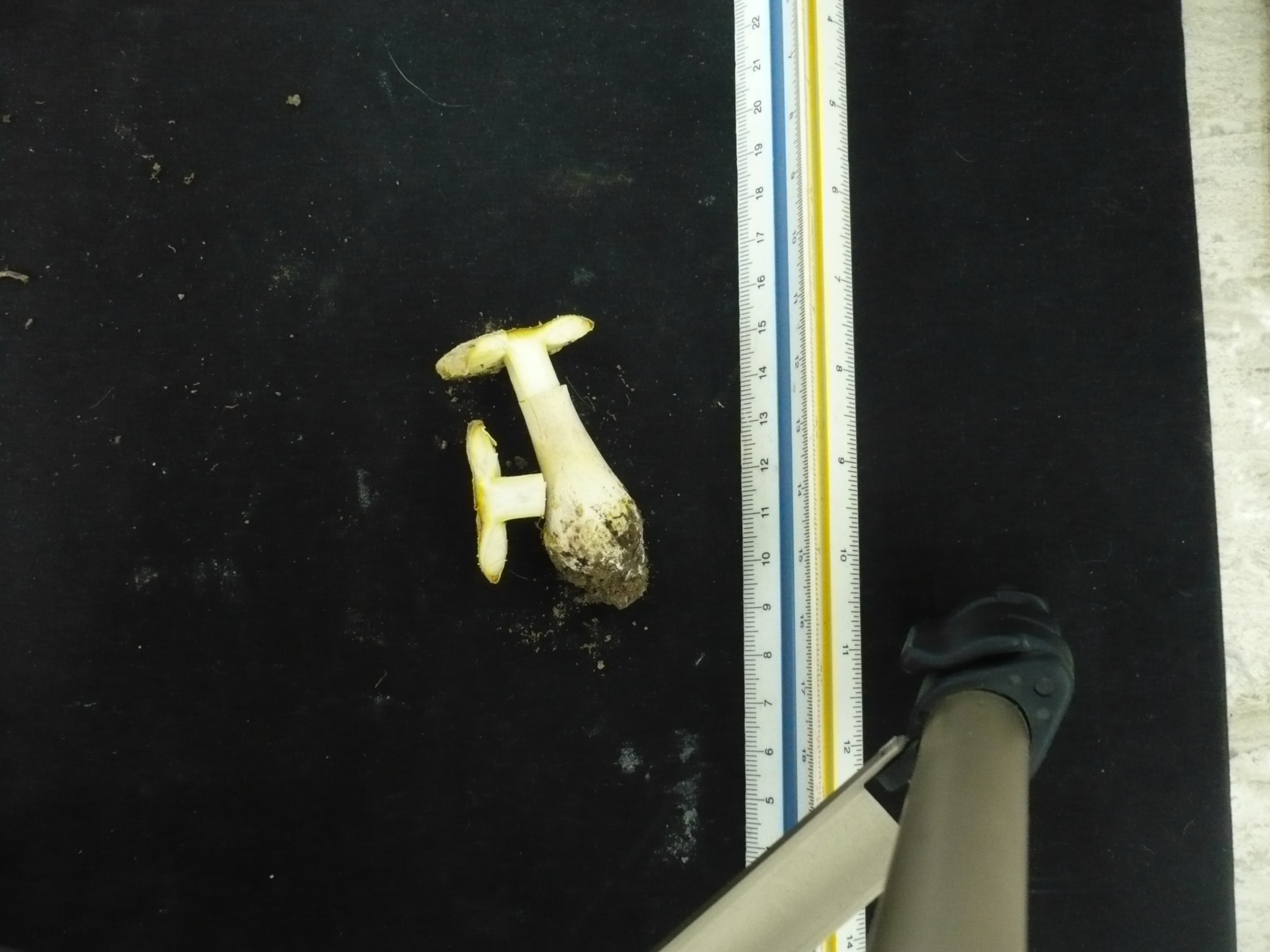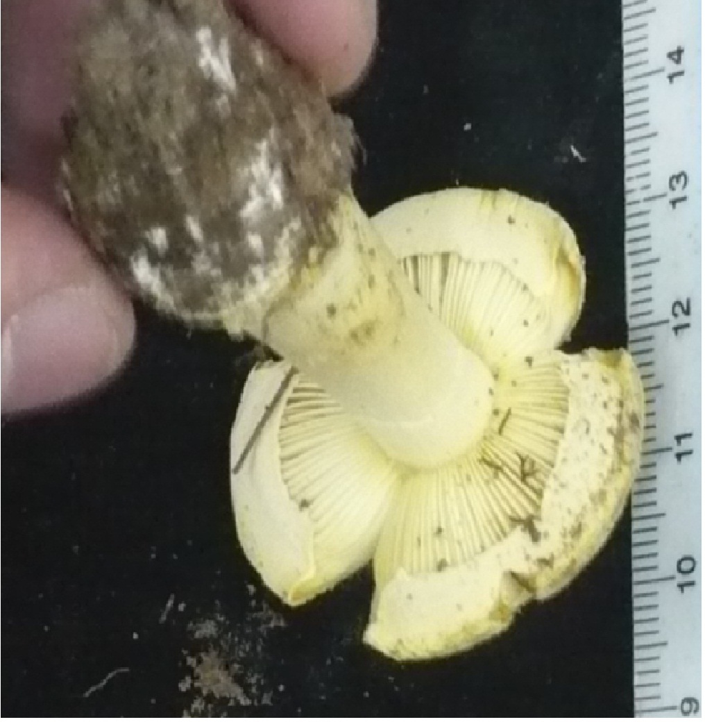 Por esos tonos amarillos, para mi es claramente Amanita franchetii, en este caso el anillo se le ha quedado en el sombrero en vez del pie.