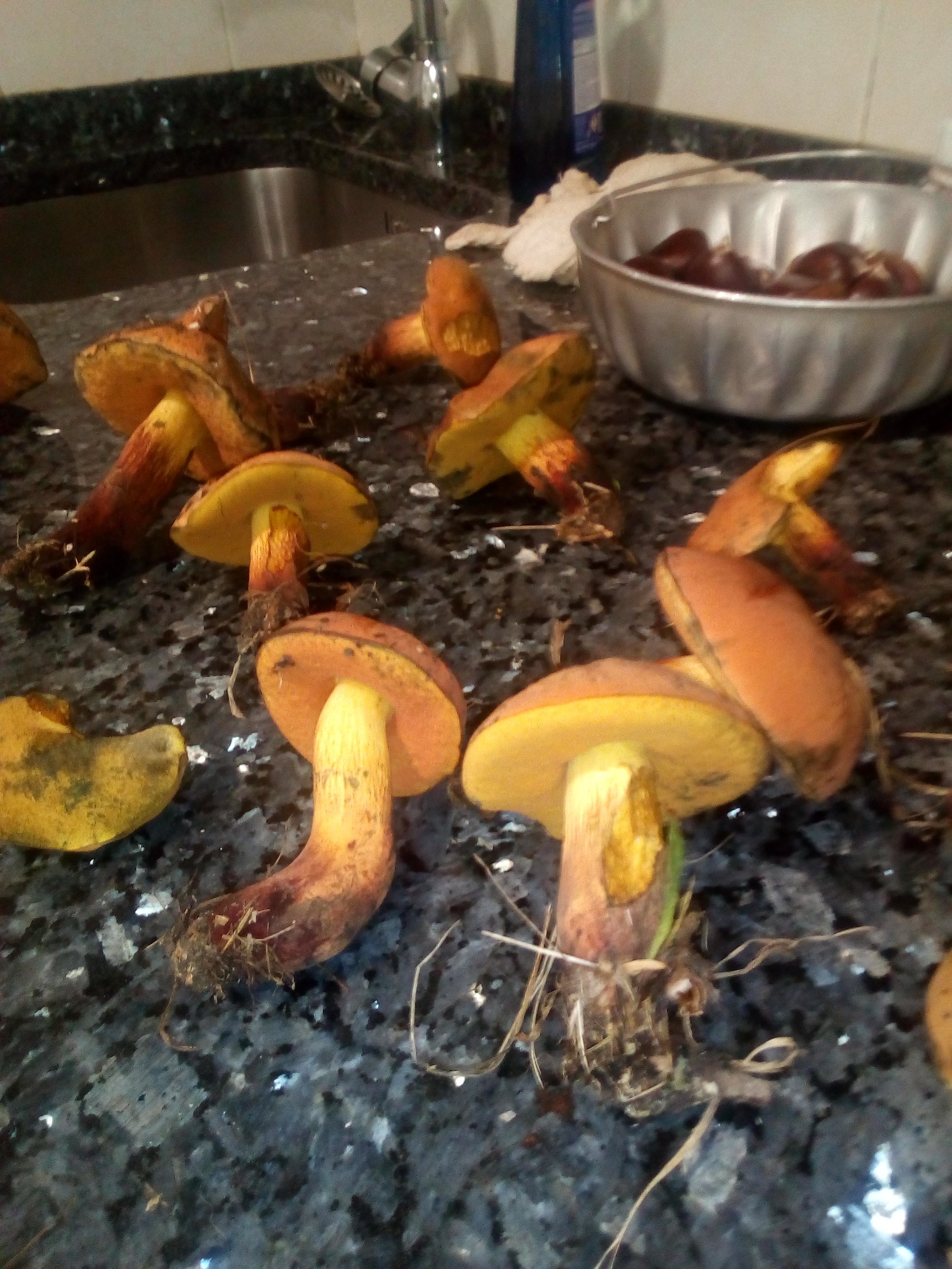 Pues al corte sale un color azul claro hacia el sombrero y en la parte de la base del pie azul casi negro. He cogido unos cuantos masy mas pekes qie se aprecia mejor. Estaban a unos 5 metros de un aliso y un chopo y a unos 10 metros de un roble cerca de una carretera de monte. Me ha sorprendido ver beñlotas por el suelo porke el roble quedaba lejos. Os pongo unas fotos mas. Gracias por contestarme.