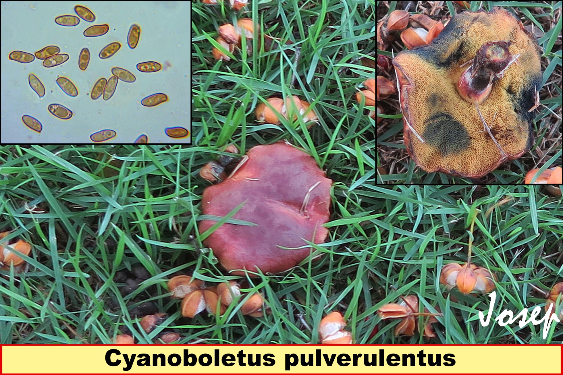 Me gustaría una foto de uno de esos ejemplares dividido en dos para ver su reacción de color al corte, por que creo que los tiros pueden ir por Boletus pulverulentus = Cyanoboletus pulverulentus...eso si...los poros parecen algo anaranjados y deberían ser mas amarillos...que opináis compis?