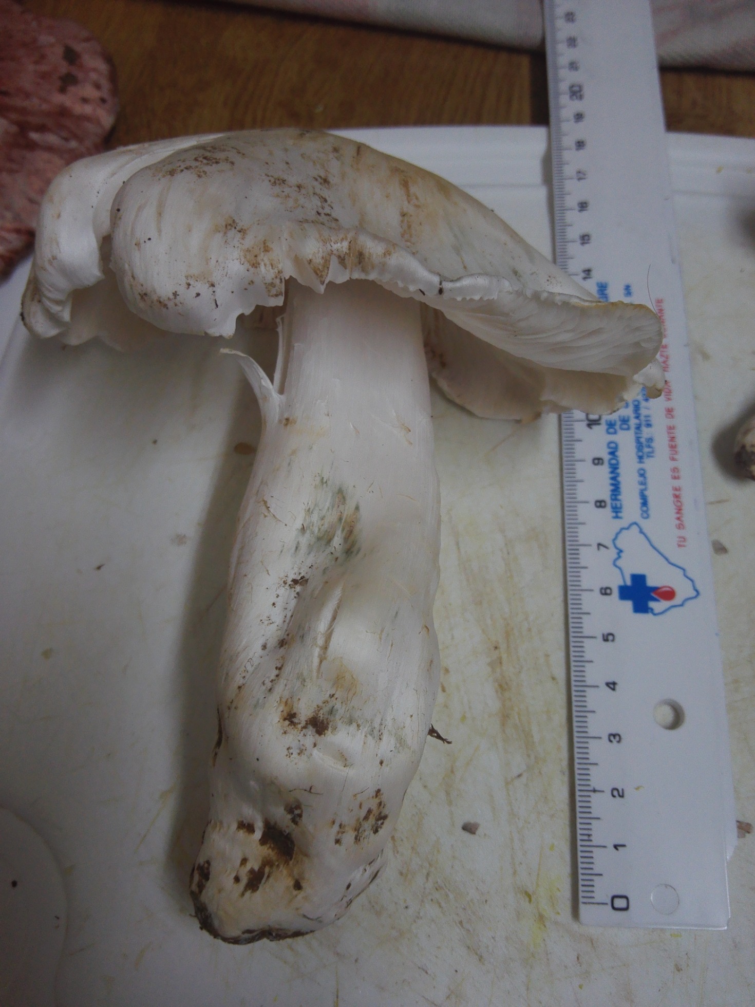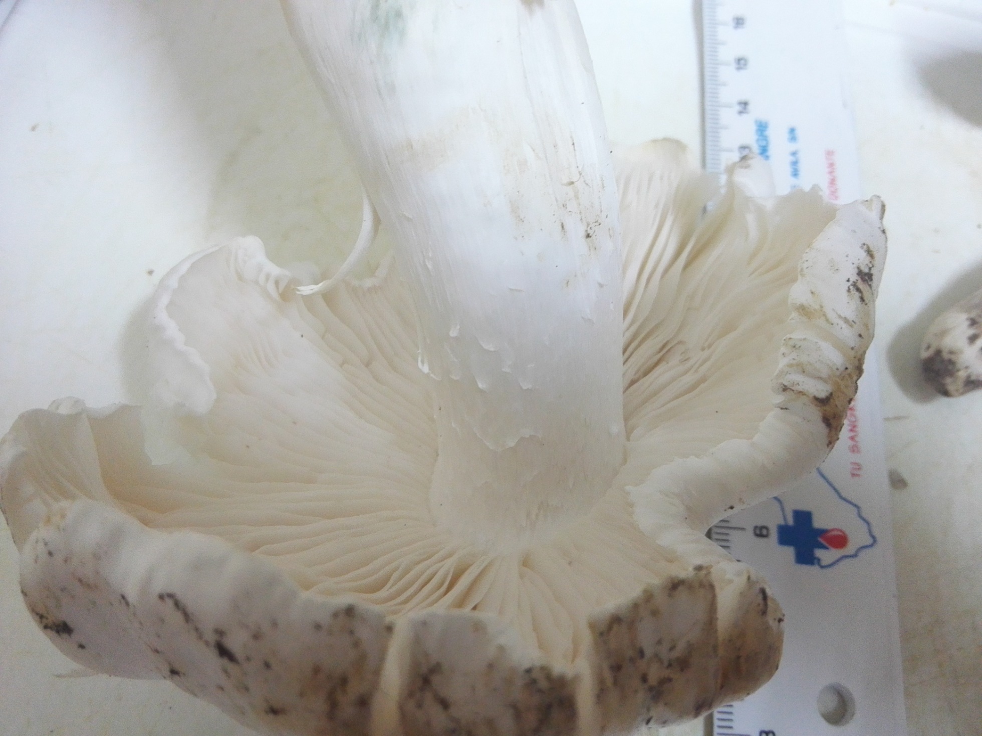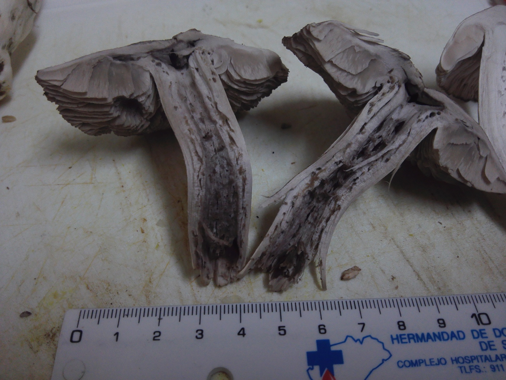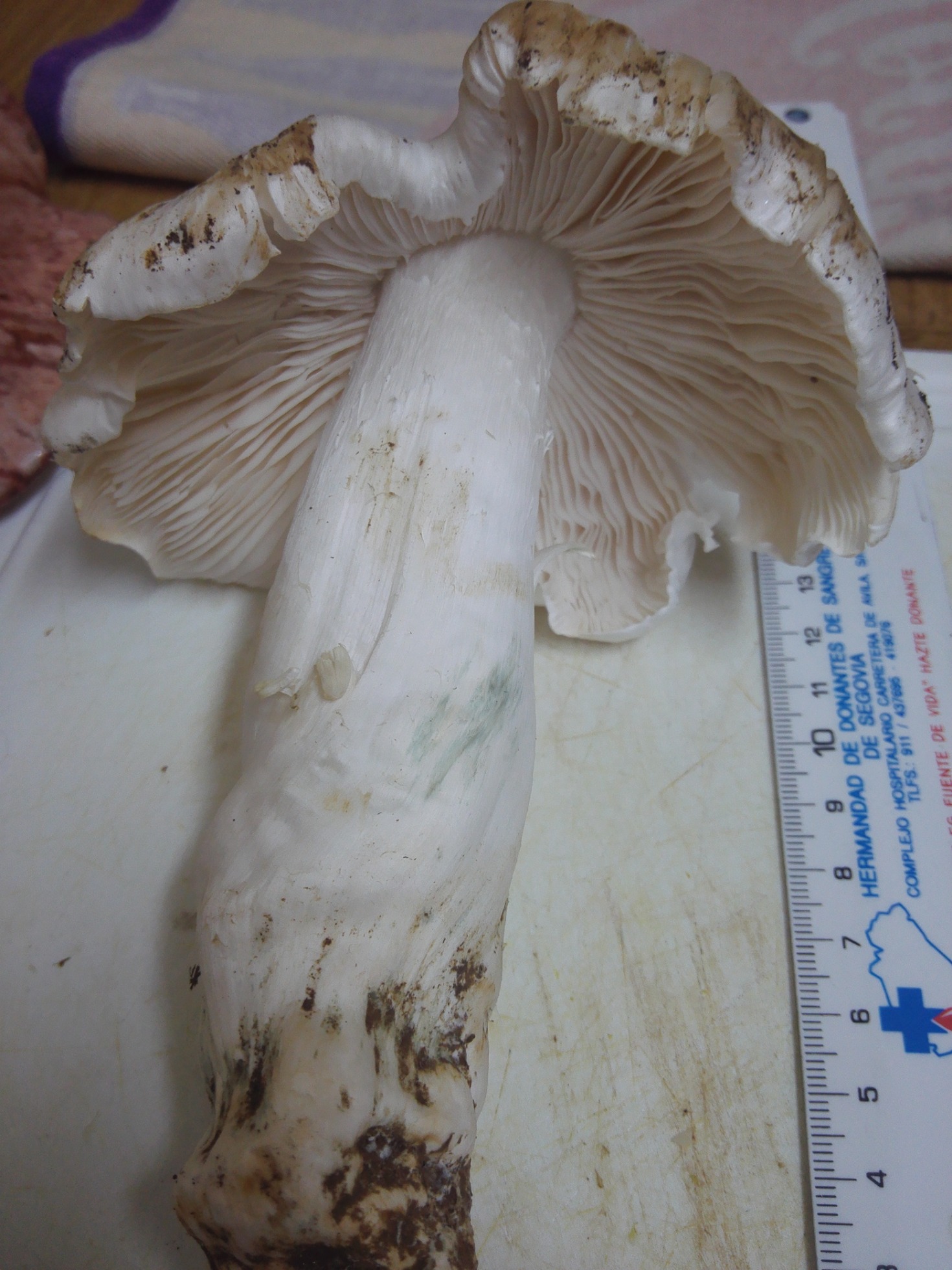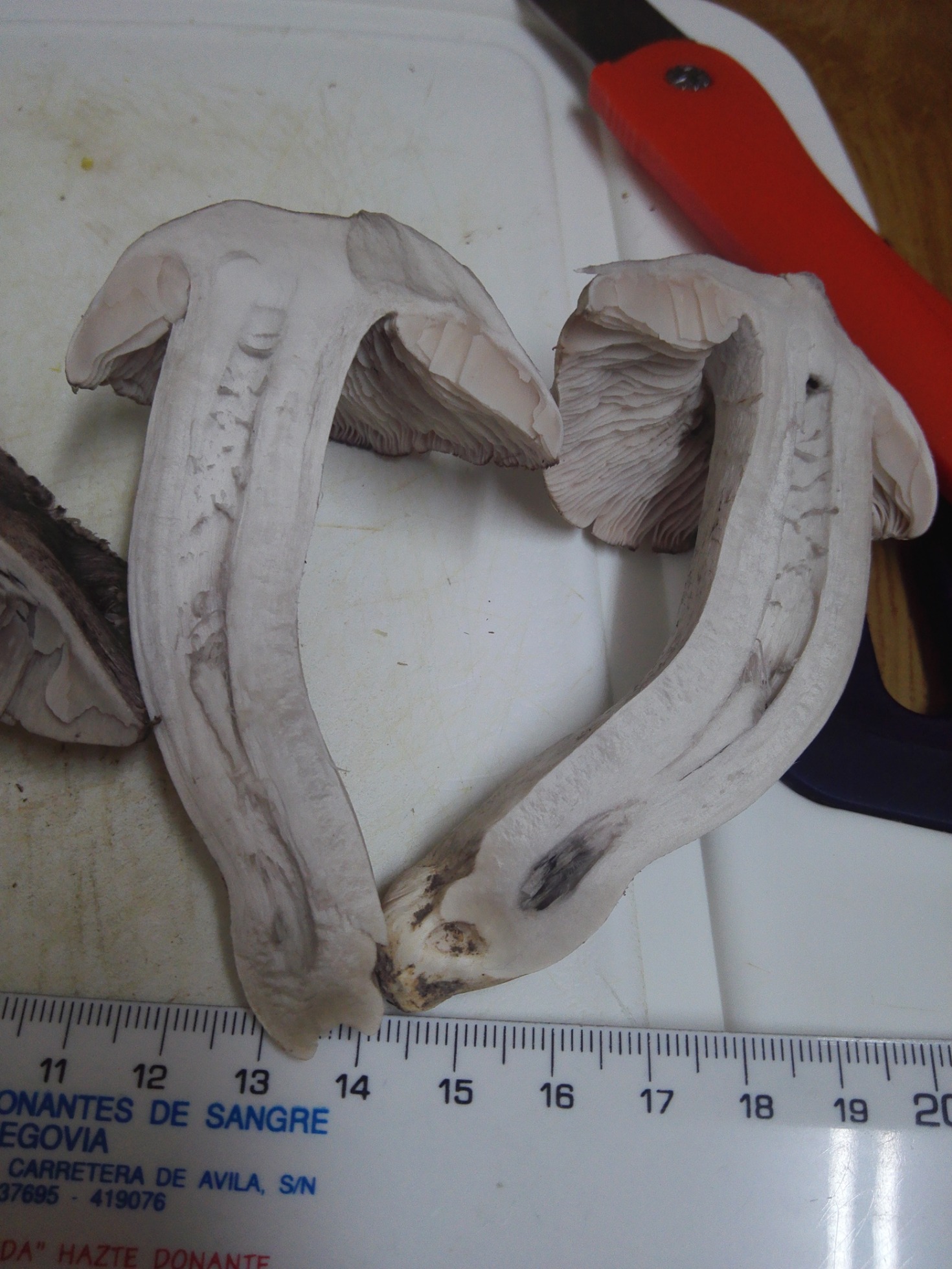 La primera huele a harina ligeramente y tiene para mi los rasgos característicos de los Tricholomas. La miro y me recuerda completamente a la portentosa y otros tricholomas. Recogí una pero había algunas más. En el pie, e incluso en algunos lugares del sombrero presenta unas tonalidades azuladas-verdosas muy sutiles a la vista.