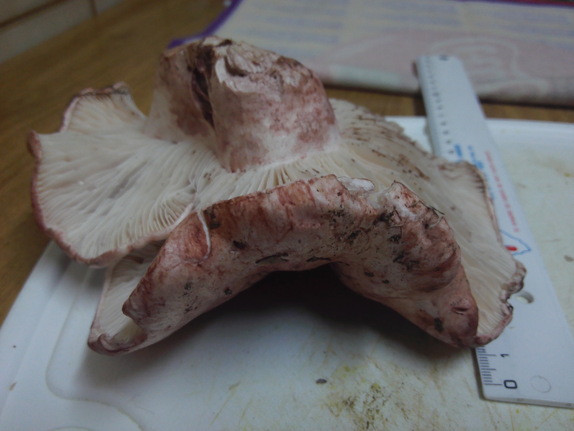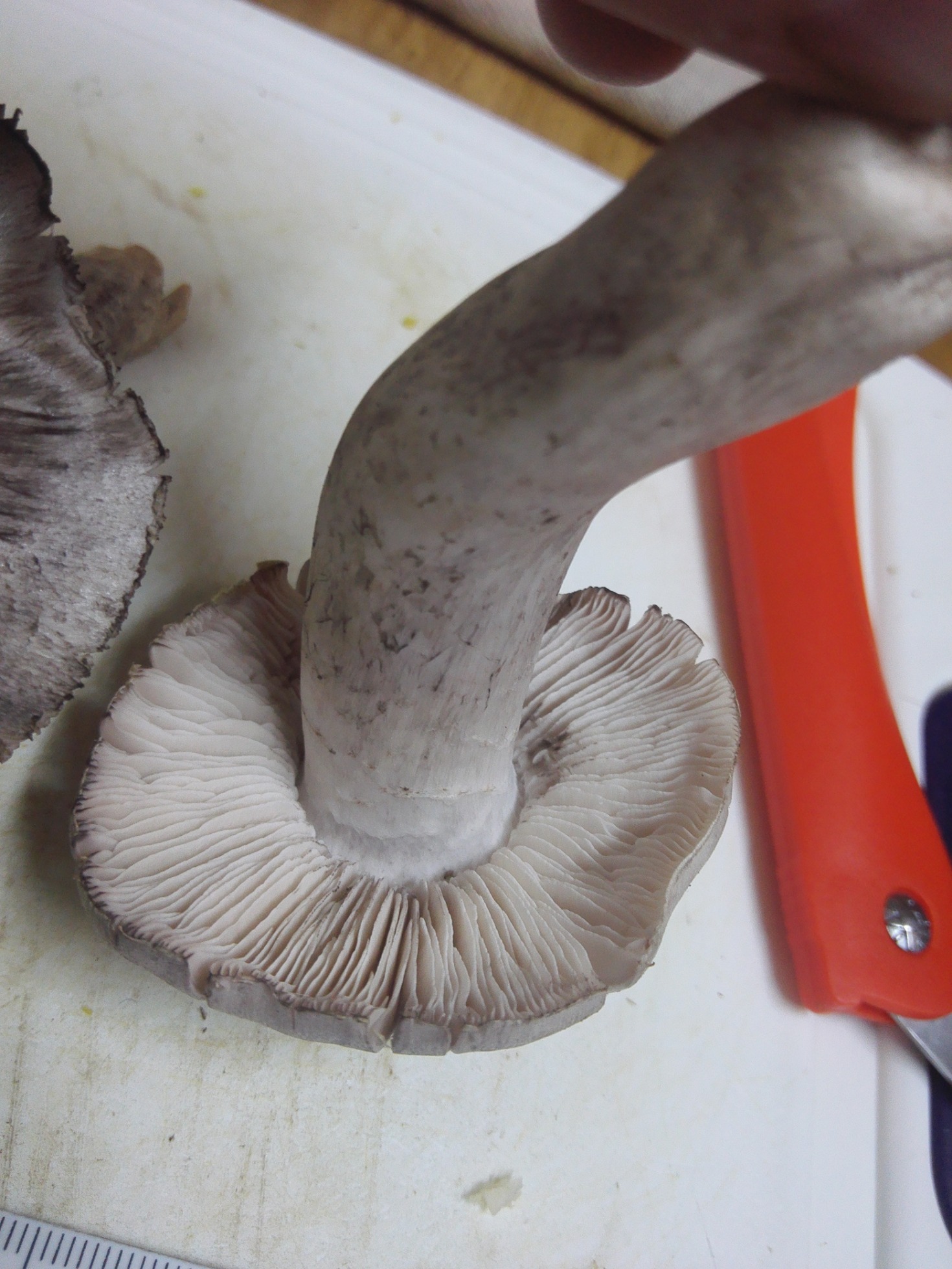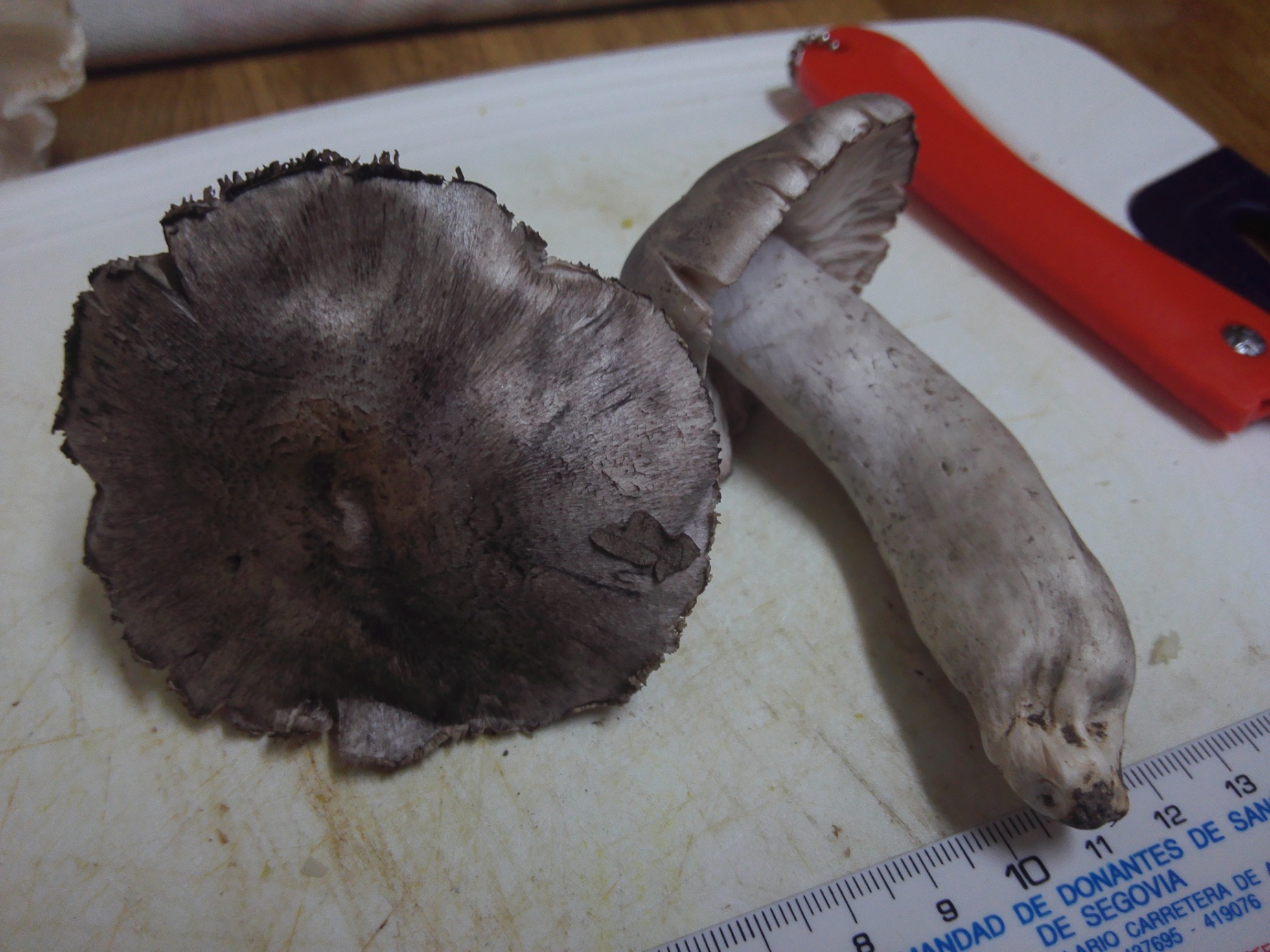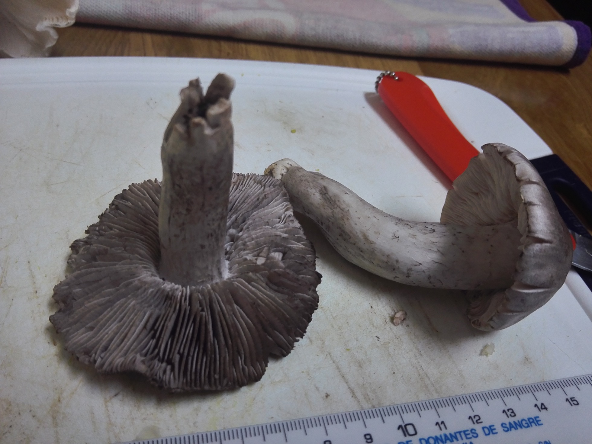 La primera huele a harina ligeramente y tiene para mi los rasgos característicos de los Tricholomas. La miro y me recuerda completamente a la portentosa y otros tricholomas. Recogí una pero había algunas más. En el pie, e incluso en algunos lugares del sombrero presenta unas tonalidades azuladas-verdosas muy sutiles a la vista.