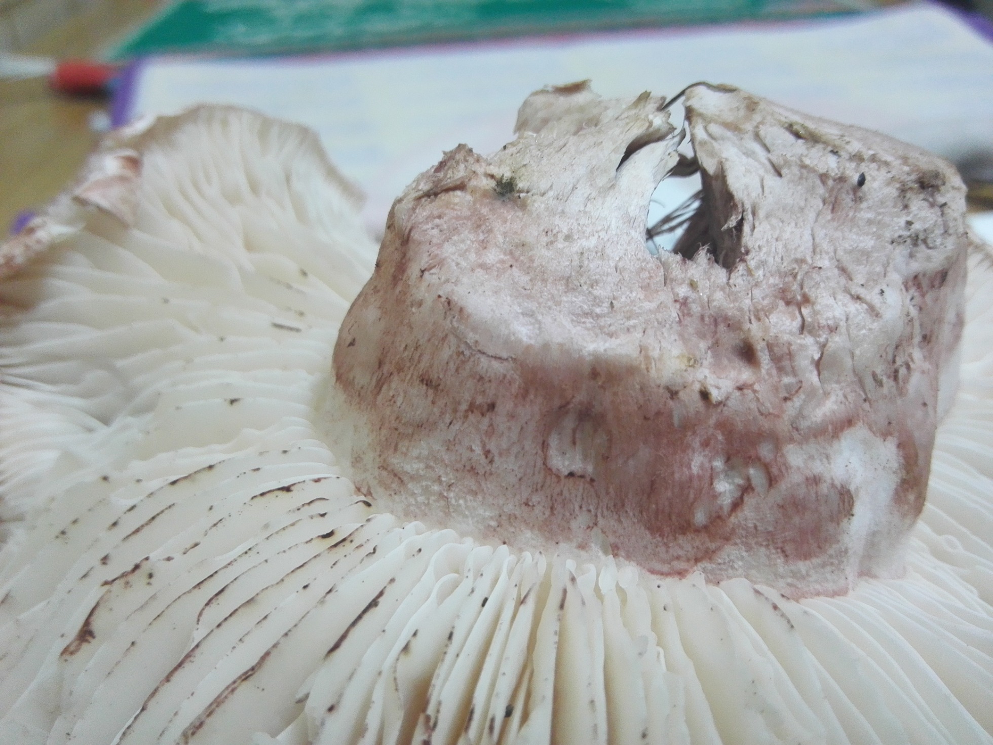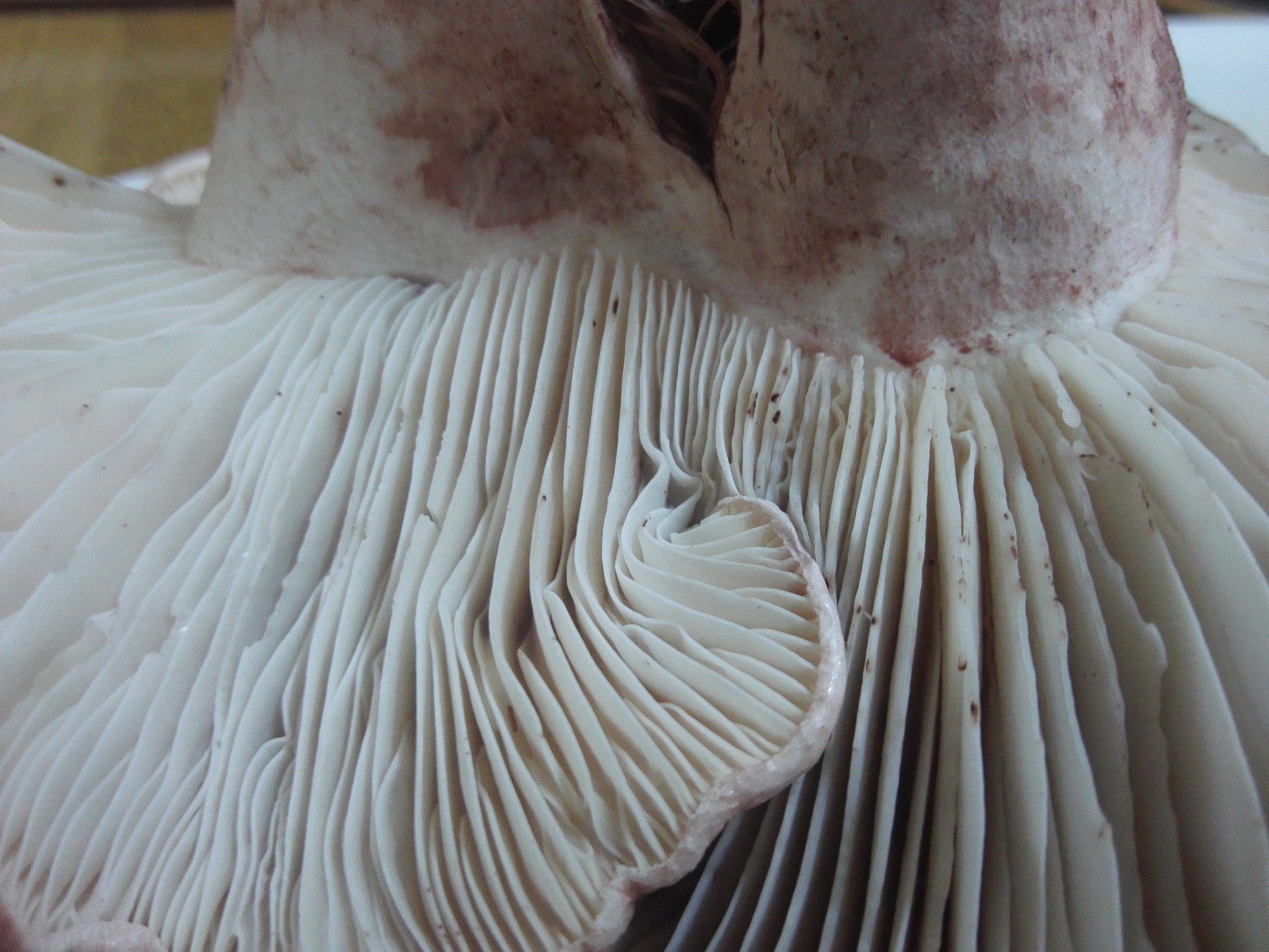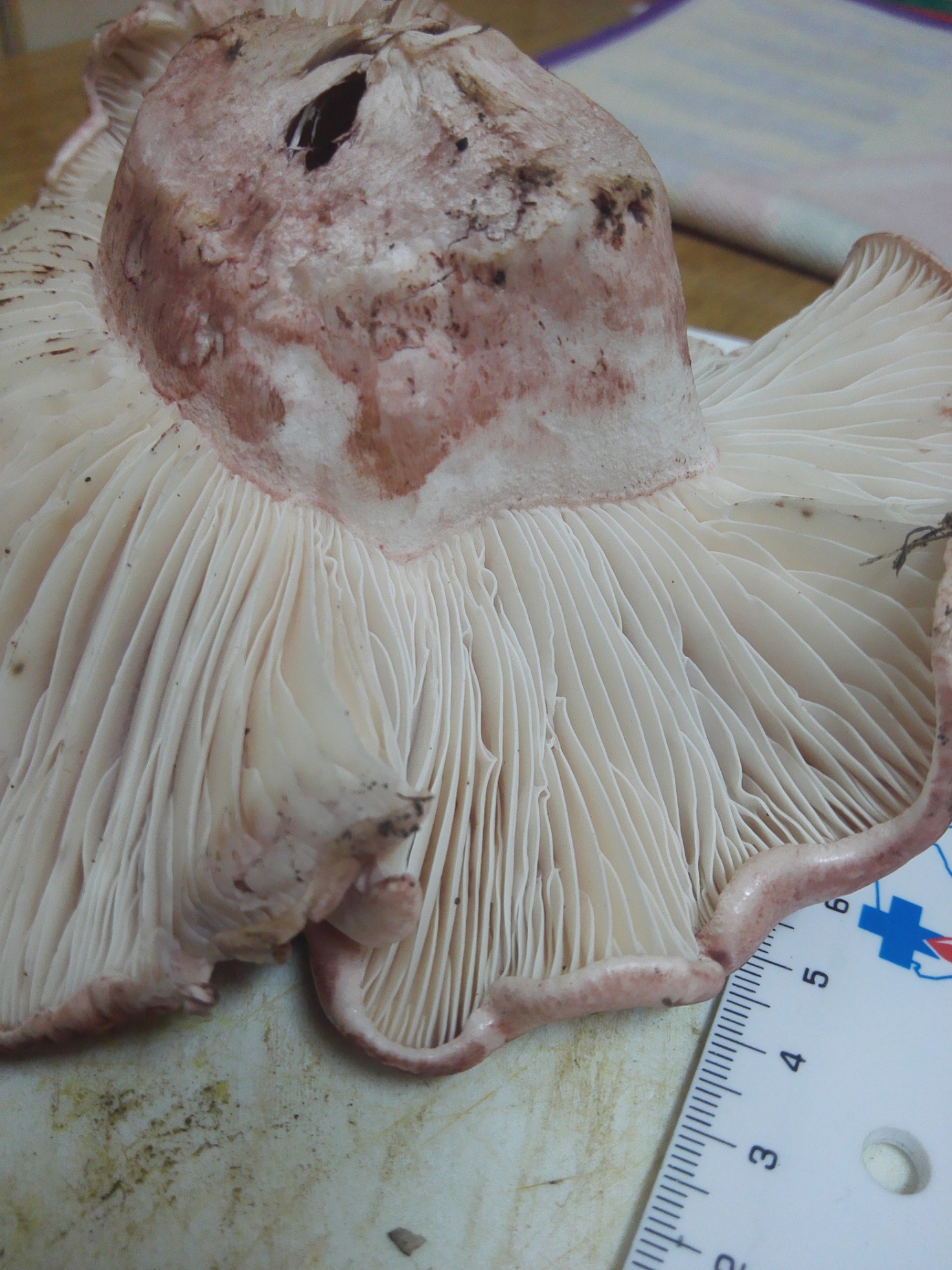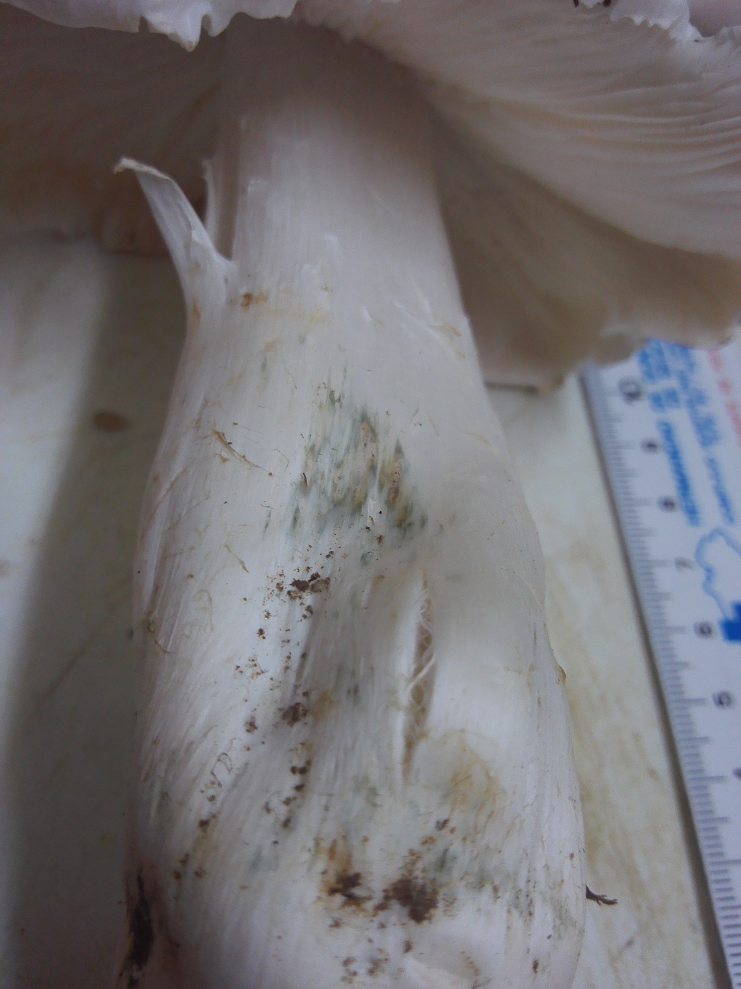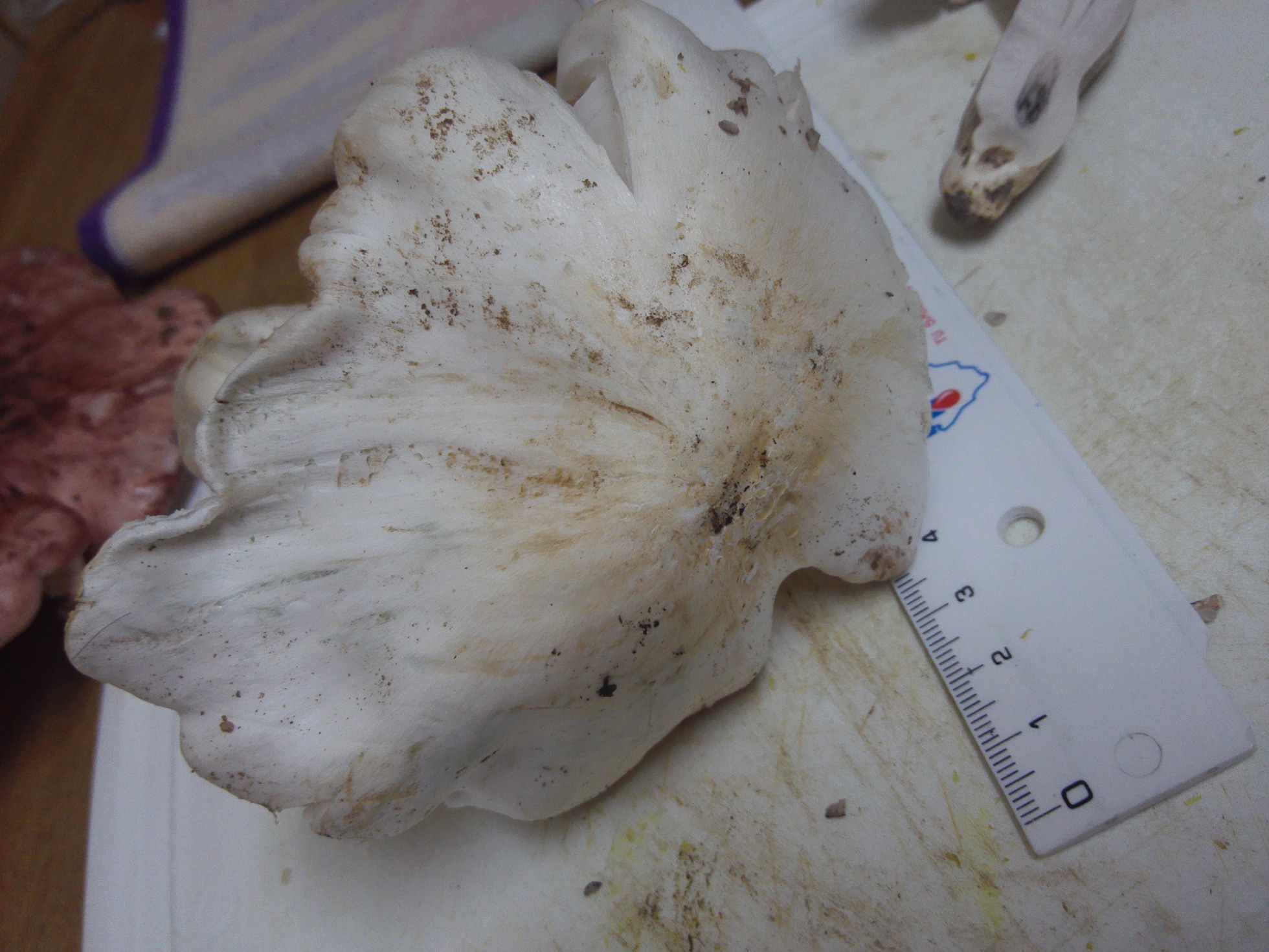 La primera huele a harina ligeramente y tiene para mi los rasgos característicos de los Tricholomas. La miro y me recuerda completamente a la portentosa y otros tricholomas. Recogí una pero había algunas más. En el pie, e incluso en algunos lugares del sombrero presenta unas tonalidades azuladas-verdosas muy sutiles a la vista.