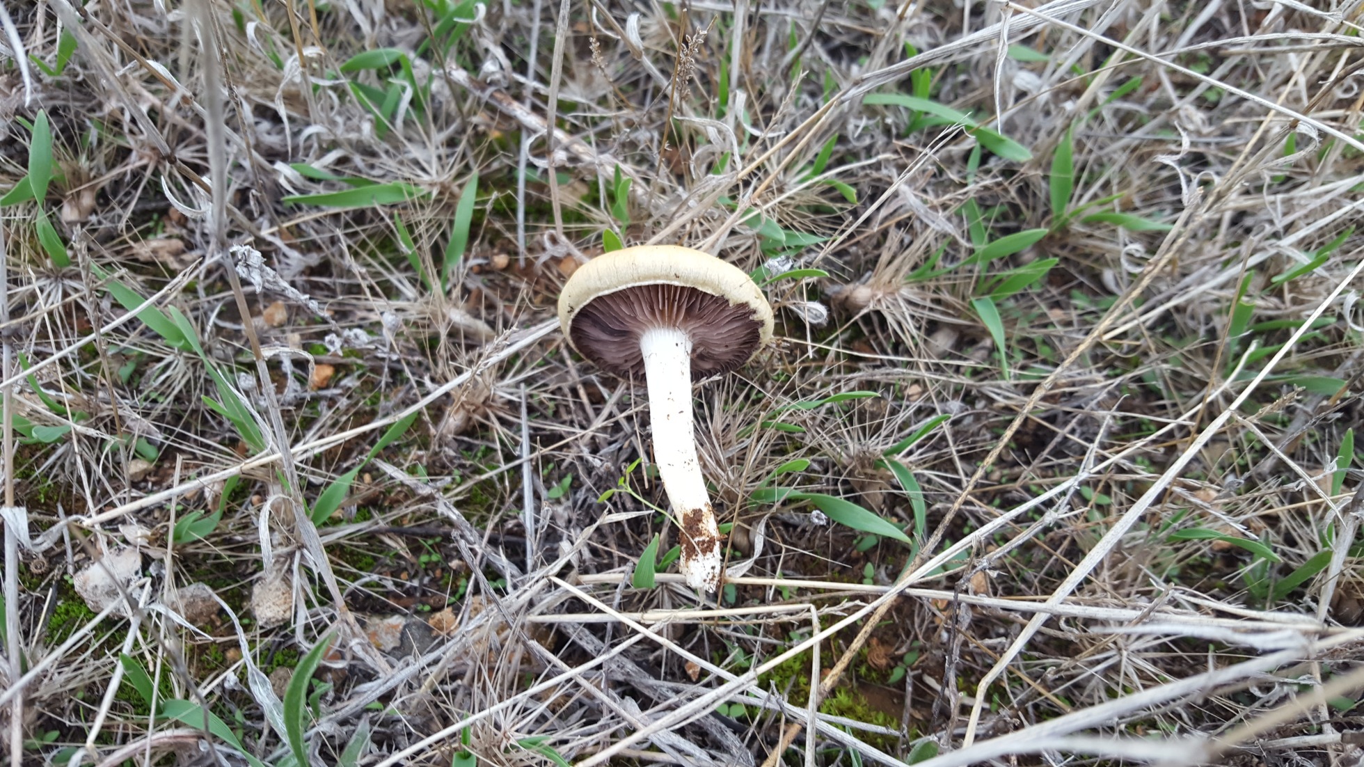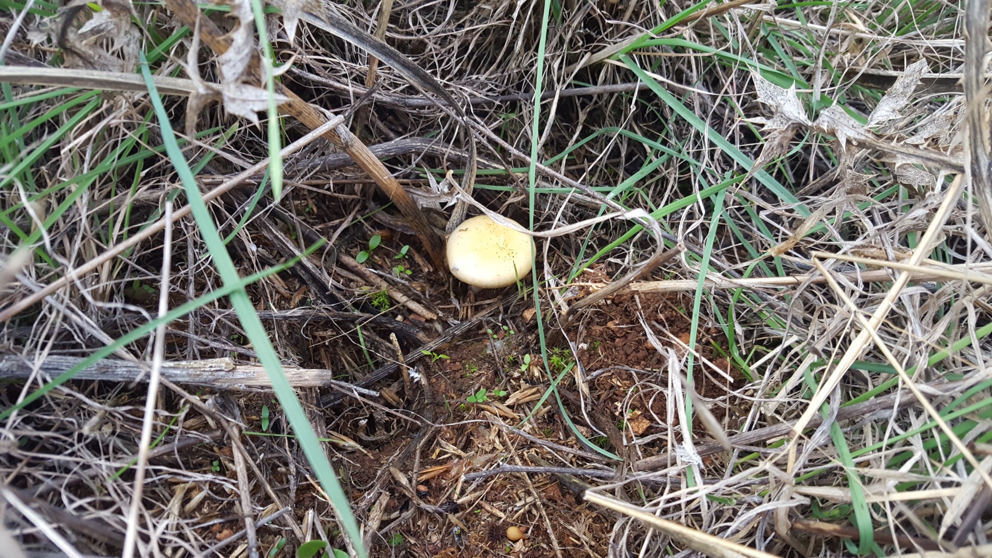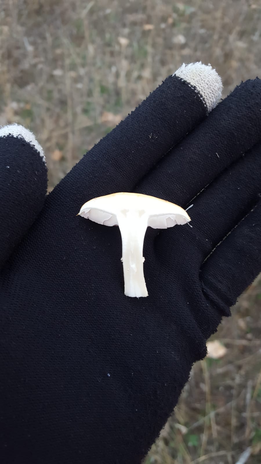 La llevo viendo toda la vida en los sitios donde suele salir la seta de cardo o el campiñón (Agaricus campestris), pero nunca he logrado encontrar la especie en ninguna guía de micología.