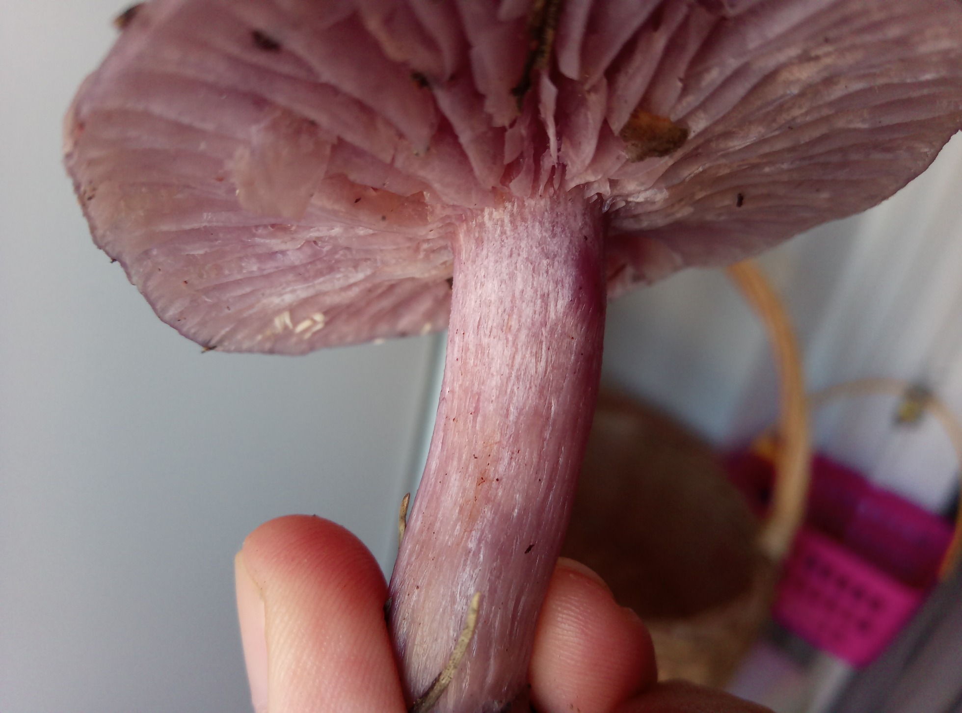 Hola Juancar, ami al menos no me parece Lepista nuda, mas bien pienso que se trate de Lepista sordida.