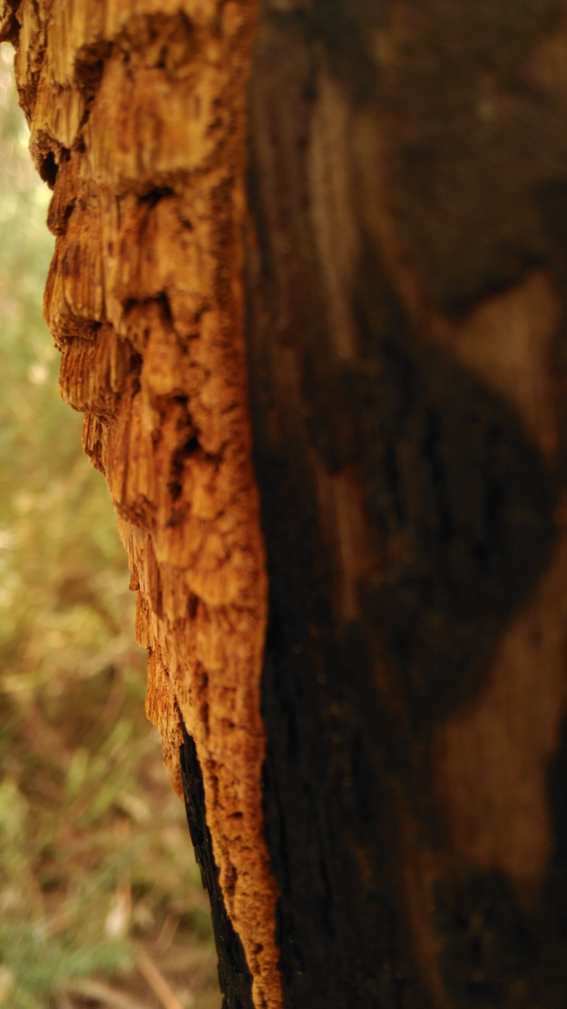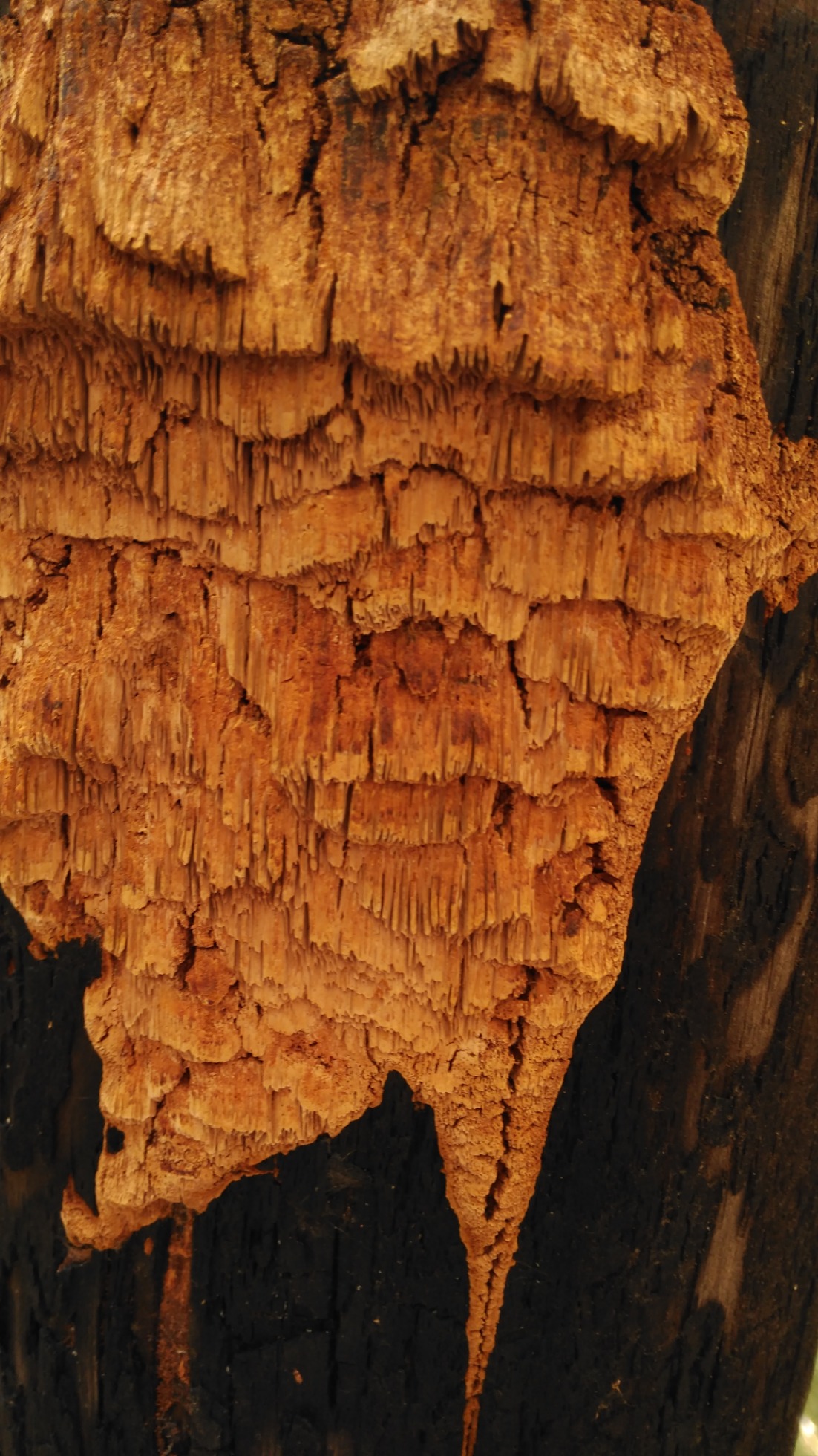 en una estaca de cerramiento tipo poste de electicidad que ha sido quemado parcialmente