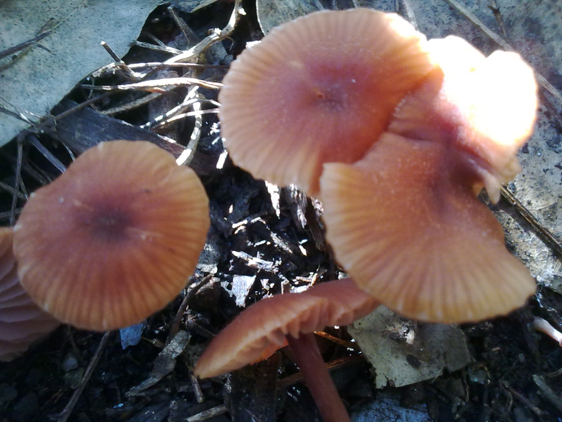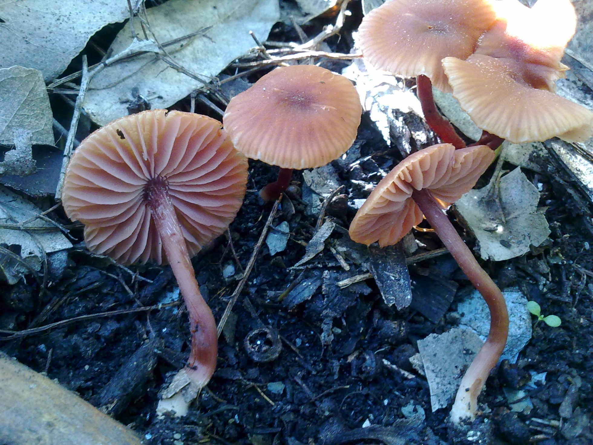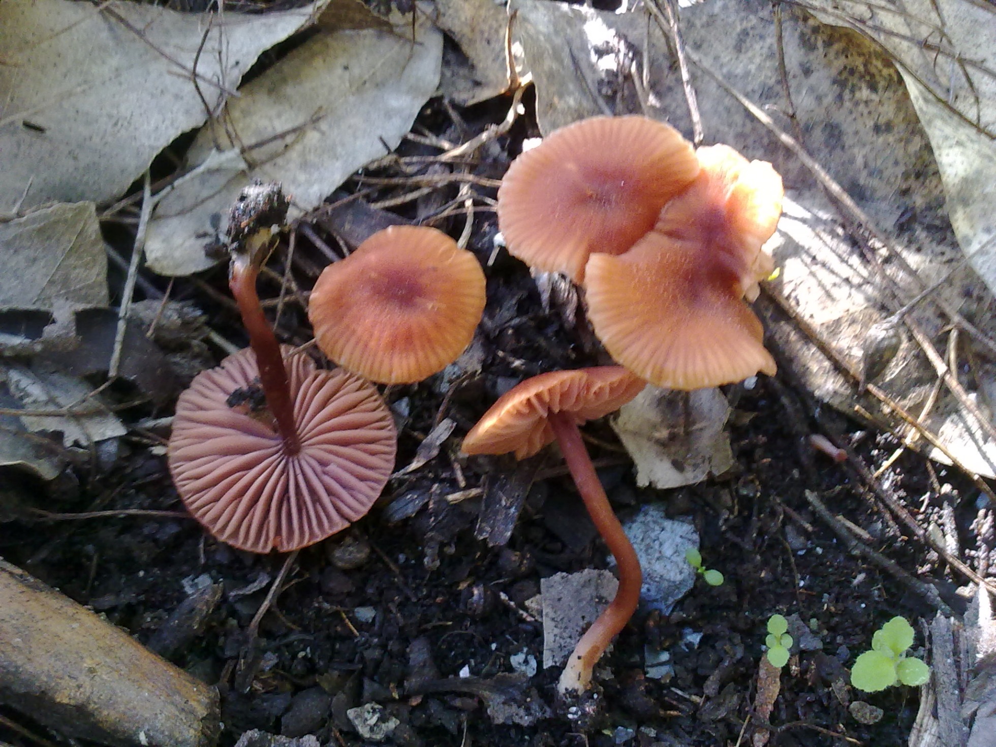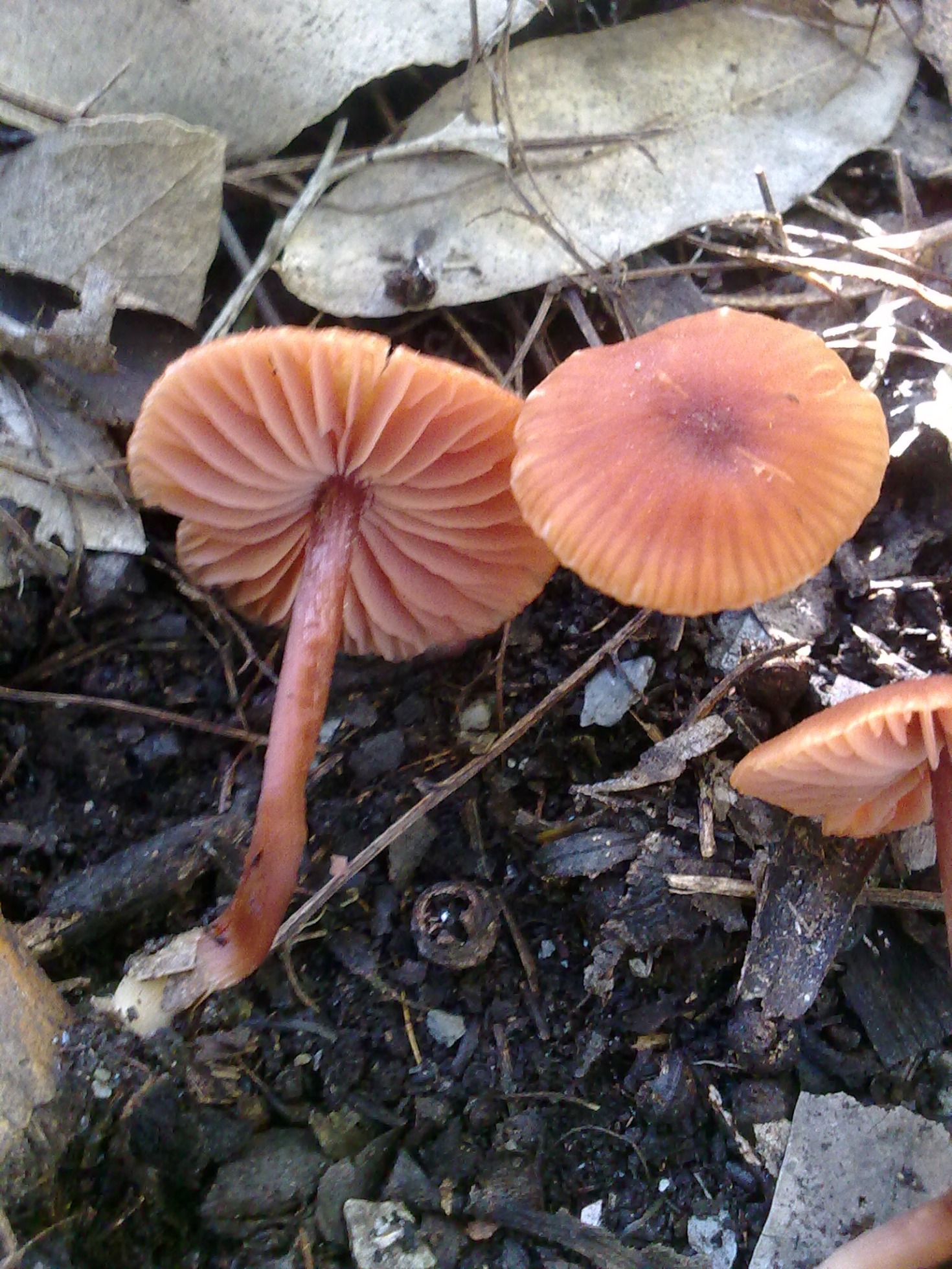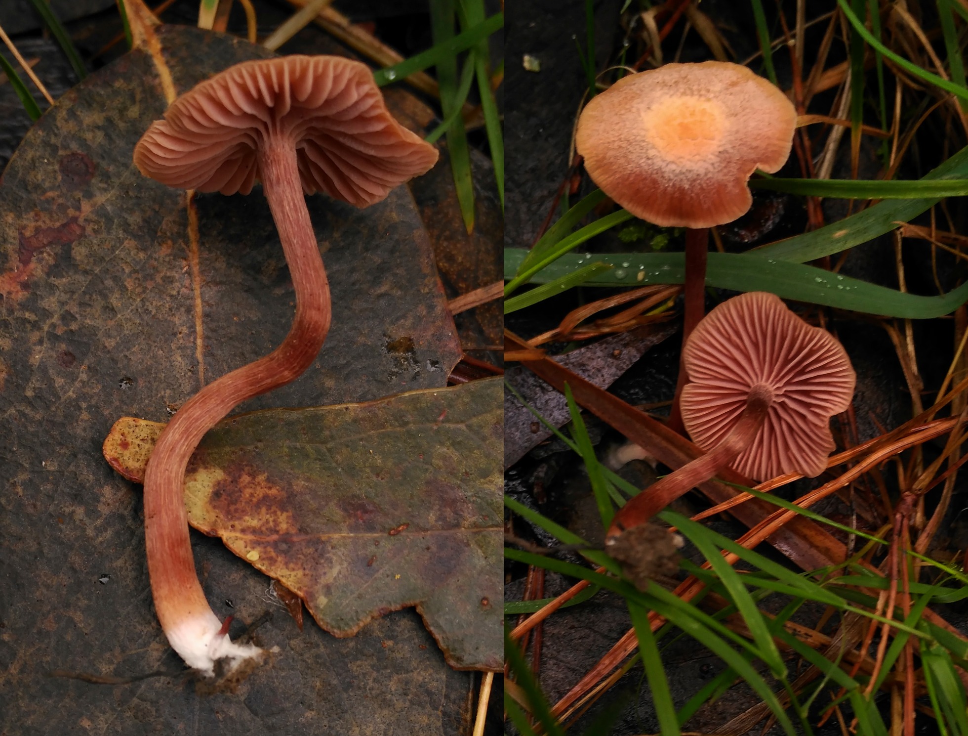 Vamos por partes, la Laccaria lateritia es típica de eucaliptos como nos describes, mas esa base blanca del pié también es típica de esa especie....mas la morfología y tamaño de las esporas....no me ha costado dar con ella.