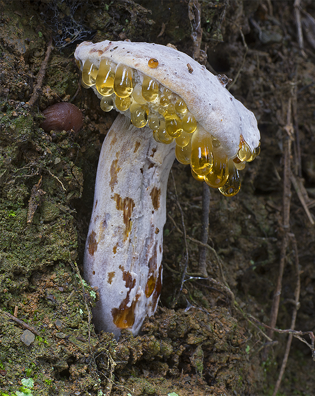 Hola Antonio, las setas parasitadas por Hypomyces chrysospermus a menudo presentan una exudación como la que se ve en tu imagen, dejo un enlace de una seta parasitada, así como un par de imágenes mías de Hypomyces chrysospermus, una de ellas sobre un Paxillus rubicundulus y la otra sobre un Rheubarbariboletus persicolor.