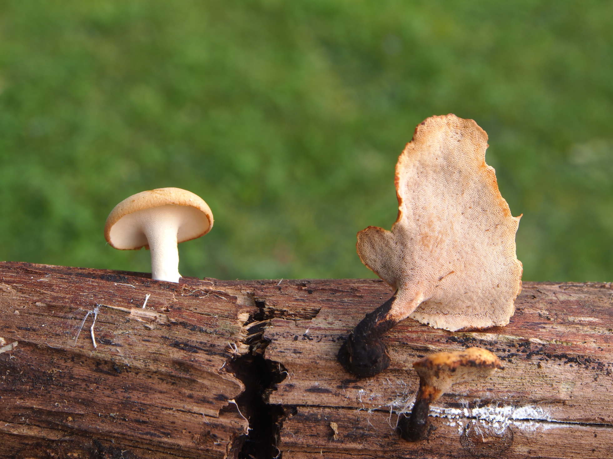 El Polyporus podría tratarse del que comentas, pero el pie blanco del ejemplar de la izquierda me descoloca, pero por Polyporus melanopus o por Polyporus varius va la cosa.
