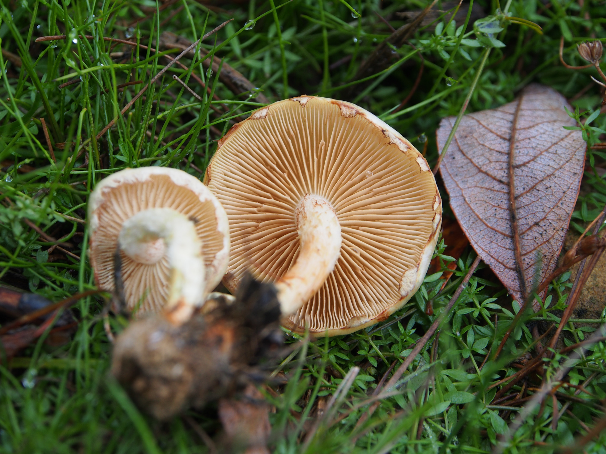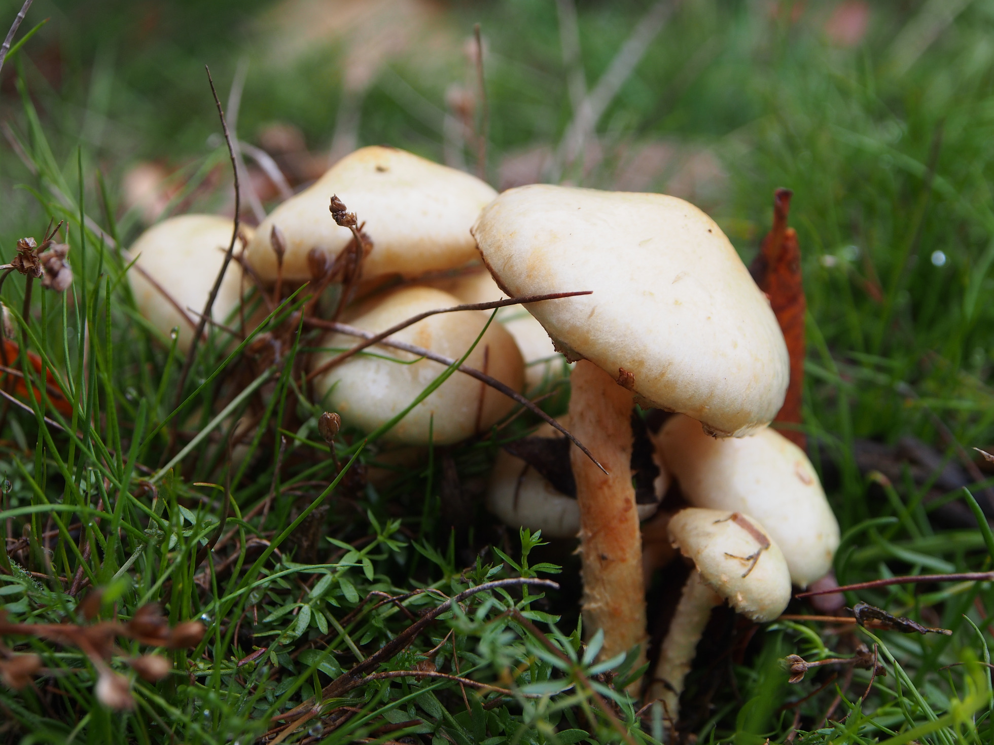 5 - No me parece una Stropharia, las Stropharias presentan generalmente un anillo persistente y las láminas adquieren un color grisáceo típico, la foto está un poco quemada, no veo una imagen clara del sombrero y si presenta o no escamas, quizás un Hebeloma.