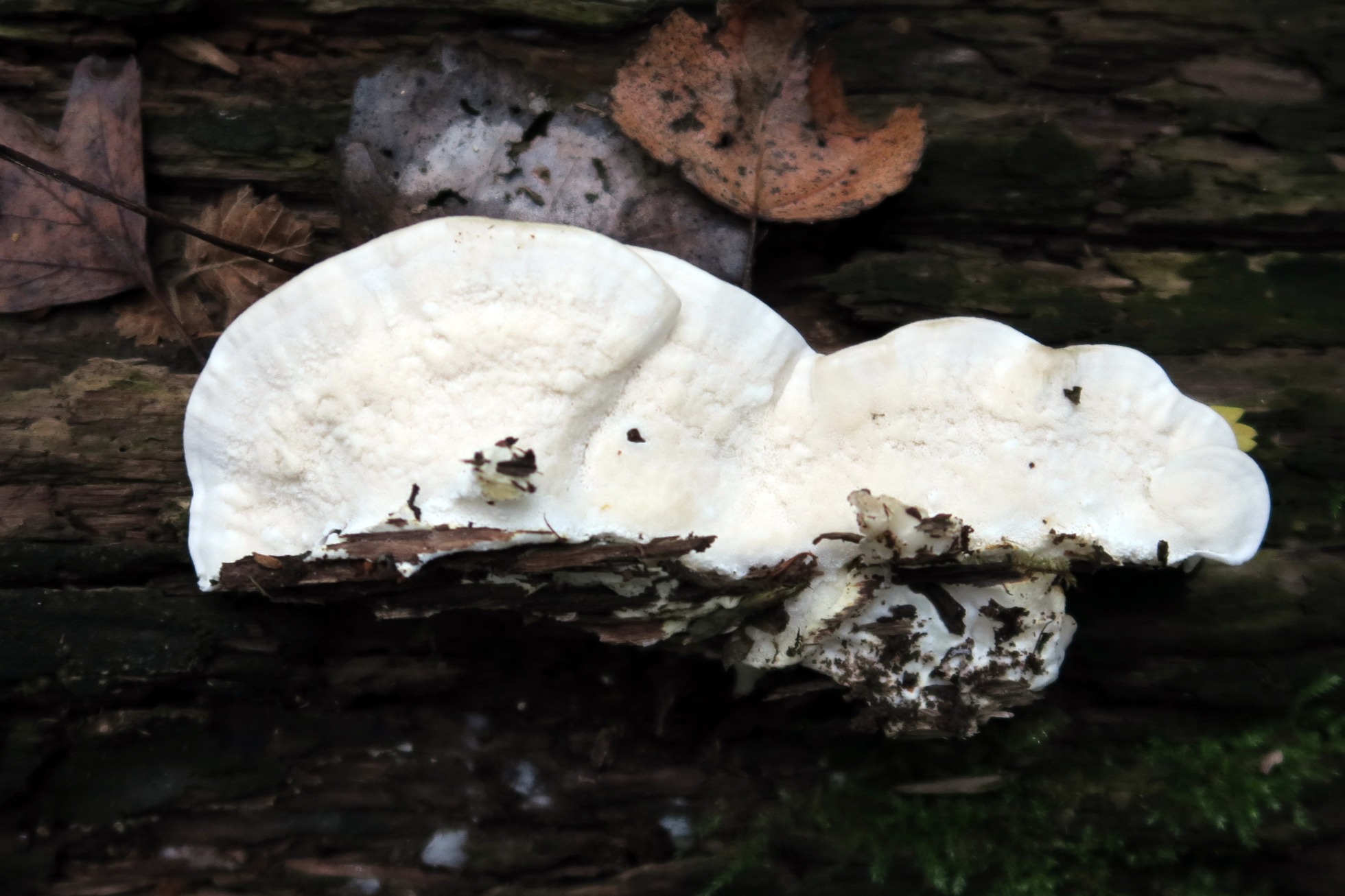 Me da la impresión de que es pelosa y blandita, yo me inclino por Oligoporus (postia) ptychogaster, saludos.
