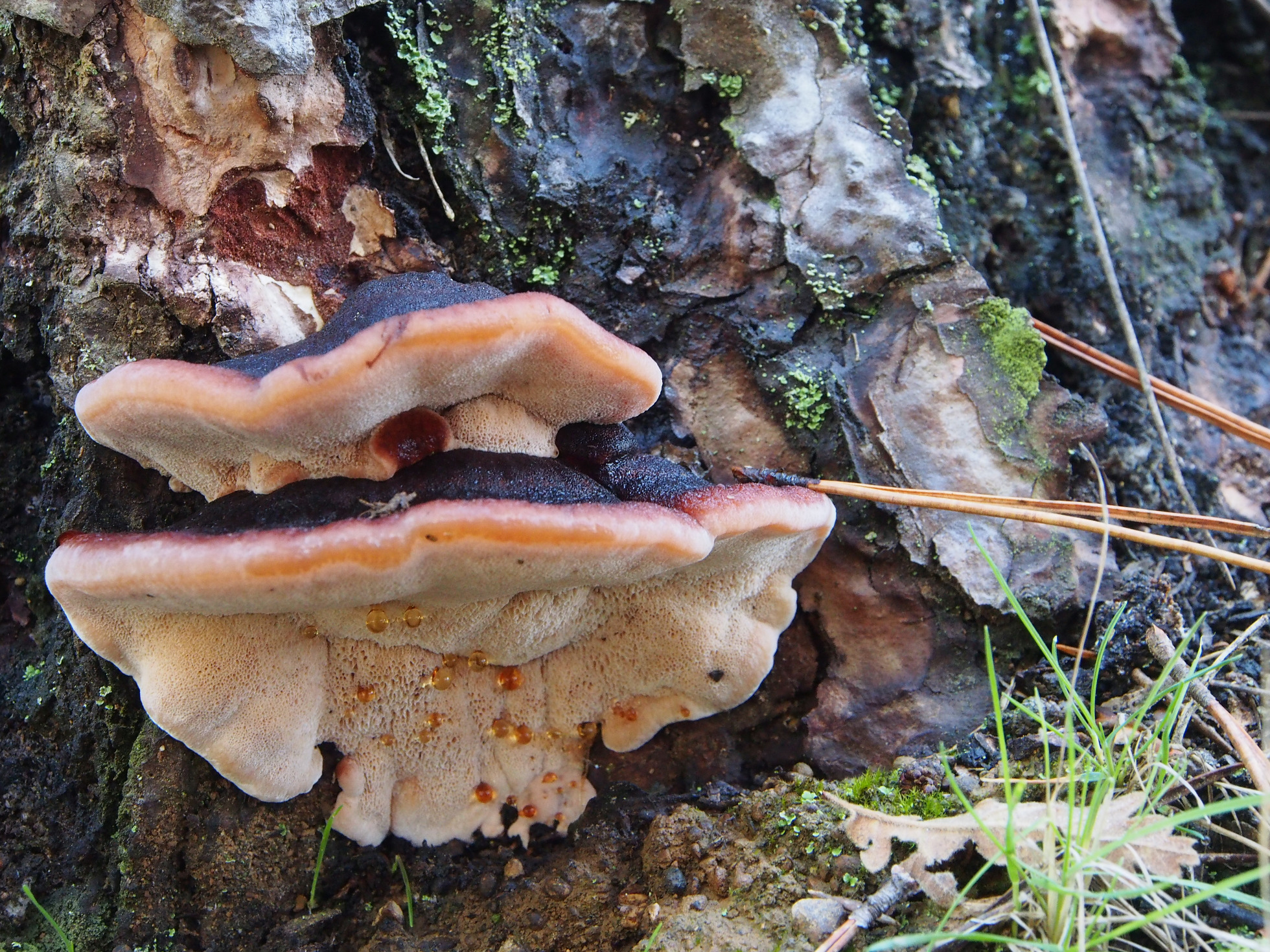 La primera, en un tocon de pino (Pinus nigra, creo), por las gotas de exudado he pensado en un Inonotus, pero no he encontrado alguna especie de este genero que se de en pinos.