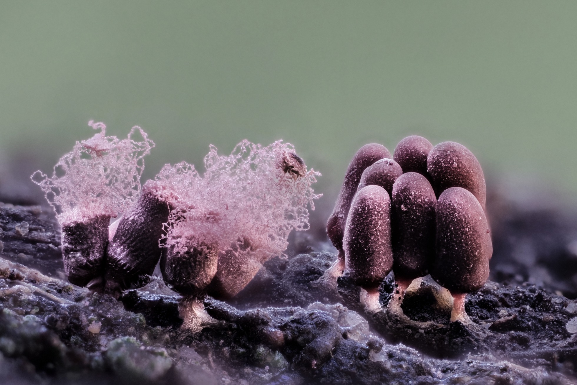 Estoy viendo que ese hongo parasita a todos los mixomicetos, te paso otro cromo en sus dos fases que creo se llama......Arcyria incarnata en la primera imagen, fué una suerte pillarla así juntitas, en la segunda te paso la otra fase que vi de la comatricha nigra, es lo mejor que pude sacar pues hacía aire...