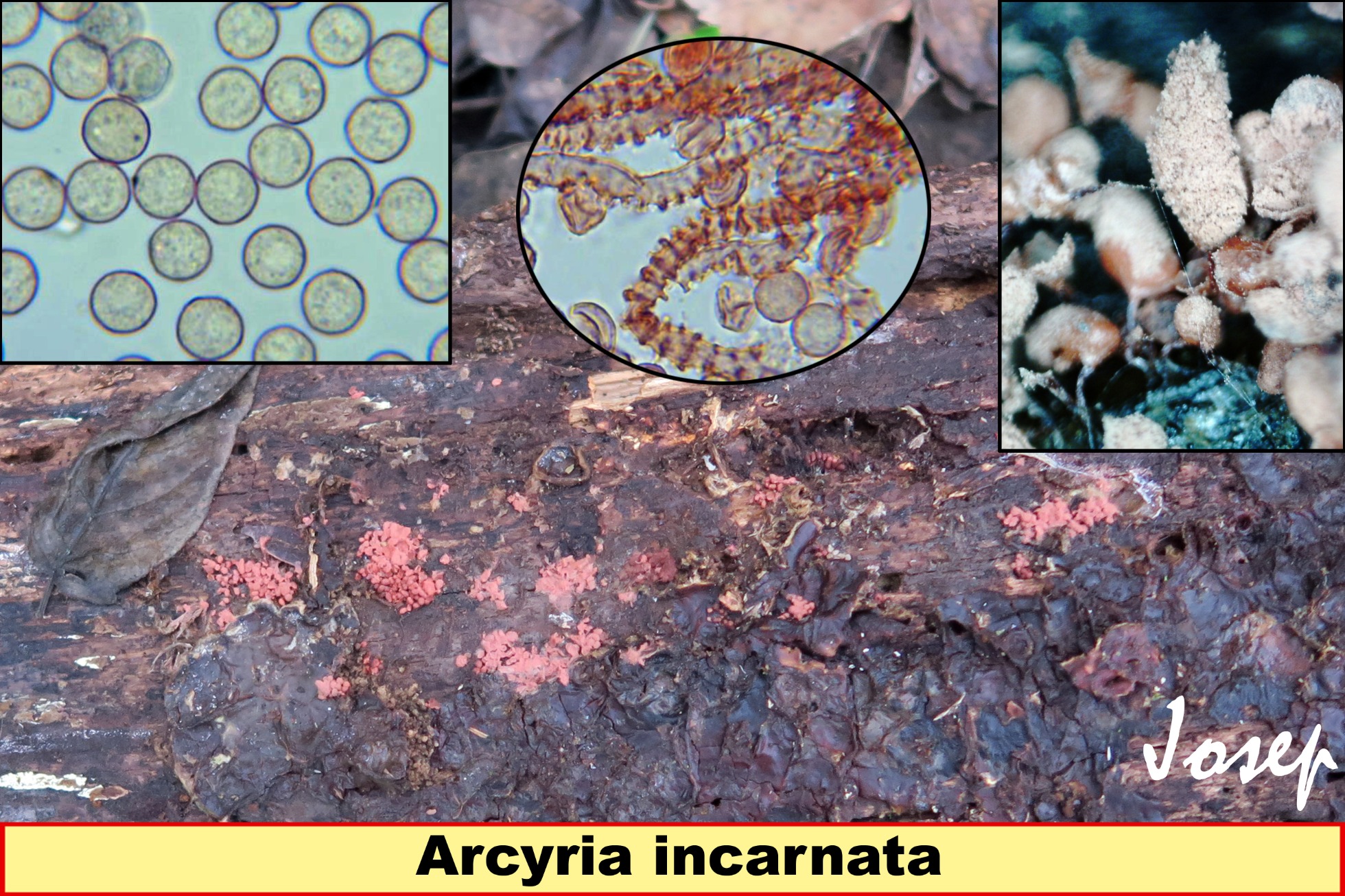 Hola Oscar, la parte deshilachada de lo que denominas Arcyria incarnata, no sería un hongo, sinó restos del capilicio después de la liberación de las esporas, en el caso de la Comatricha si que parece un parásito. Veo que todas las imágenes de Mixomicetos que nos muestras tienen un tono violáceo, ¿quizás por el efecto de la cámara?, la Arcyria incarnata presenta generalmente un tono rosado, te dejo unas imágenes de Arcyria mías parecidas a la Arcyria incarnata. Las Arcyrias sin micro son imposibles de identificar.