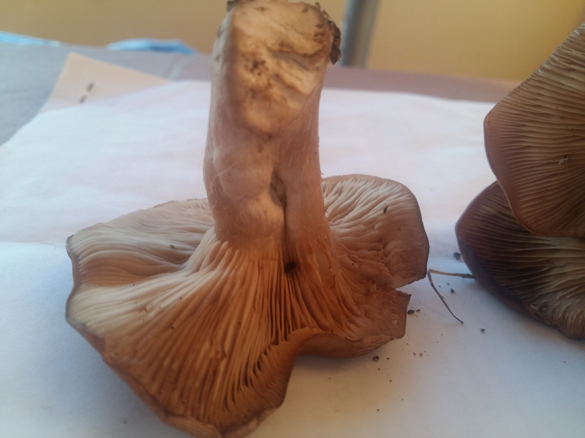Láminas decurrentes, aunque no mucho. La cutícula no es viscosa y se rompe con facilidad la carne del sombrero.