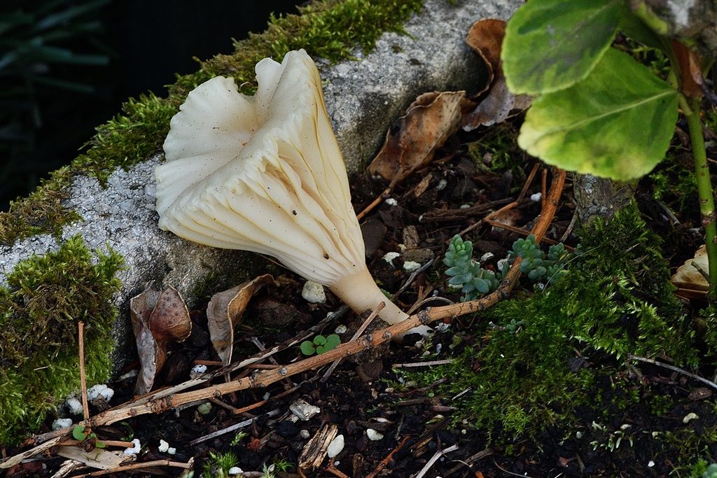 Sombrero: 3-4 cm. De joven convexo y doblado hacia abajo en los bordes. De adulto totalmente cóncavo con un agujero que le llega hasta el pie. De color blanco crema. Carnoso como goma.