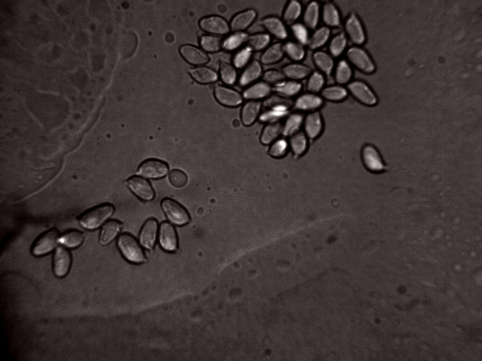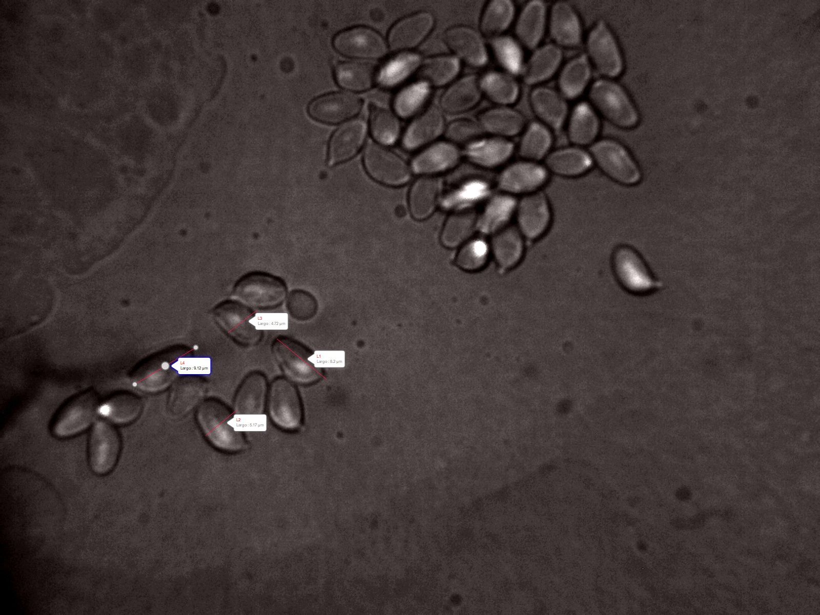 Hola Josep. Hoy por primera vez en mi vida he aplicado el reactivo Mezler a una esporada de la que creemos que es la Cuphophyllus Virgineus. La verdad es que estoy muy satisfecho, porque además, también he aplicado una gota de aceite de inmersión sobre el cubre objetos para ver las esporas con el objetivo 100x. Gracias por todos vuestros consejos porque me han venido muy muy bien. Ahora vamos a ver si te aporto las fotos de las esporas y podemos centrar un poco mas la identificación de esta especie. Te paso 3 fotografías: La primera con el objetivo 40x y aplicada el reactivo Mezler. Yo no veo ninguna coloración en las esporas por lo que entiendo que el color de la esporada es no amiloide (estoy en lo cierto?), esa característica coincide con la descripción de la Cuphophyllus Virgineus. La segunda foto son esas mismas esporas pero vistas con el objetivo de 100x a través de la gota de aceite de inmersión. No se muy bien lo que significa hialinas (¿transparentes?), es otra característica de las esporas de la C.V., tu crees que las esporas que te muestro tienen esa característica?. Por ultimo te anexo una foto igual que la anterior pero con las medidas de las esporas.