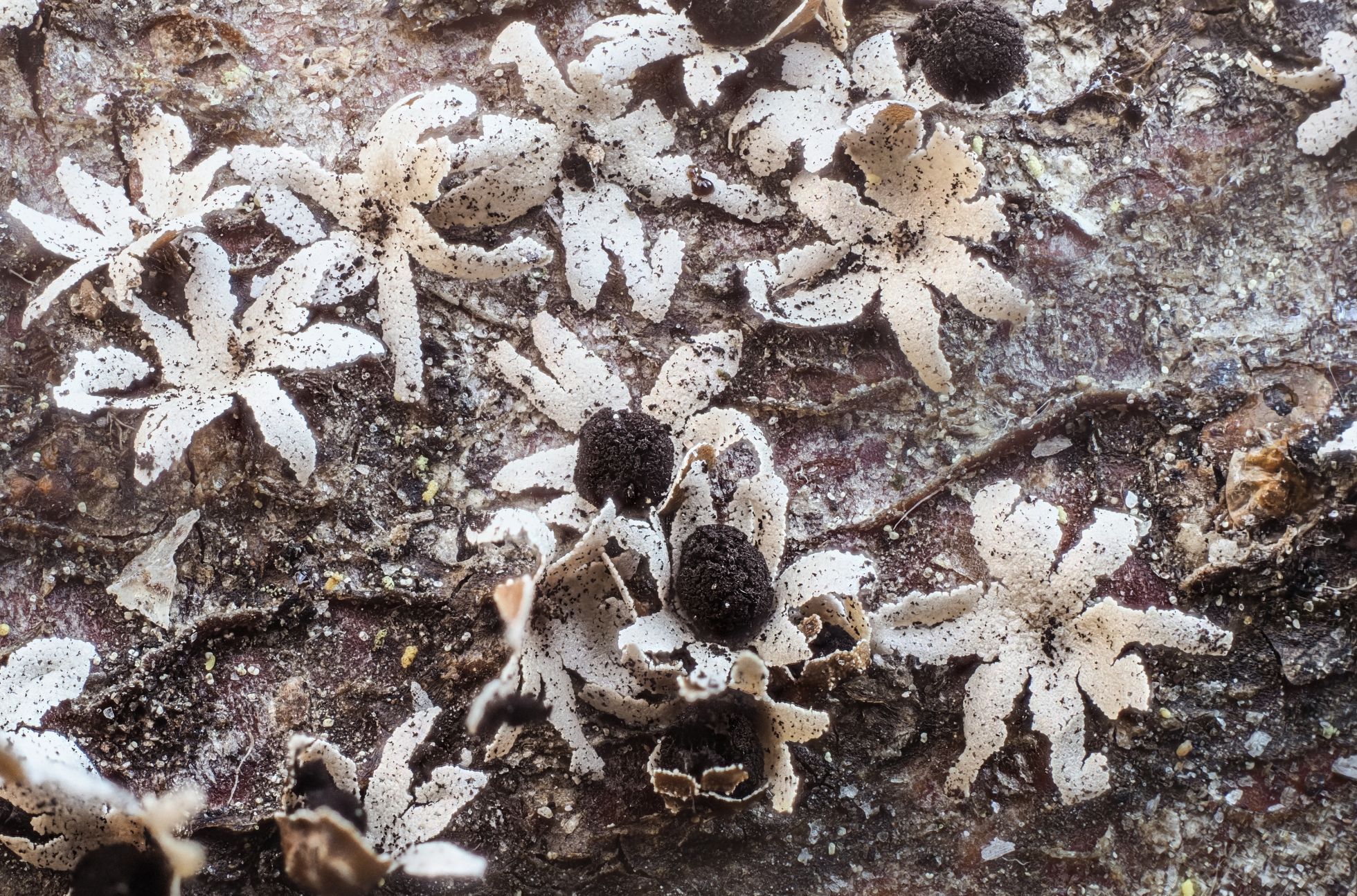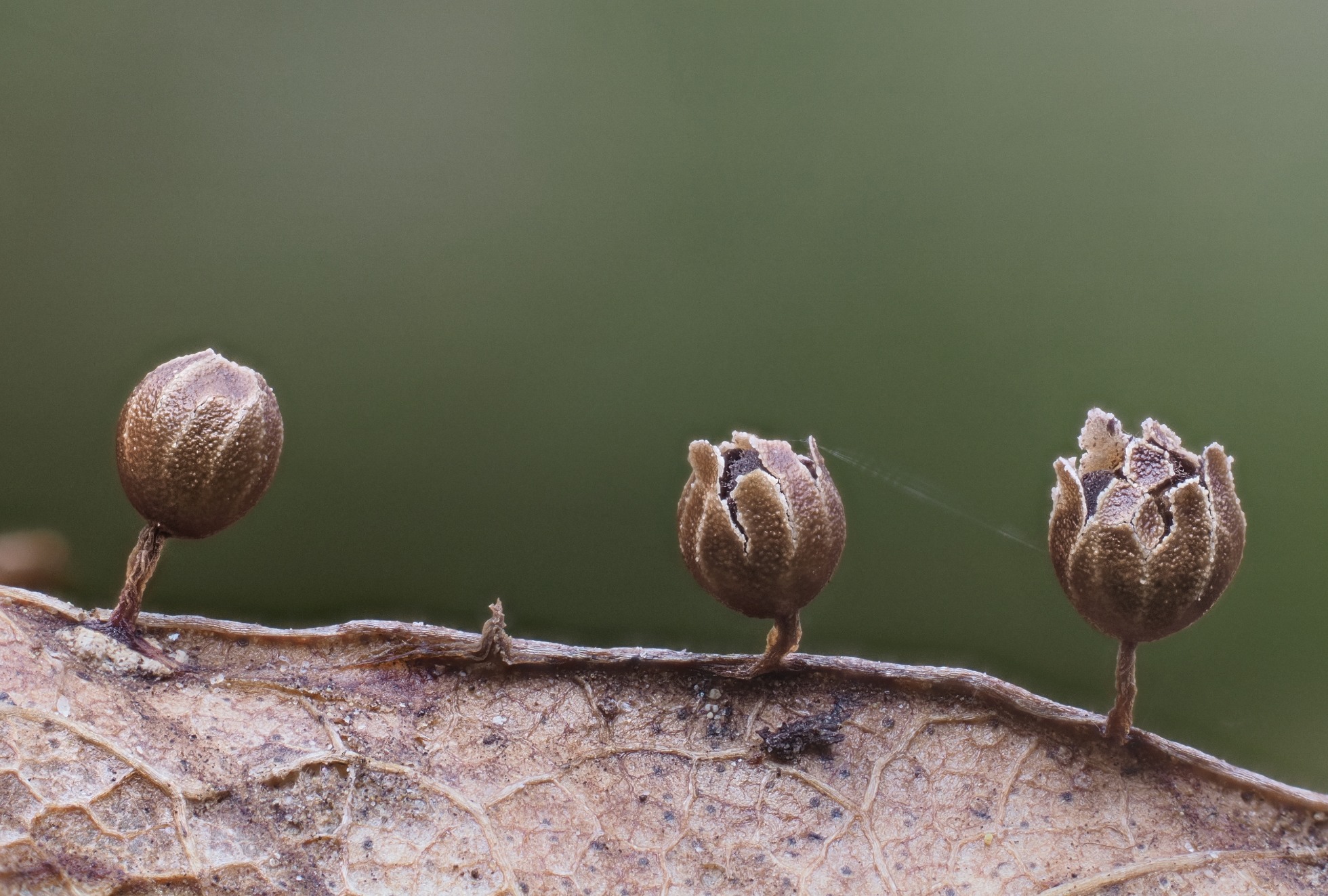 Hola Oscar, siento el no poder ayudarte con esta, aunque se me antoja muy interesante, con este peridio tan liso solo puedo pensar en Craterium o hasta un Lepidoderma, pero la zona de dehiscencia en ambos casos no me cuadra en absoluto.