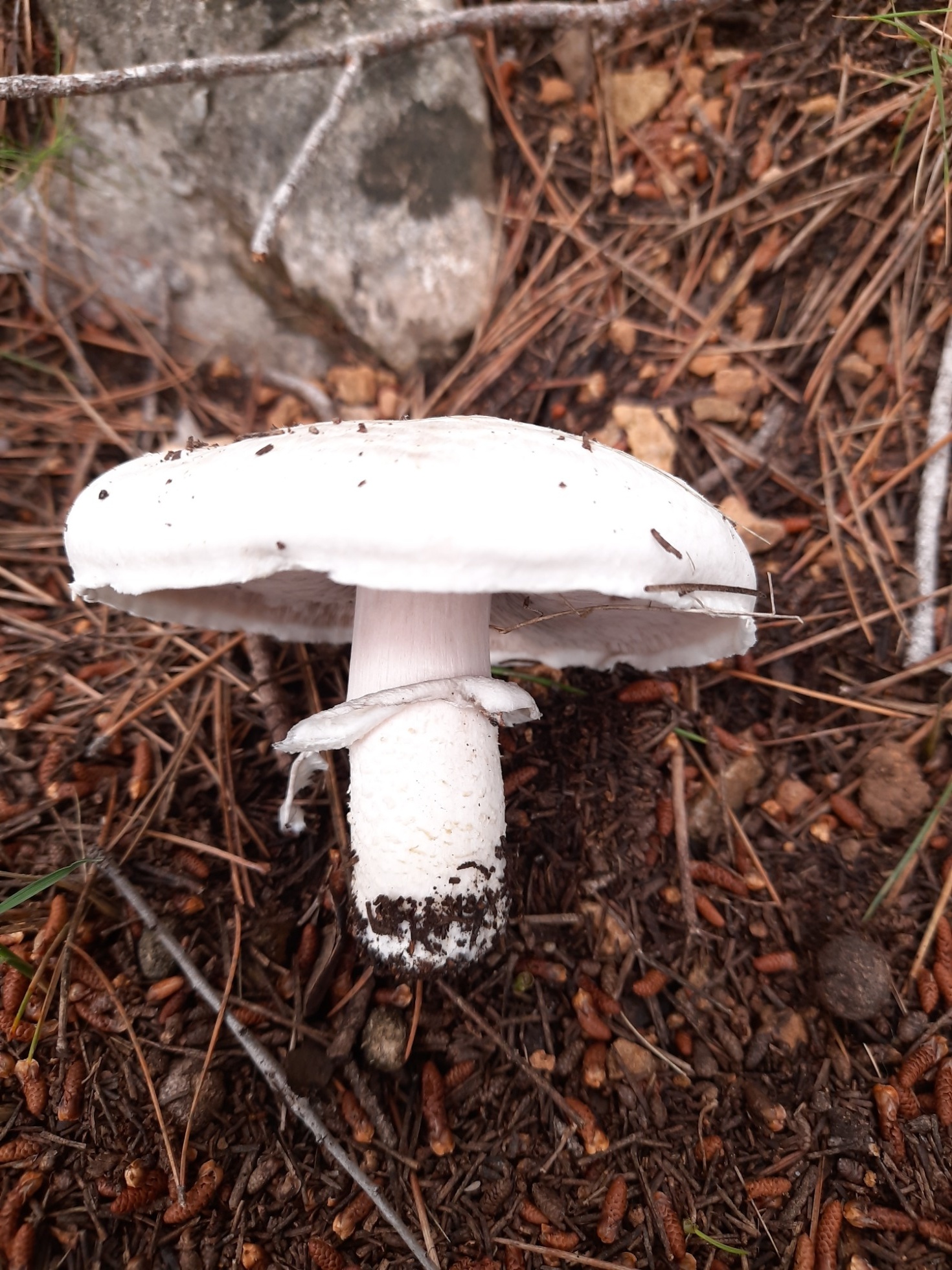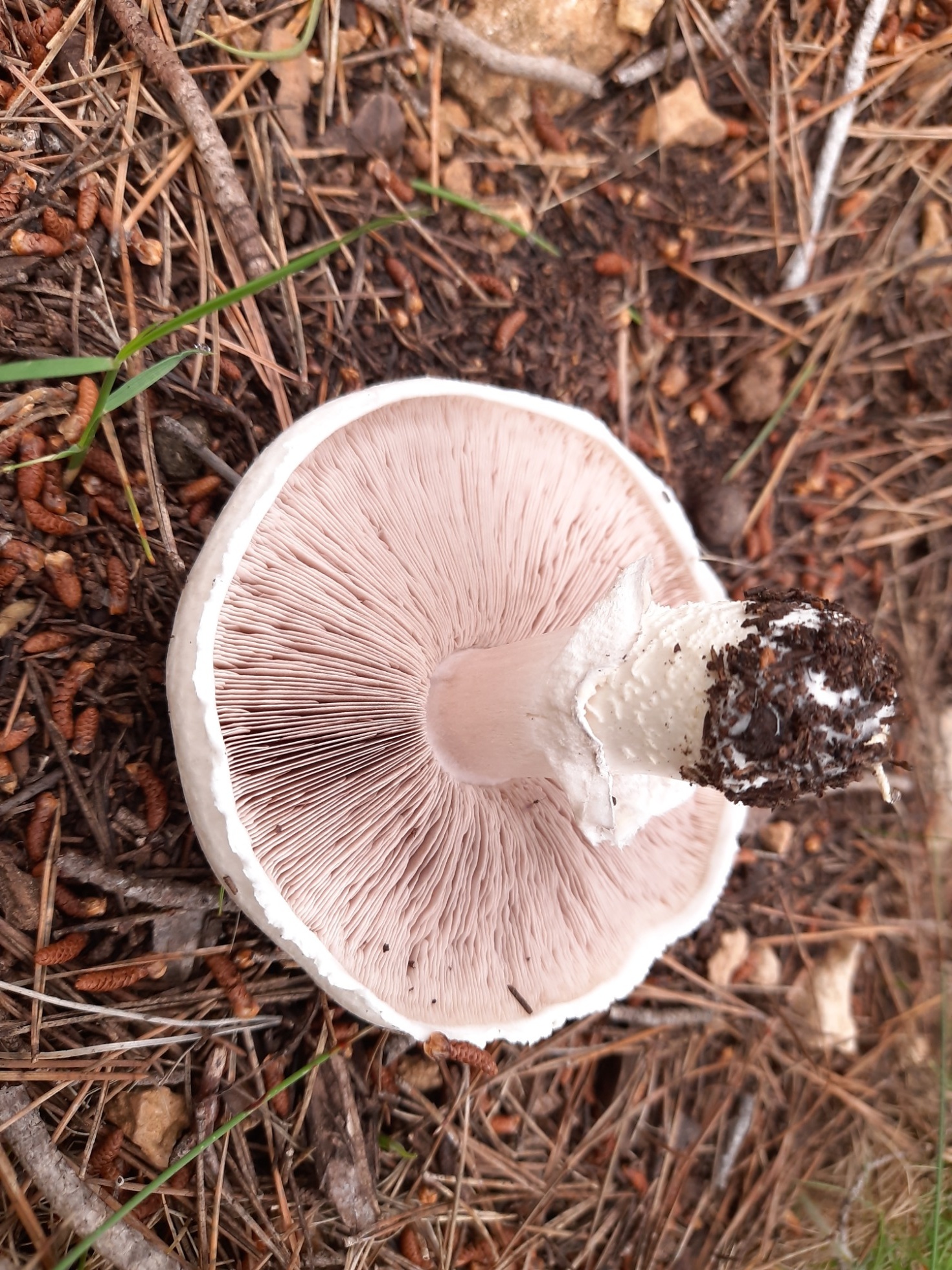 Hola Jose Mnauel. En mi modesta opinión si creo que puede ser un Agaricus y, macroscopicamente me encaja muy bien con Agaricus litoralis: sombrero escamoso, borde escedente, láminas rosa-grisáceas con borde blanquecino, pie escamoso bajo el anillo y con rizoide basal.