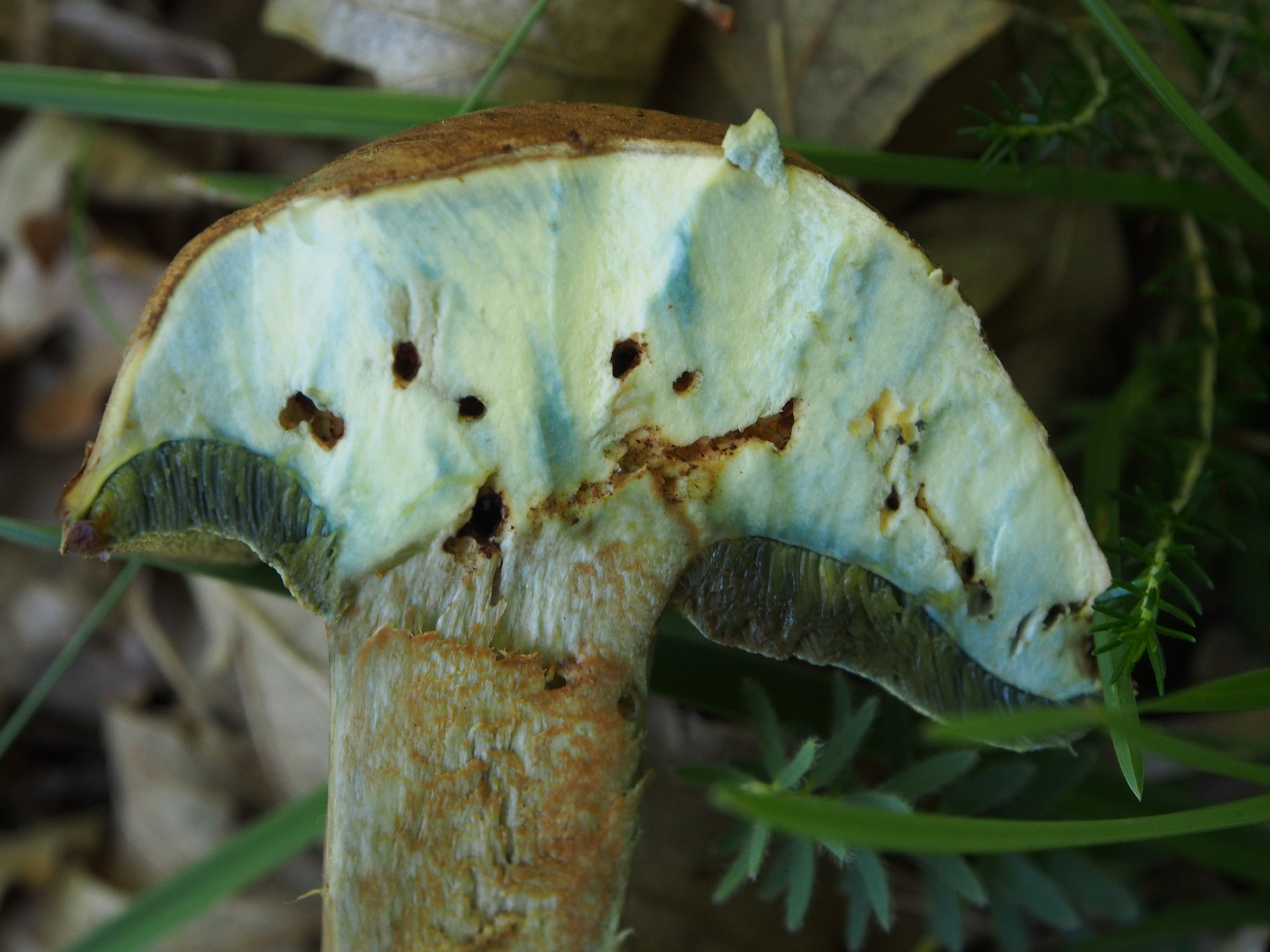 Como podeis ver el pie no es reticulado y tiene una clara coloracion rojiza en la base. Azulea ligeramente al corte, y el azulado no es muy persistente (en la foto del corte del sombrero el corte era fresco, en la foto del ejemplar entero cortado, era un segundo corte y solo era fresco la parte del pie, no sé si me explico).