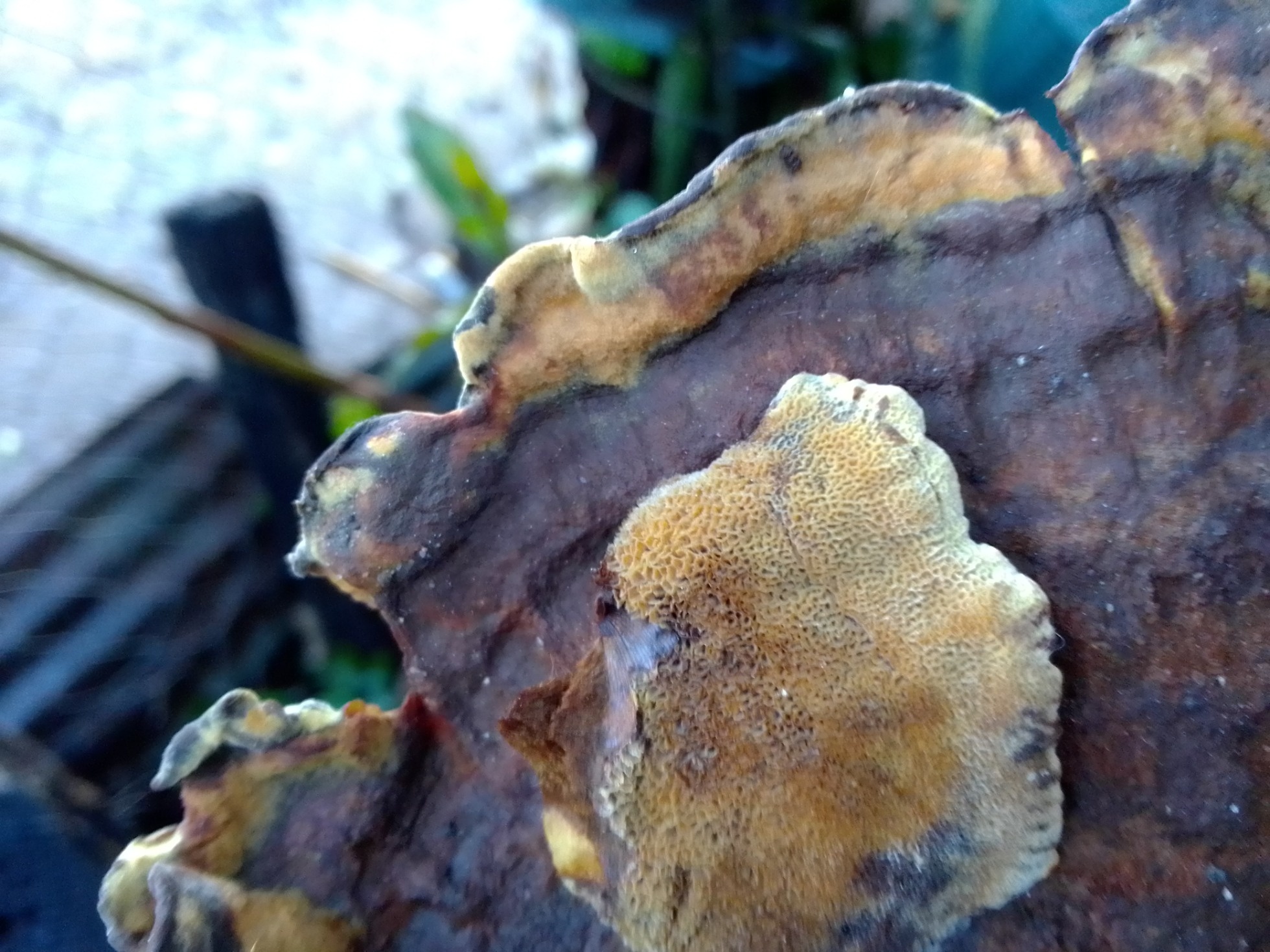 Me alegro de verte de nuevo por aquí, desde luego que Stereum no lo es, los Stereum tienen el himenio liso ,sin poros, tampoco me parece una Trametes, por lo general con poros blancos. Para una correcta identificación hacen falta mas datos, pero tus imágenes podrían ser de Phellinus o hasta de alguno de estos incorporados recientemente al género Fuscoporia. Si se encontraba bajo coníferas hasta incluso podría tratarse de Phaeolus schweinitzii.