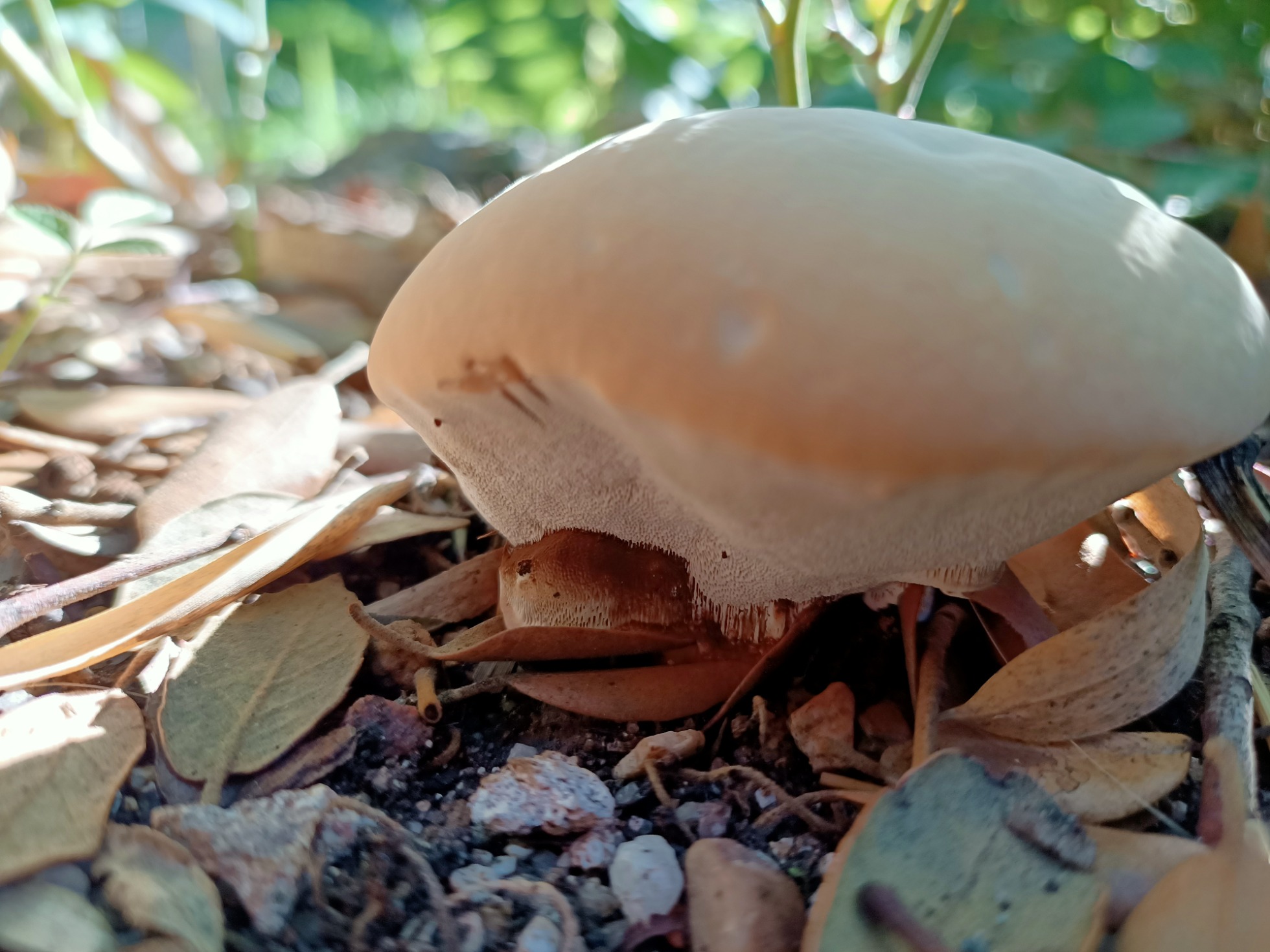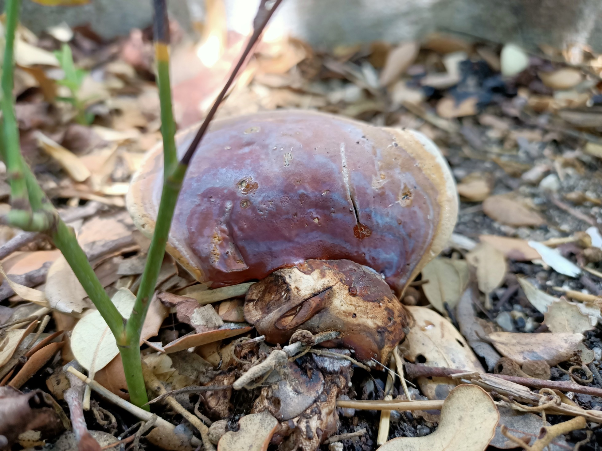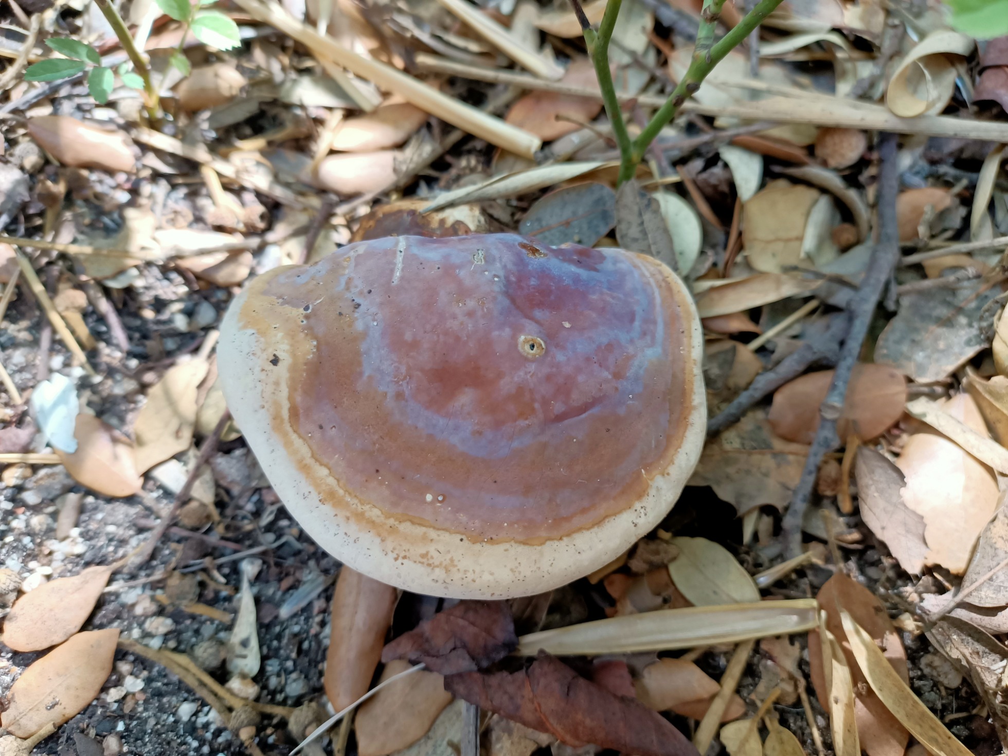 Hola amiguetes, la seta va cambiando de color , ahora tiene unos colores rojizos que me ha hecho pensar que se trate de una Ganoderma lucidum, además hay una encina muy grande justo encima, por lo cual pienso que la seta se puede estar alimentando de alguna rama caída de la encina que esté bajo tierra. He rascado un poco para ver si veo el pie tan característico de la Ganoderma pero parece que está muy enterrada y no quiero interrumpir su crecimiento... Que os parece?
