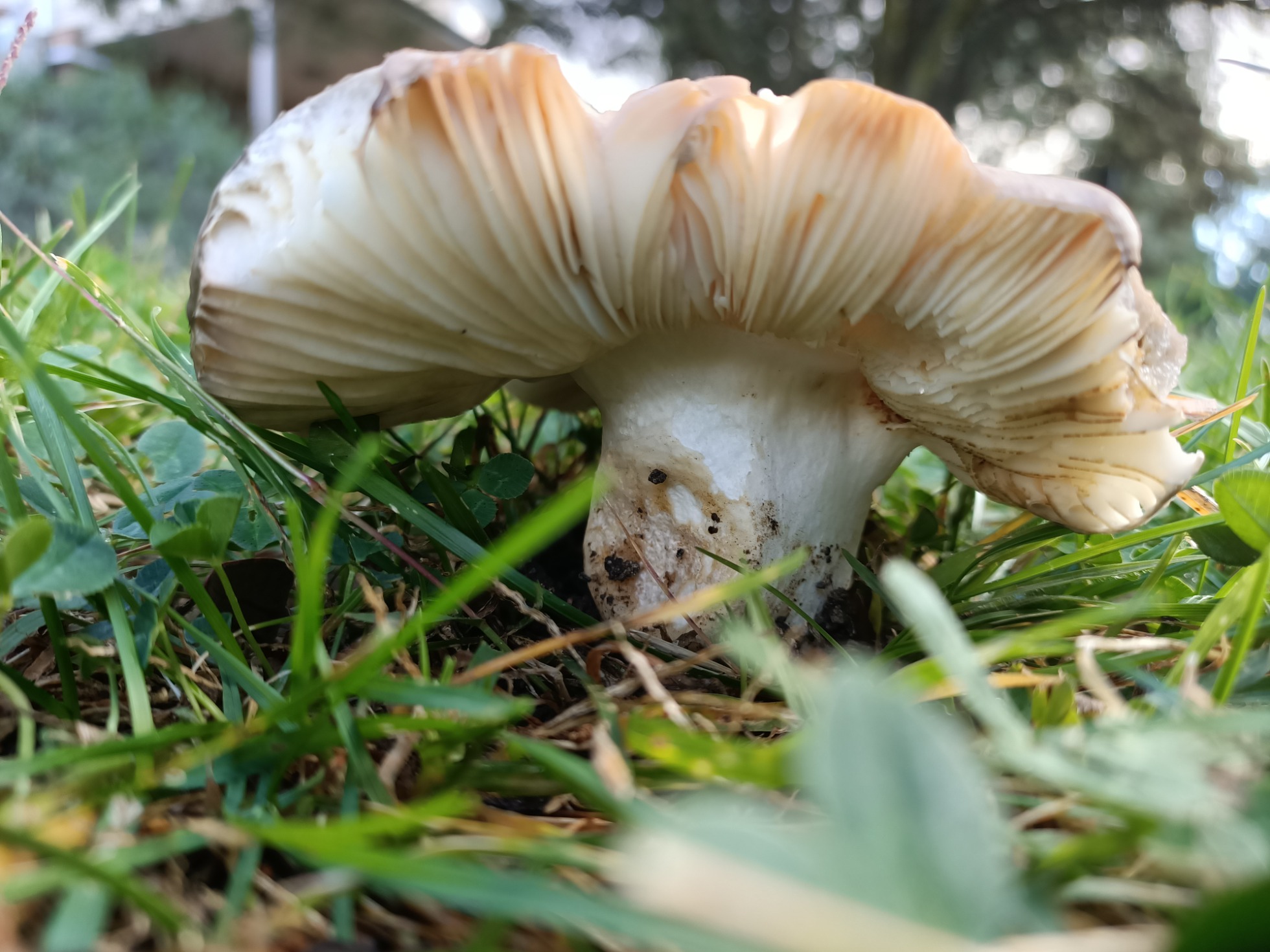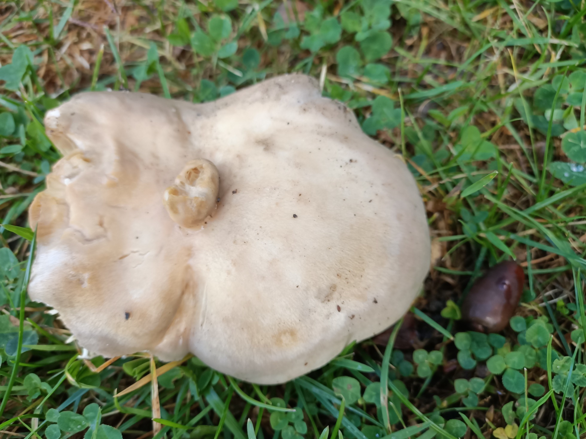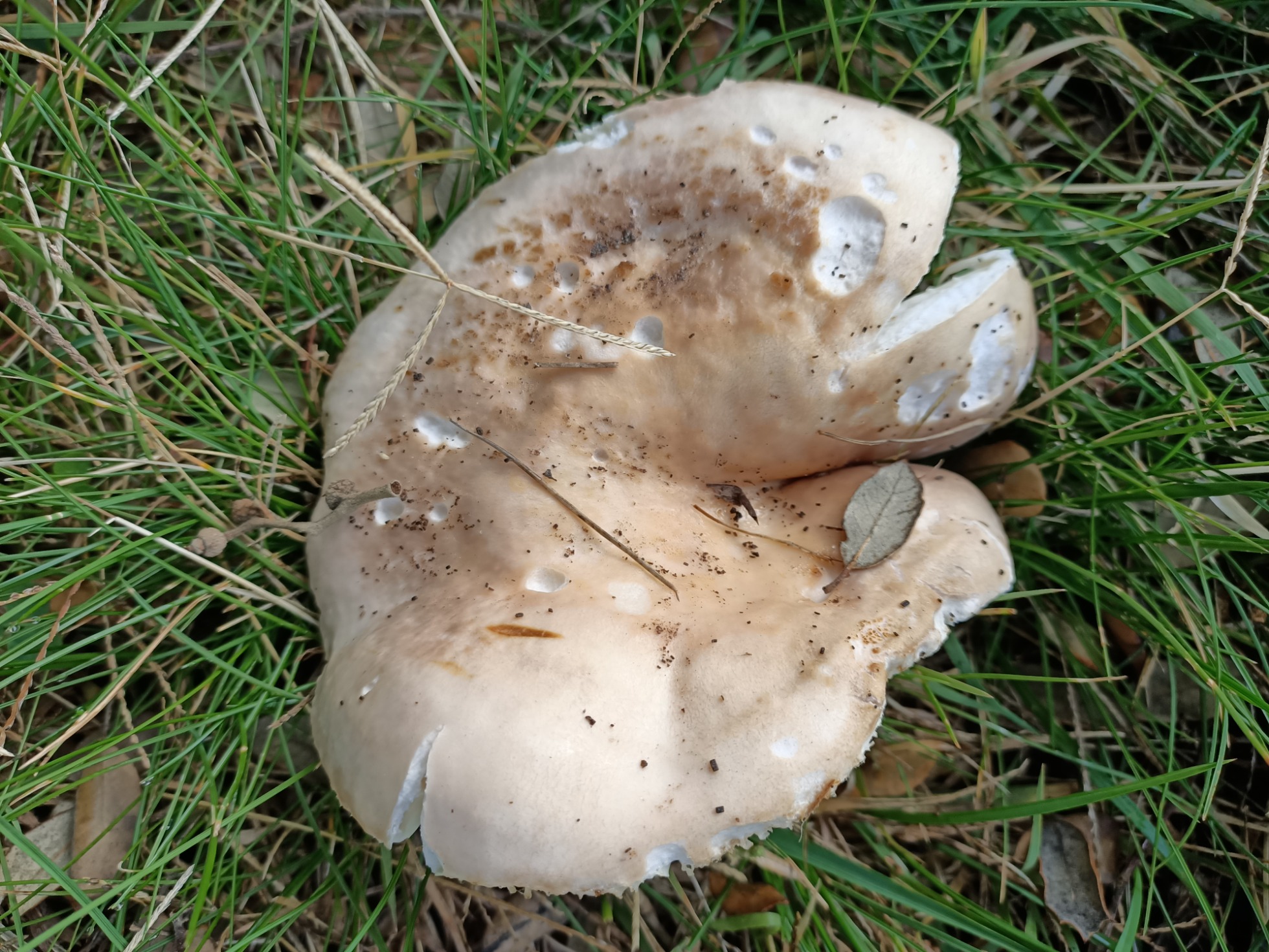 Buenas amiguetes. Hoy quiero consultaros dos especies de mi jardín. La primera creo que es una Russula pero es diferente a las demás que me suelo encontrar. Es muy dura y gelatinosa al tocar el sombrero. No pica. Está bajo una encina en el césped y no para de crecer. Es muy grande.