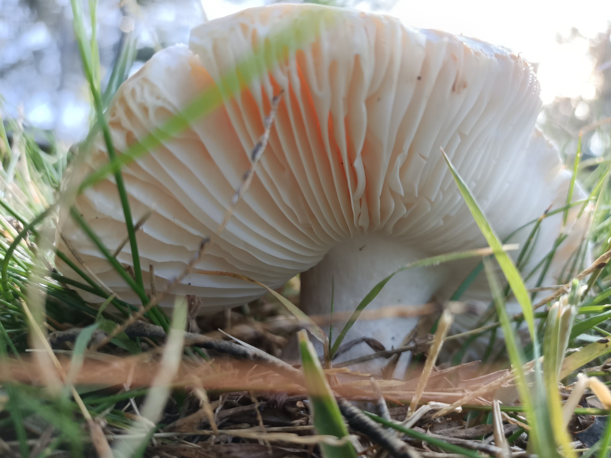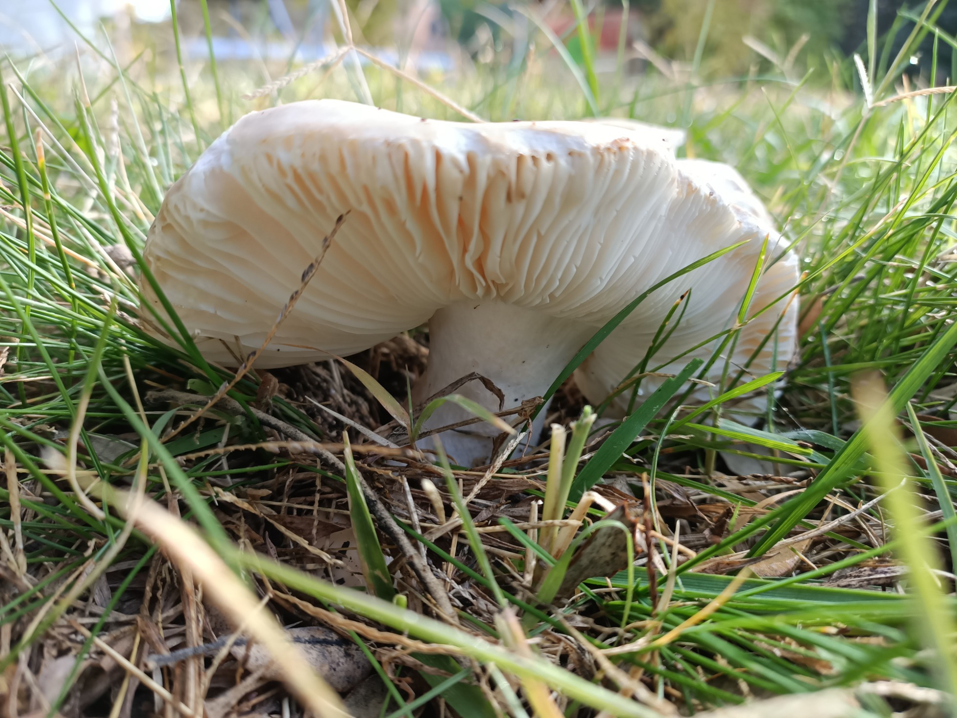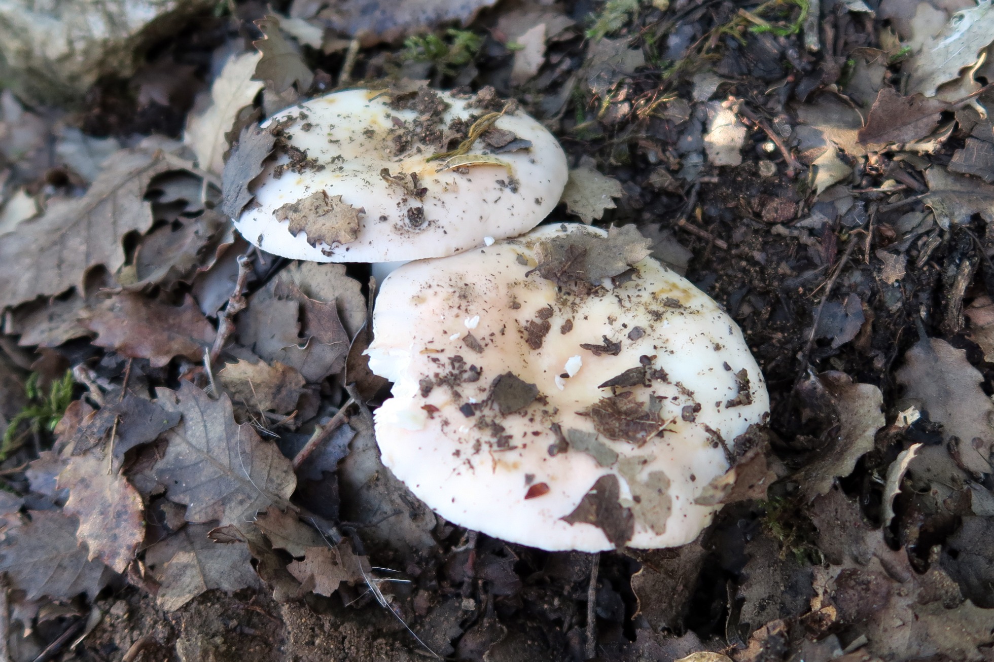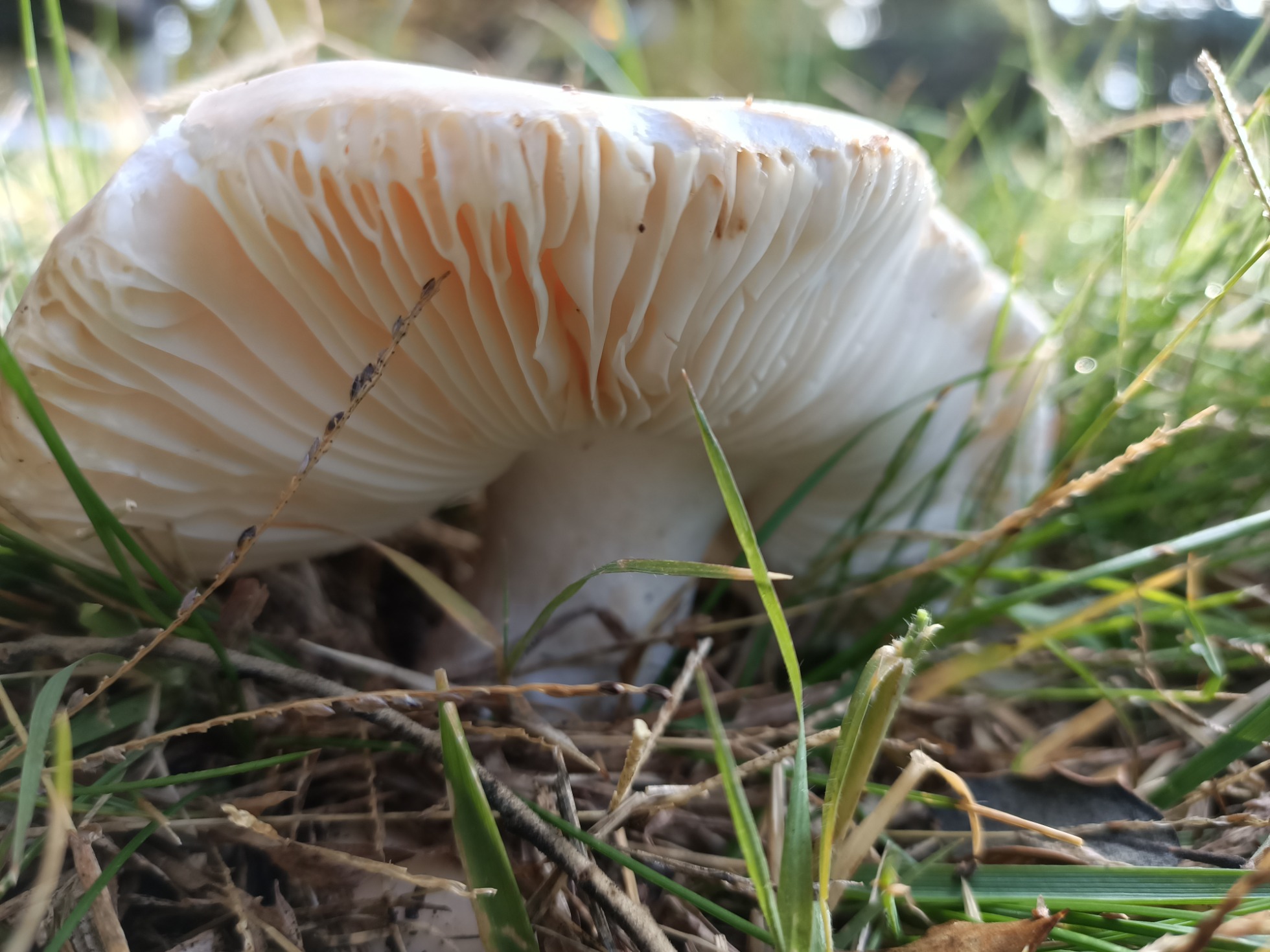 Buenas amiguetes. Hoy quiero consultaros dos especies de mi jardín. La primera creo que es una Russula pero es diferente a las demás que me suelo encontrar. Es muy dura y gelatinosa al tocar el sombrero. No pica. Está bajo una encina en el césped y no para de crecer. Es muy grande.
