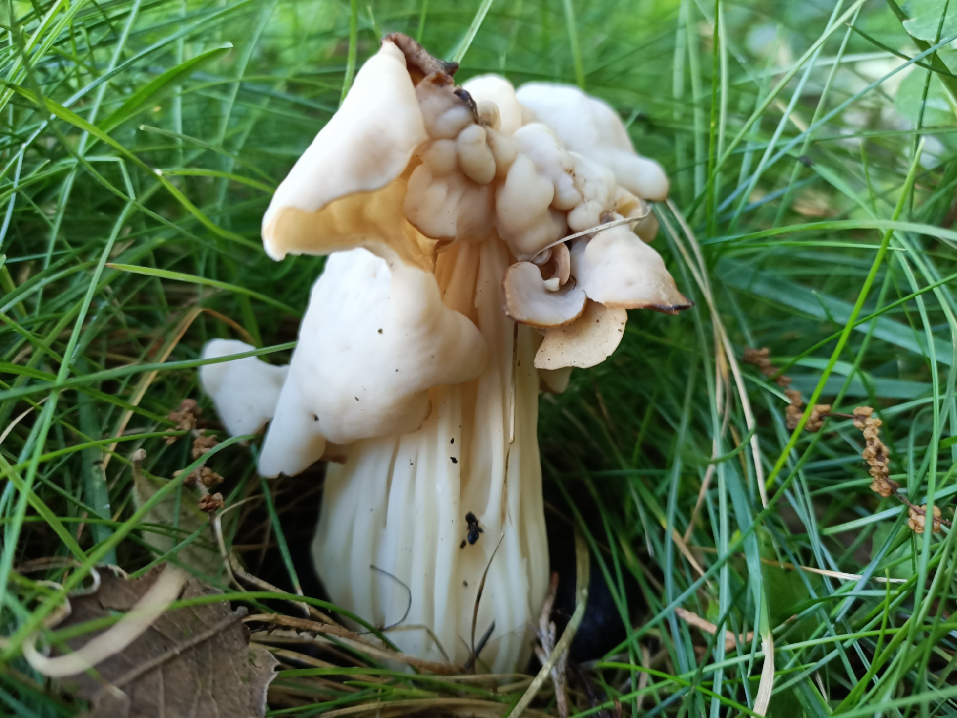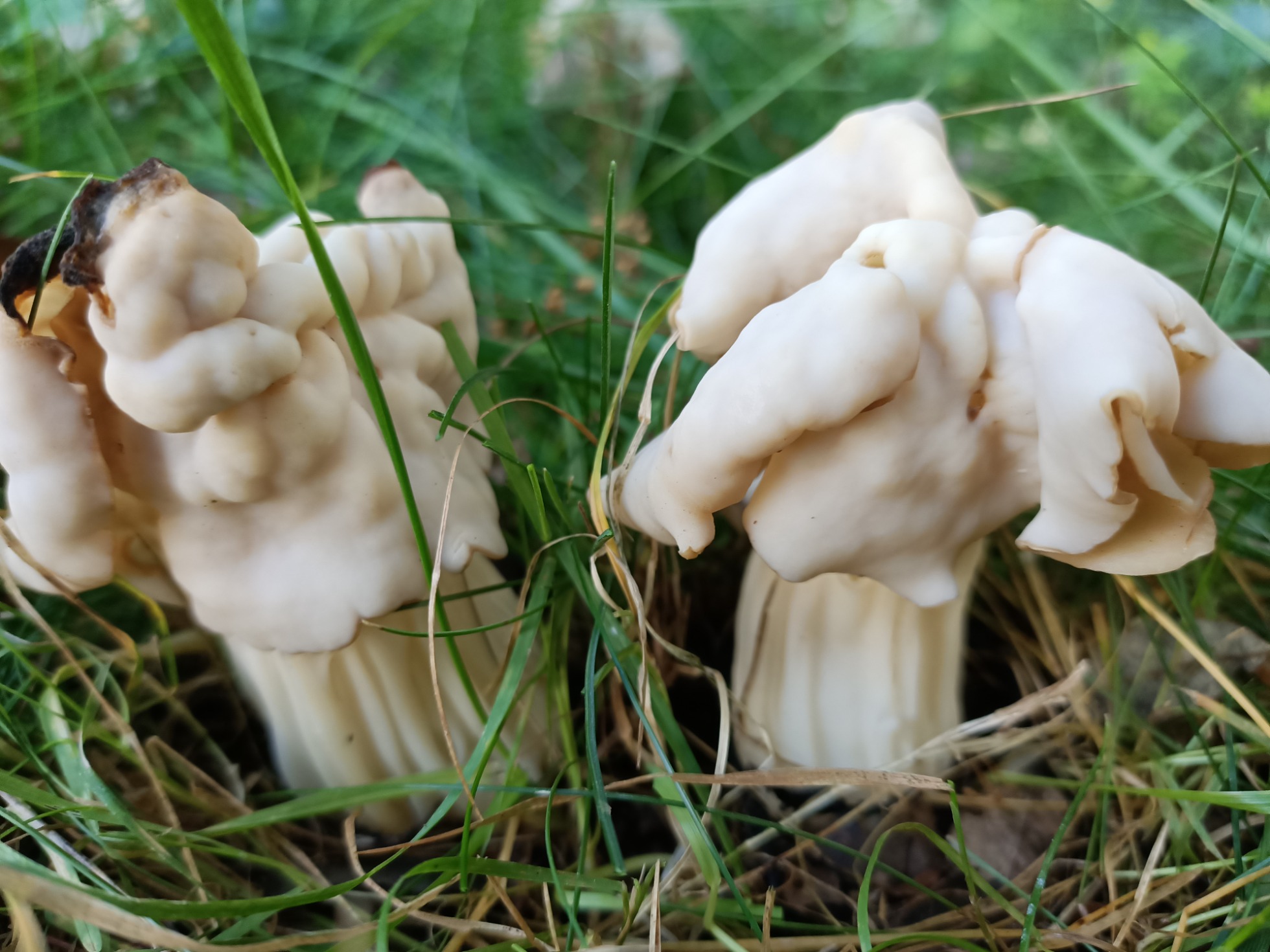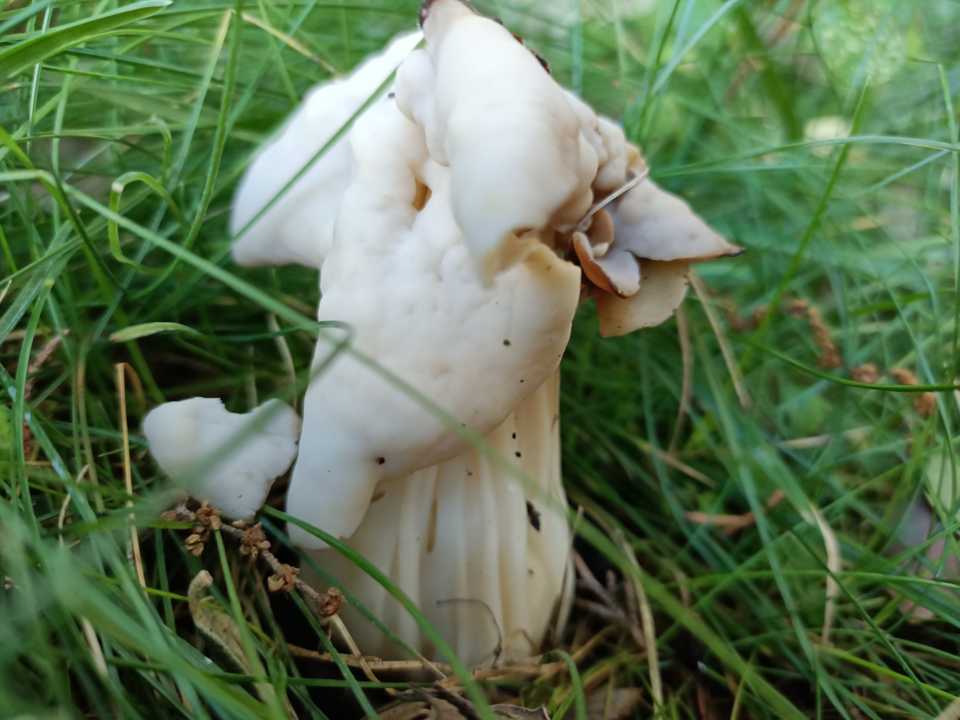 Bajo una encina pero en el césped hay un grupito de setas preciosas que creo que son Helvella crispa.