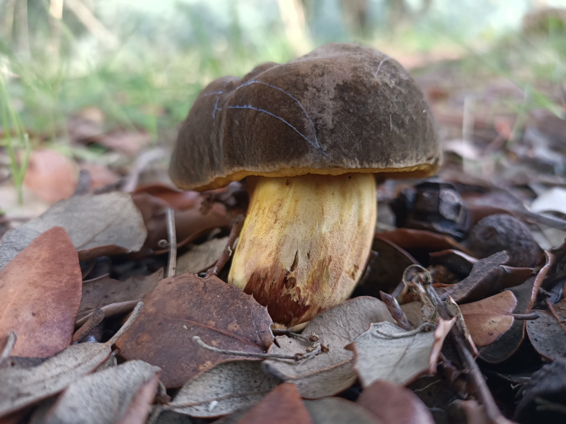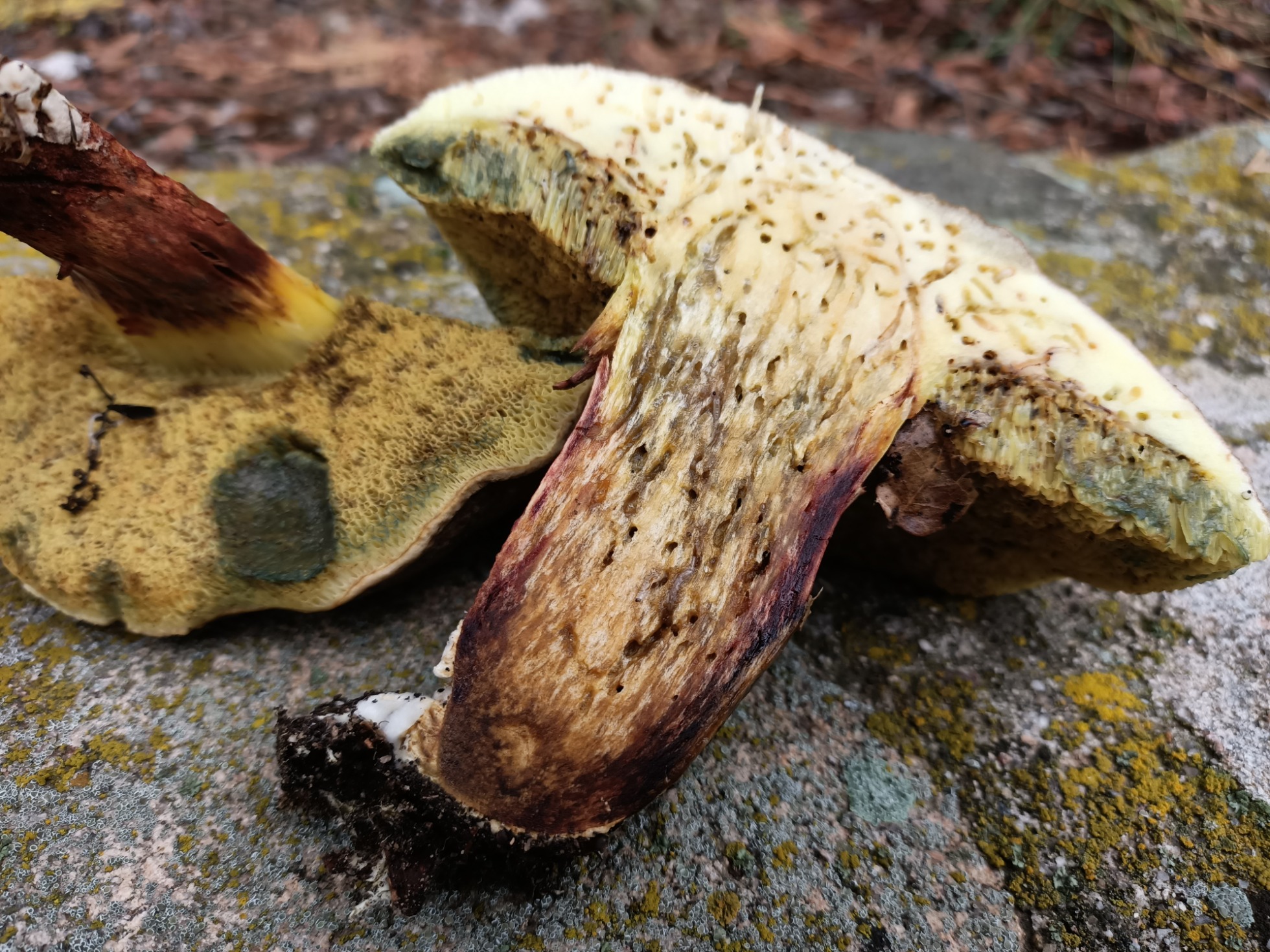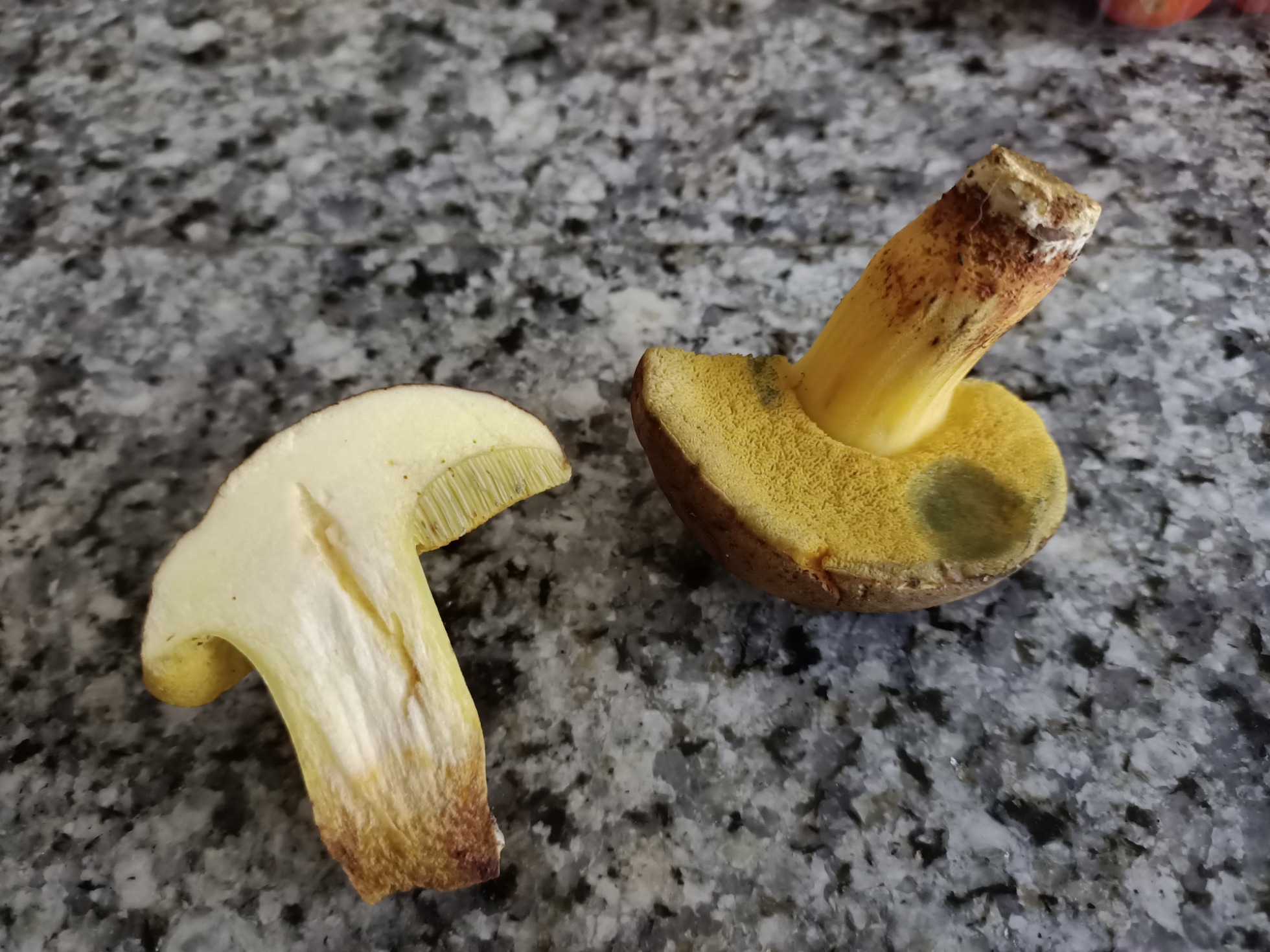 Hola amiguetes. Bajo unas encinas tengo 3 boletales. Pensé que eran erythropus pero al hacerle la autopsia al más maduro me he dado cuenta de que no lo son. Al nacer tienen el pie completamente amarillo limón y el sombrero aterciopelado y oscuro parecido al erythropus. Según crece el pie se tiñe de rojo y se rasga. Al presionar los poros adquieren un color azul-verdoso. La carne es amarilla clara y no cambia de color, ni con el tiempo. Olor suave agradable. Al corte los bordes del pie tienen colores vinosos oscuro.