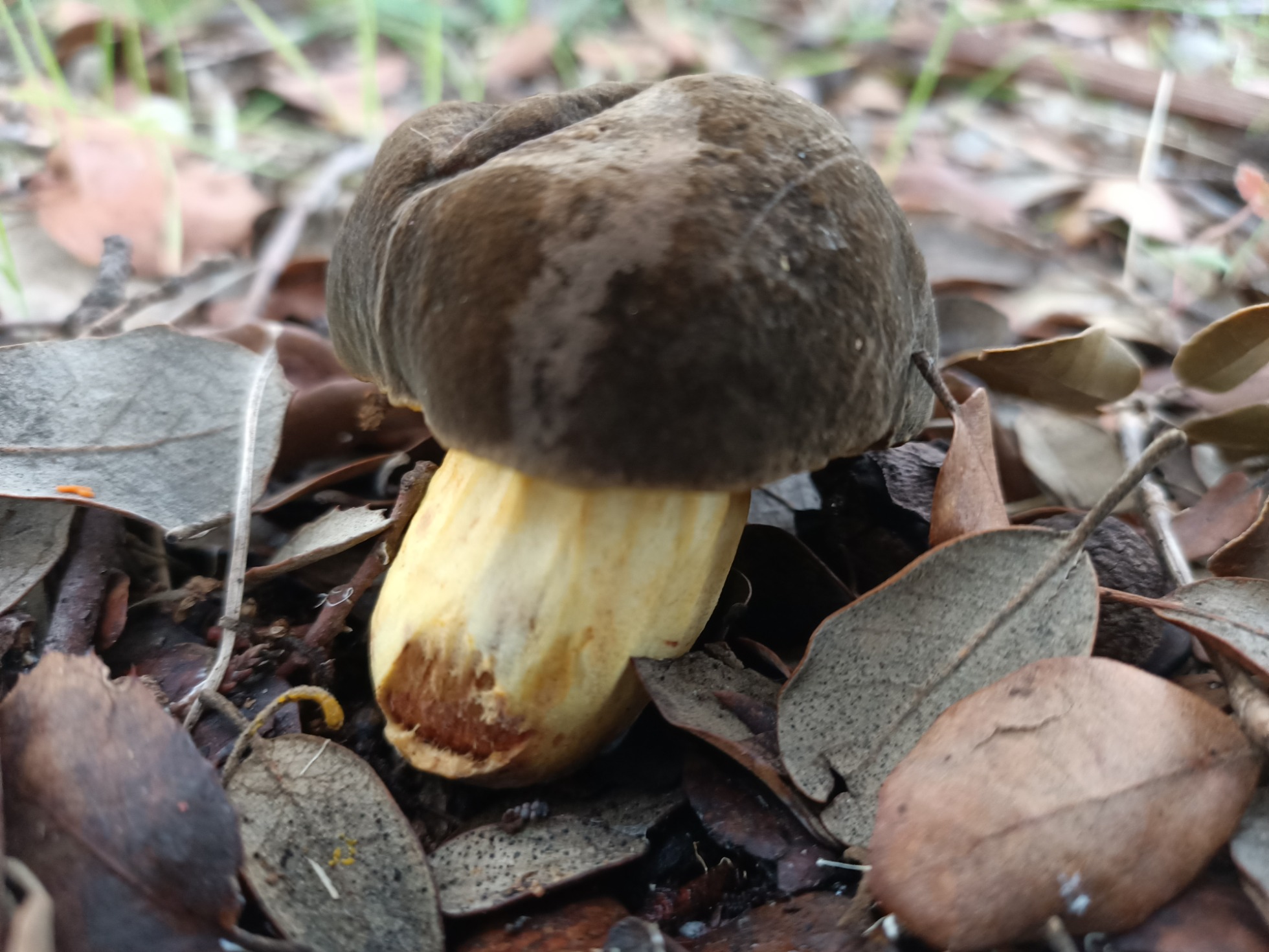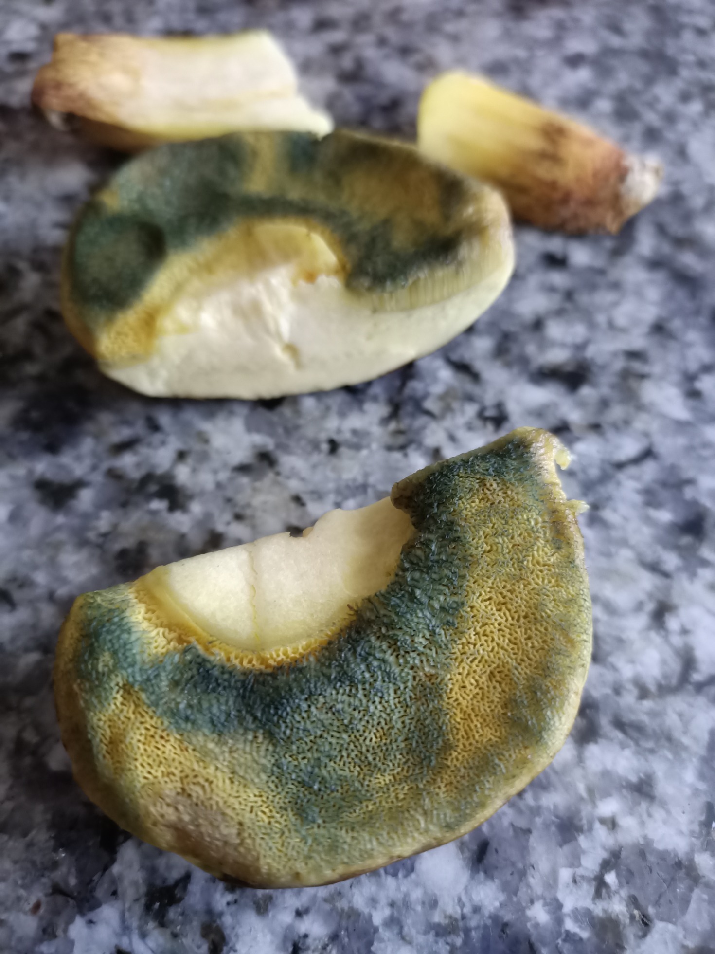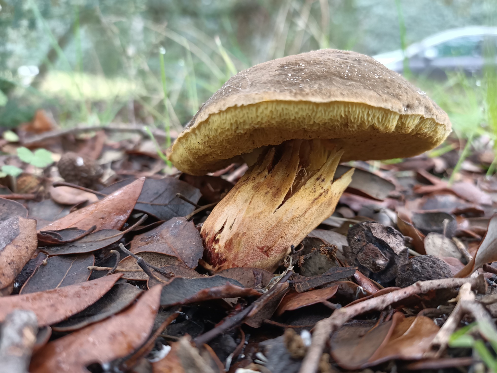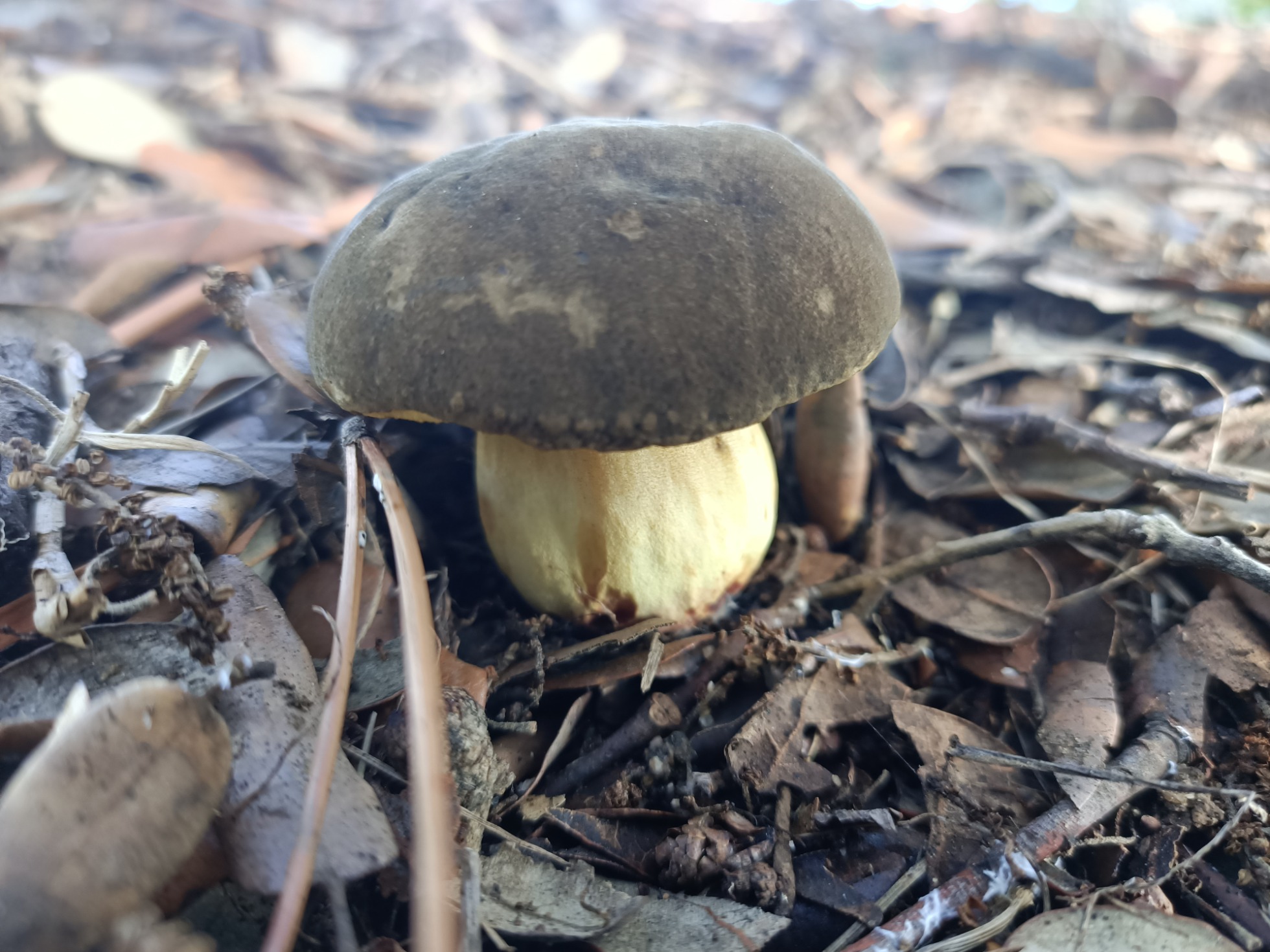 Hola amiguetes. Bajo unas encinas tengo 3 boletales. Pensé que eran erythropus pero al hacerle la autopsia al más maduro me he dado cuenta de que no lo son. Al nacer tienen el pie completamente amarillo limón y el sombrero aterciopelado y oscuro parecido al erythropus. Según crece el pie se tiñe de rojo y se rasga. Al presionar los poros adquieren un color azul-verdoso. La carne es amarilla clara y no cambia de color, ni con el tiempo. Olor suave agradable. Al corte los bordes del pie tienen colores vinosos oscuro.