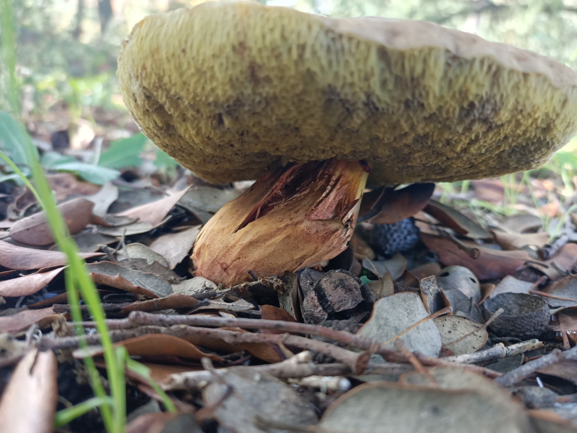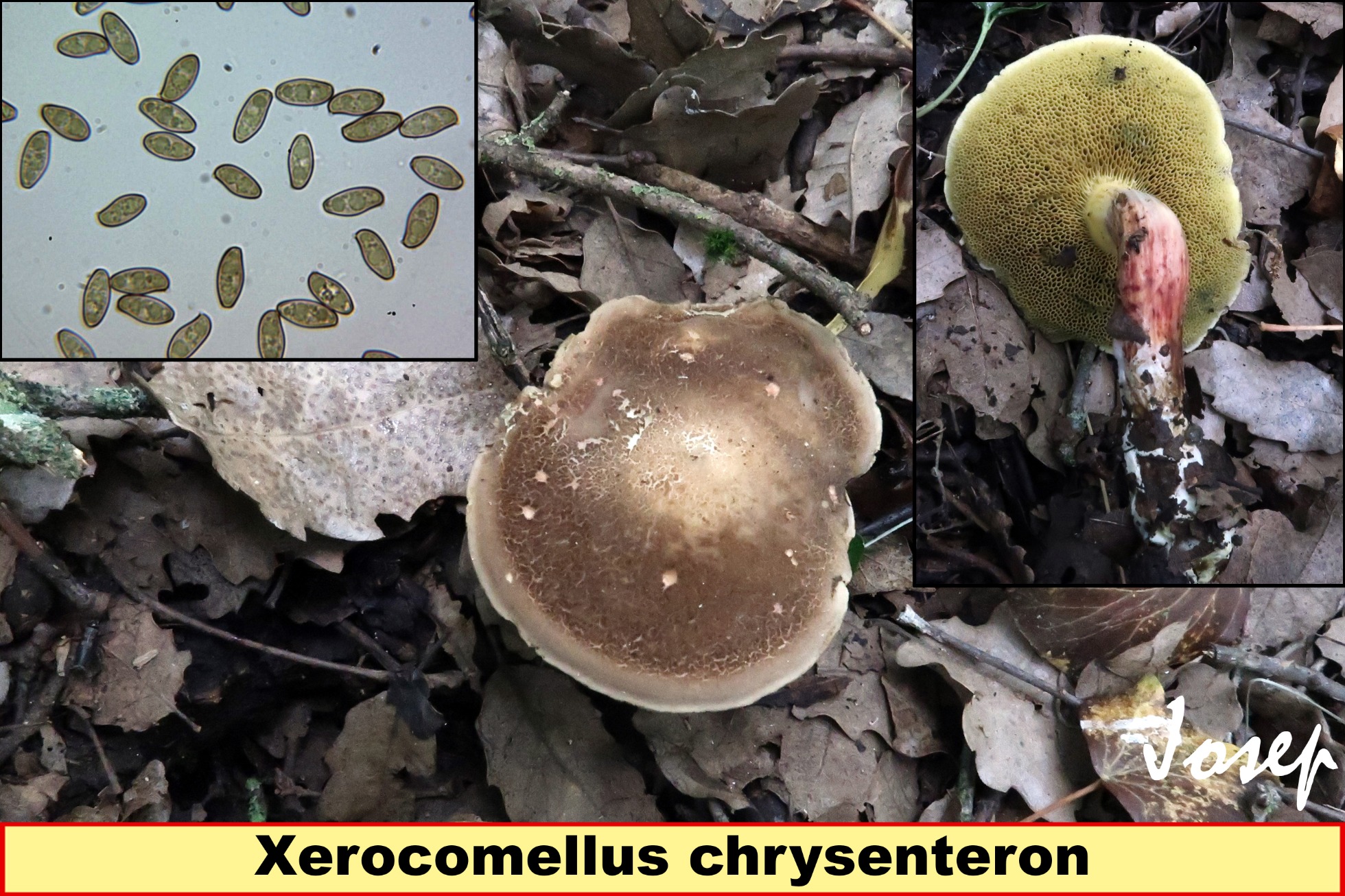 Tengo claro que se trata de un Xerocomus o como queramos llamar ahora al género, pero es muy muy raro, los ejemplares maduros que se ven con algo de cuarteamiento, ninguno tiene la superficie bajo la piel con tonos rojizos, ni se atisba siquiera nada parecido, con lo que descartaría el chrysentheron, tengo la impresión desde hace mucho que en ese grupo hay más especies de las propuestas.