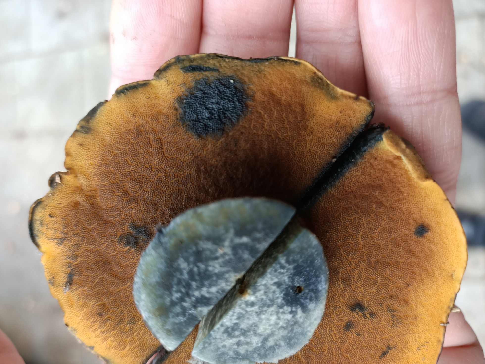Hola amiguetes bajo unas encinas he visto este boletal. Pensé que era un erythropus, pero al sacarlo pienso que puede ser un Suillellus queletii. El pie es amarillo con algunos tonos rojizos y tiene un fino punteado más pardo. En la base se ven tonos vinosos aunque al contarlo no se ve mucho rojo... Los poros son anaranjados y más amarillentos en los bordes.