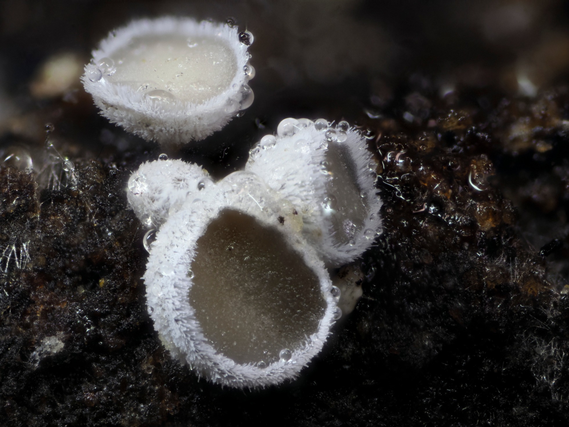 Muy parecido a (Lachnum virgineum) incluso en este caso en el tamaño sub-milimétrico (la foto es un apilado de muchas tomas) , pero carecen de pié, son pequeñas ollas agrupadas en un tronco en descomposición, ¿algo que se le parezca?