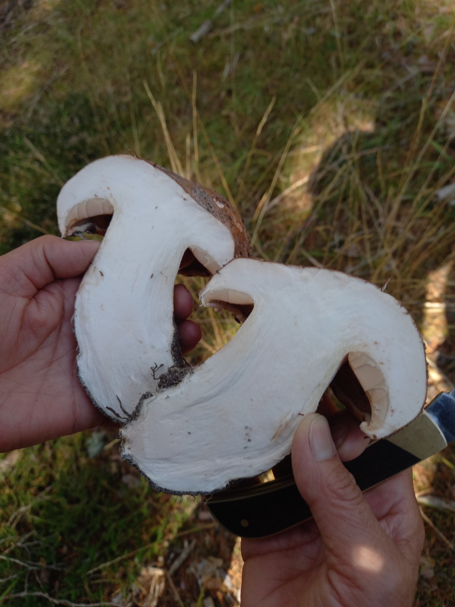Hola Salvador, en este caso el dato que sería más útil es el color de la esporada en masa, es un dato fácil de obtener y nos aclara muchas dudas, si todo es de lo mismo la última de tus imágenes me recuerda a Tricholoma, pero el color de las láminas y la sección me acercan a Cortinarius, veo que no suelta látex, entonces descartamos Lactarius, y tenemos esporada blanca para Tricholoma y esporada marrón para Cortinarius, como me temo que la cosa irá por este último el apellido se me antoja casi "Misión imposible", todos los Cartinarius que por su aspecto me merecen atención ya no pierdo el tiempo con ellos y los mando directamente al análisis molecular.