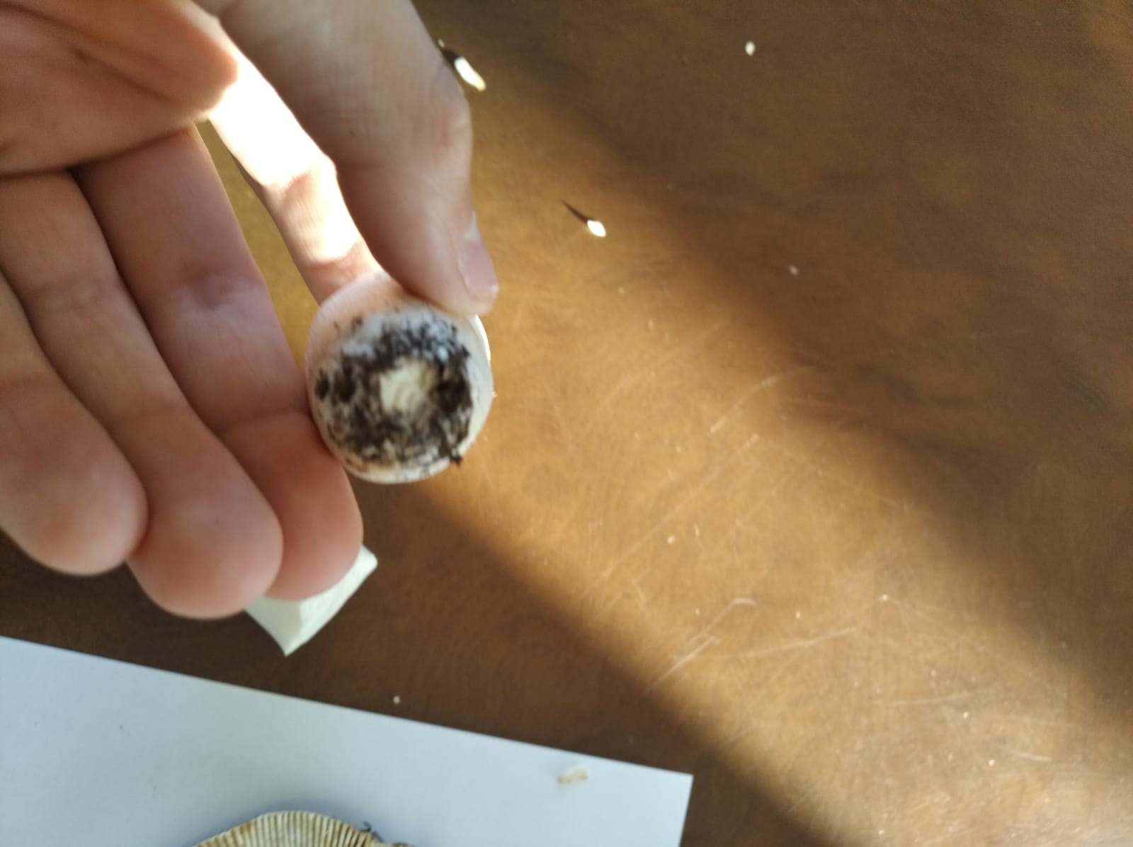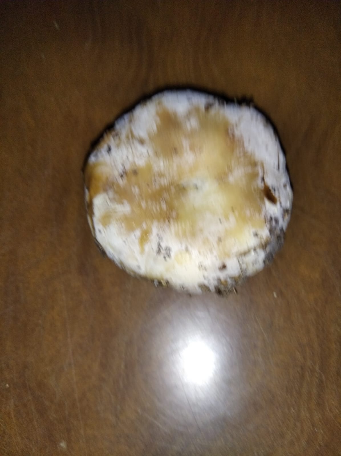 2.Es ligeramente pegajosa, color caramelo, con un olor agradable, las làminas son de color crema, pero al estar cubiertas de una película blanca muy fina, se ven de color blanco. La película se encuentra en toda la seta. No he hecho esporada