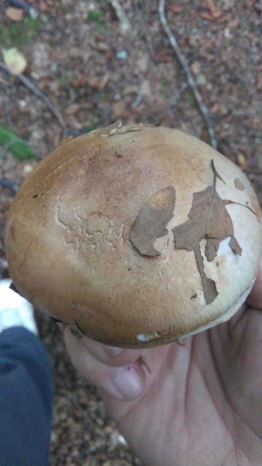 SOMBRERO convexo a aplanado, giboso en el centro y con bordes fuertemente revueltos, como doblados con tenazas al principio y luego extendido, de 5 a 10 cm, con superficie lisa poco viscosa y afelpada, marrón-tabaco o marrón-rojiza, con algunas fibrillas radiales, con algunas tonalidades lilas en los bordes, en los adultos algo higrófana toma colores más oscuro en las zonas rozadas o manipuladas.