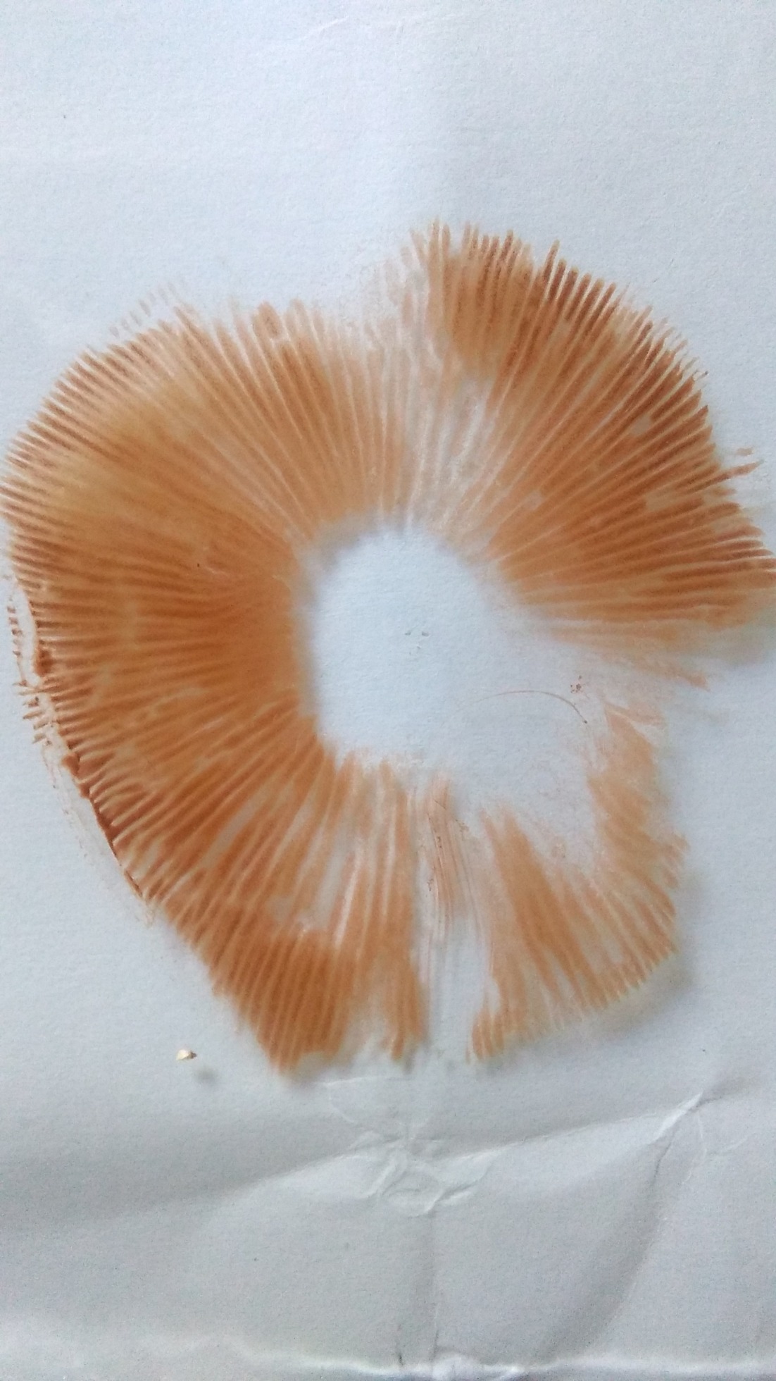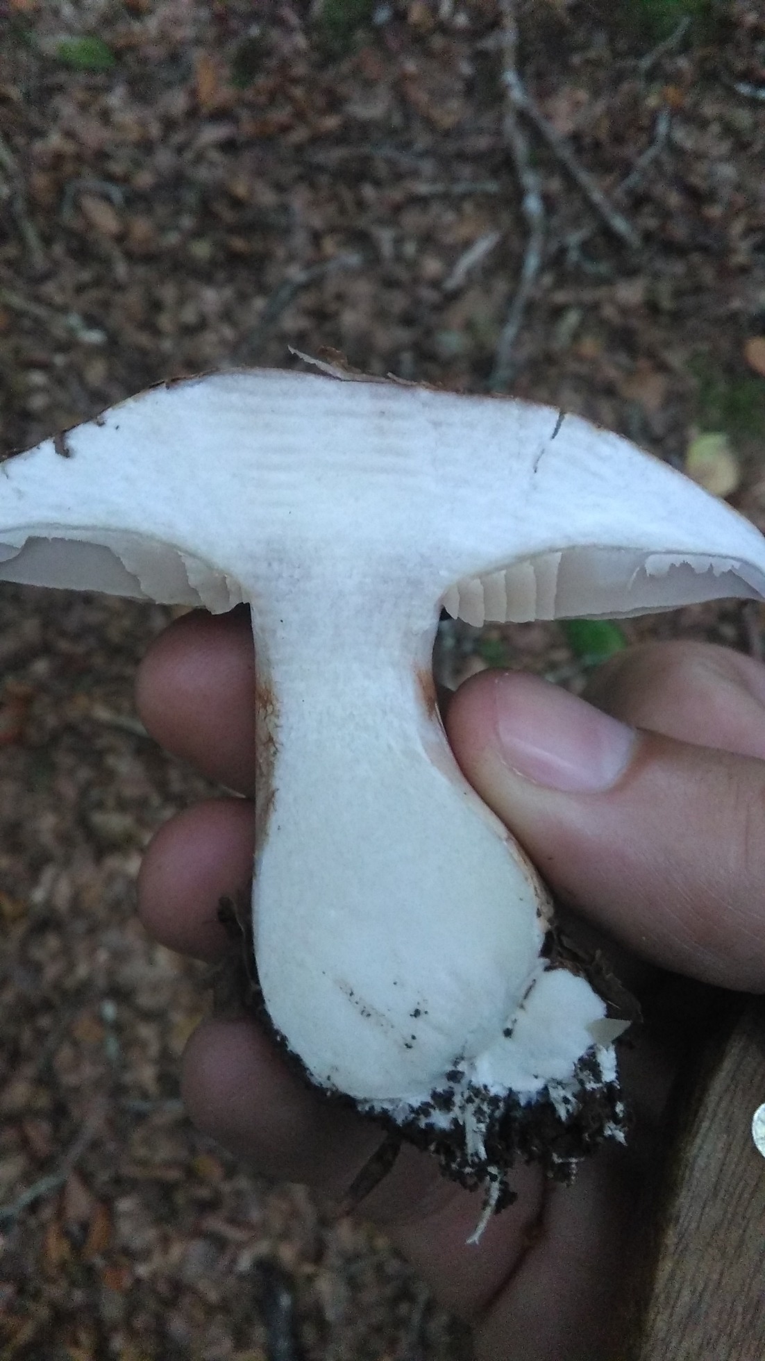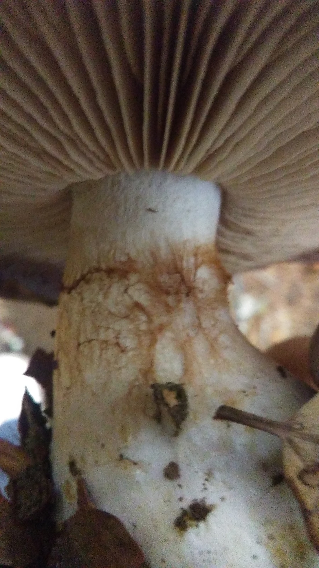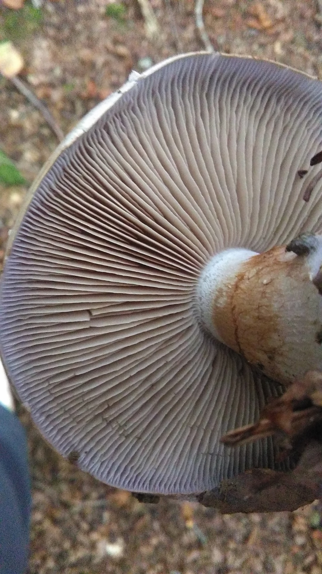 En hayedo, sombrero seco, mate, láminas escotadas o ligeramente decurrentes, con lamélulas y sub-lamélulas, arista laminar mas bien lisa no dentado, borde del sombrero laminar color lila, hacia el interior junto al pie ocre, por las esporas, pie superior blanco, despues cortina, para seguir crema, bulboso, ensanchado en su base, y quizá pueda ser algo radicante por la forma que tiene la 4ª foto, carne inmutable al corte, ( a no ser de forma muy sutíl en la zona que une el sombrero con el pie y que no me atrevo a decir que cambie ) su olor es raro que no sabría definir, no invita a su consumo, pero con esto no digo que huela mal, había varios en la zona, sueltos o en grupos de 3, una imágen vi en forma de herradura.