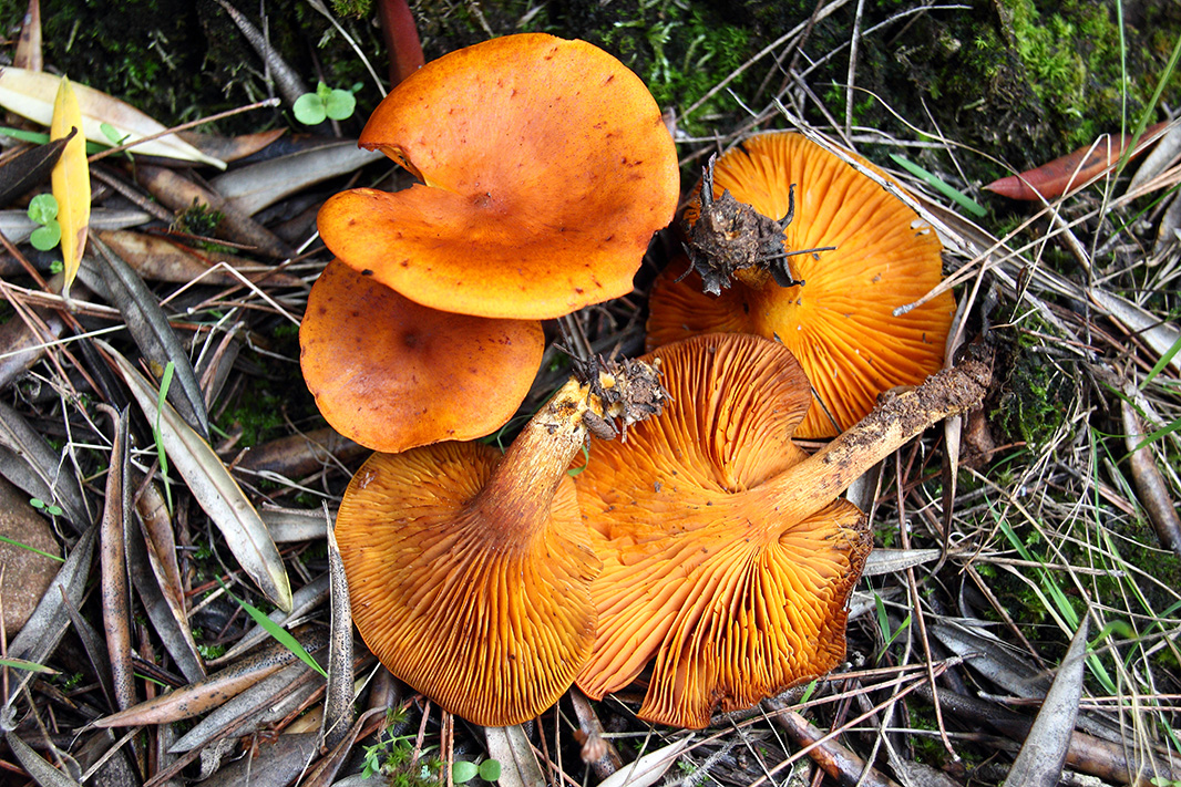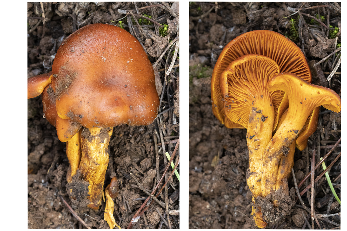 La segunda, la seta del olivo, un grupillo por un lado, al lado de un tocón. Y el ramillete también en suelo en zona de coníferas y Quercus, las del ramillete la carne también presenta ese color amarillento-anaranjado,