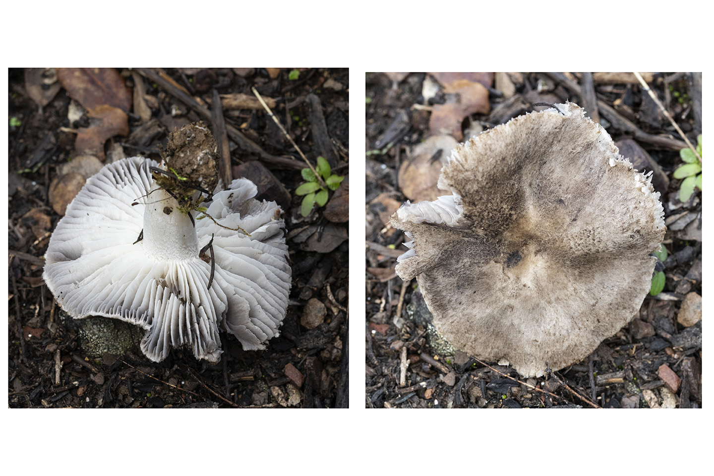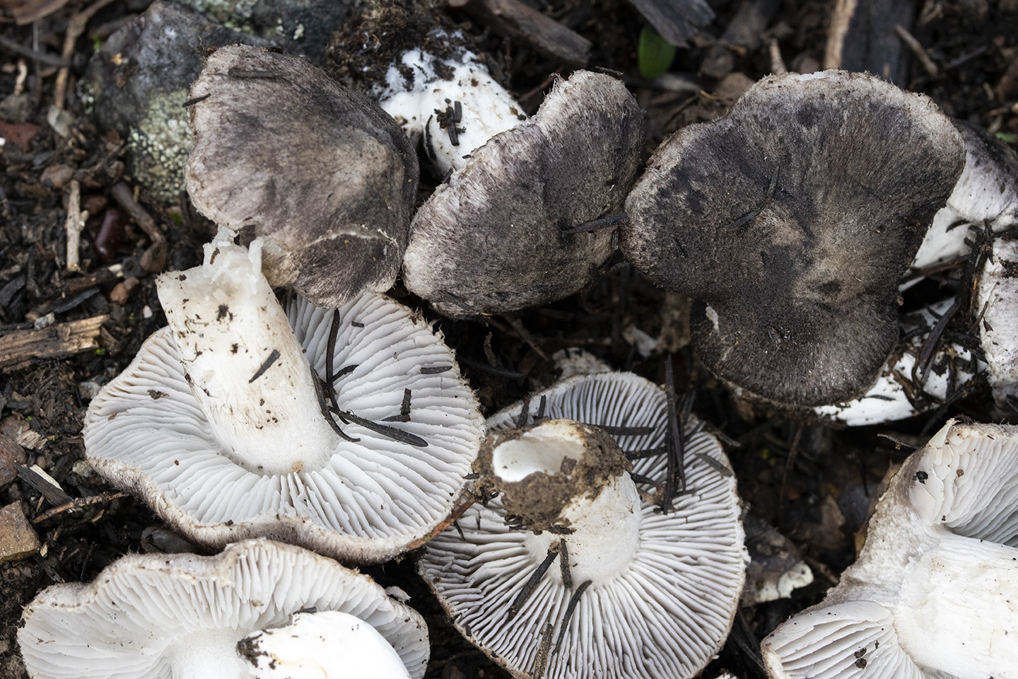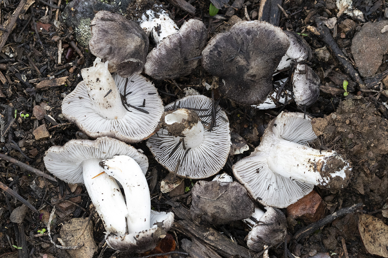La primera Tricholoma terreum, un ejemplar suelto y luego el grupillo, en pinos, coníferas de repoblación y Quercus. No observo vellosidad en el sombrero ni aristas manchadas de negro, olor suave como a tierra húmeda.