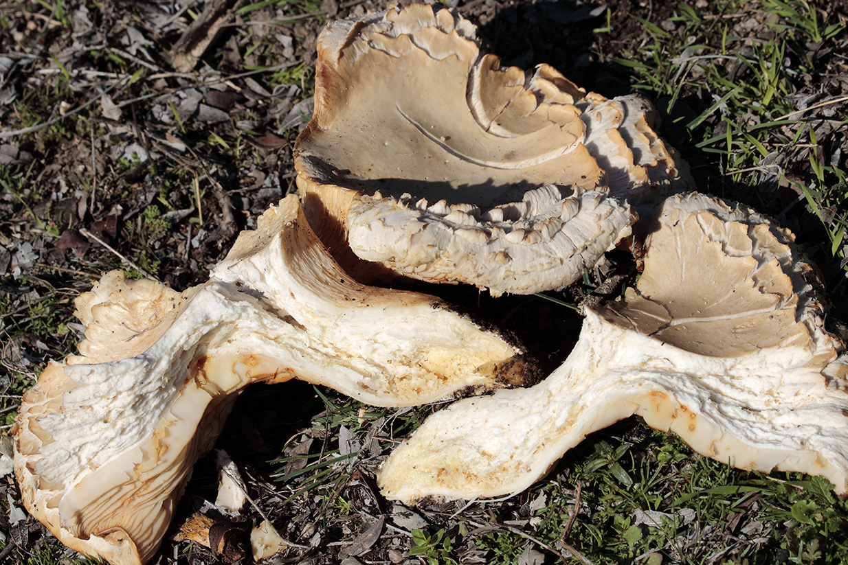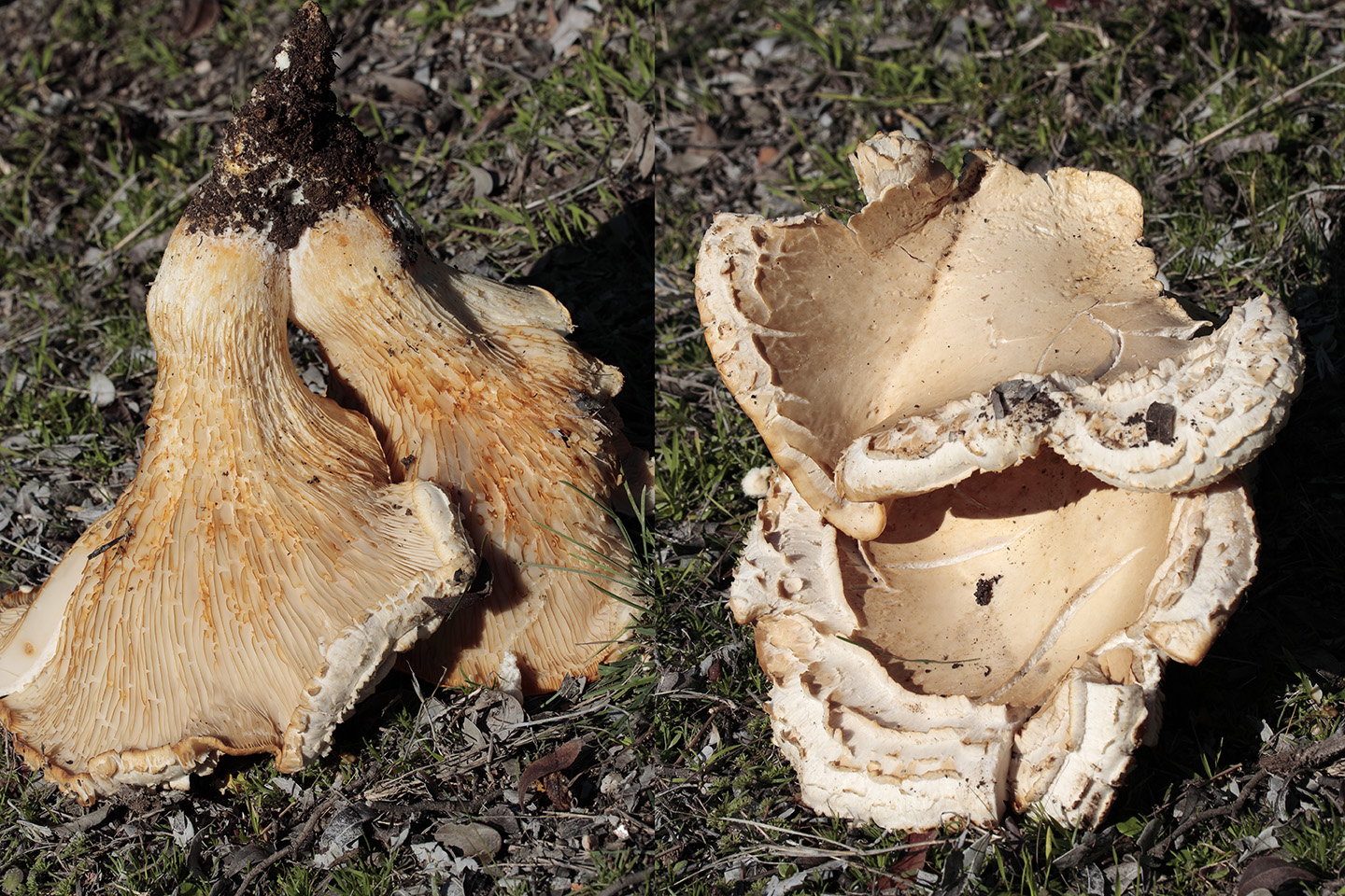 La grandota, pensé Clitocybe maxima, pero lo olvidé porque me parecía que en mi imagen el pie era más corto e incluso grueso, y las láminas más decurrentes. Supongo que no hay muchas más candidatas y por ahí ira la cosa. Muchas gracias
