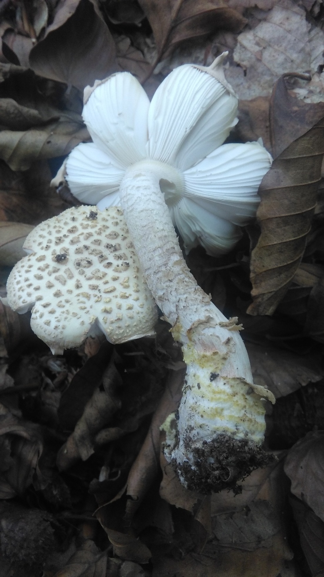 Hola David, siento el no poder ayudarte ya que tengo las mismas dudas que tu, si solo me fijo en su aspecto (escamas del sombrero, y las escamas en espiral del pie con su base ocrácea) me parece Amanita vittadinii, pero no encaja el hábitat ni de coña, y tampoco me cuadra para nada la ausencia de anillo, otra opción sería la de Amanita codinae que aparece en claros boscosos pero el pie me parece excesivamente largo