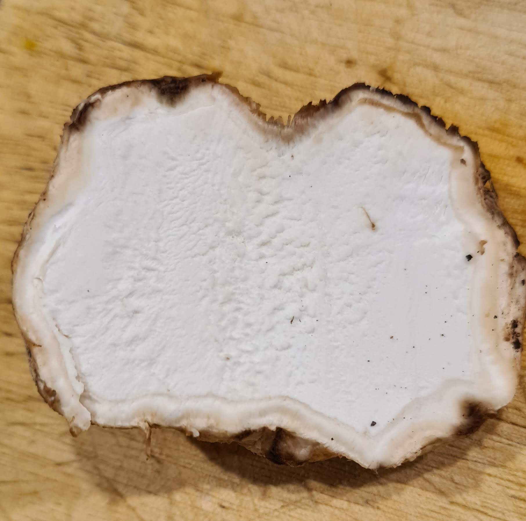Esa seta me dejo intrigado ya que la gleba color blanco y liso me recuerda mucho a la clasificacion "pufball" por eso te habia mencionado al Lycoperdon o a la Calvatia que tambien hay por zonas donde es mas humedo y tiene la Gleba de ese color y textura, bueno la mayoria de los pufball tienen asi la gleba creo