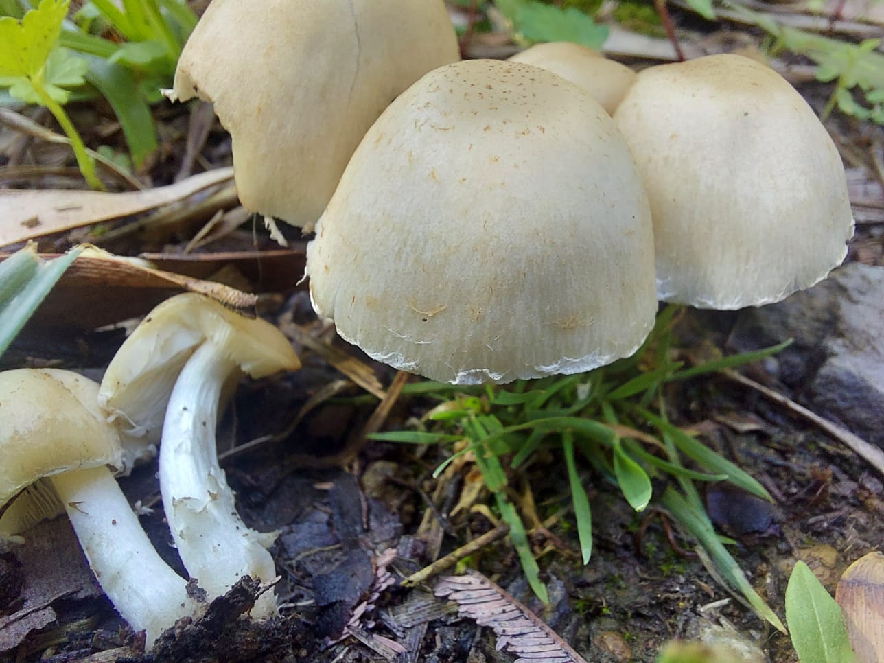 Hola Norbert, bienvenido a Fungipedia, resulta muy complicado para nosotros el identificar algún hongo con solo un par de imágenes, no obstante las dos primeras aunque la presencia de una banda anular me descoloca, a tenor de su densidad laminar tienen aspecto de Tubaria sp., la más común y que más veces me he encontrado es la Tubaria furfuracea, pero sin microscopía imposible el poder asegurar ni tan siquiera el género. Con la segunda sería muy importante el poder conocer el dato del color de la esporada en masa, es un dato fácil de obtener (basta con colocar los sombreros boca abajo sobre un papel o cristal, taparlos con un trapo húmedo, cubrir todo con un vaso y esperar 24 horas), es que me he encontrado con ejemplares jóvenes de Psathyrella candolleana (esporada oscura) muy parecidos a estos que nos muestras.