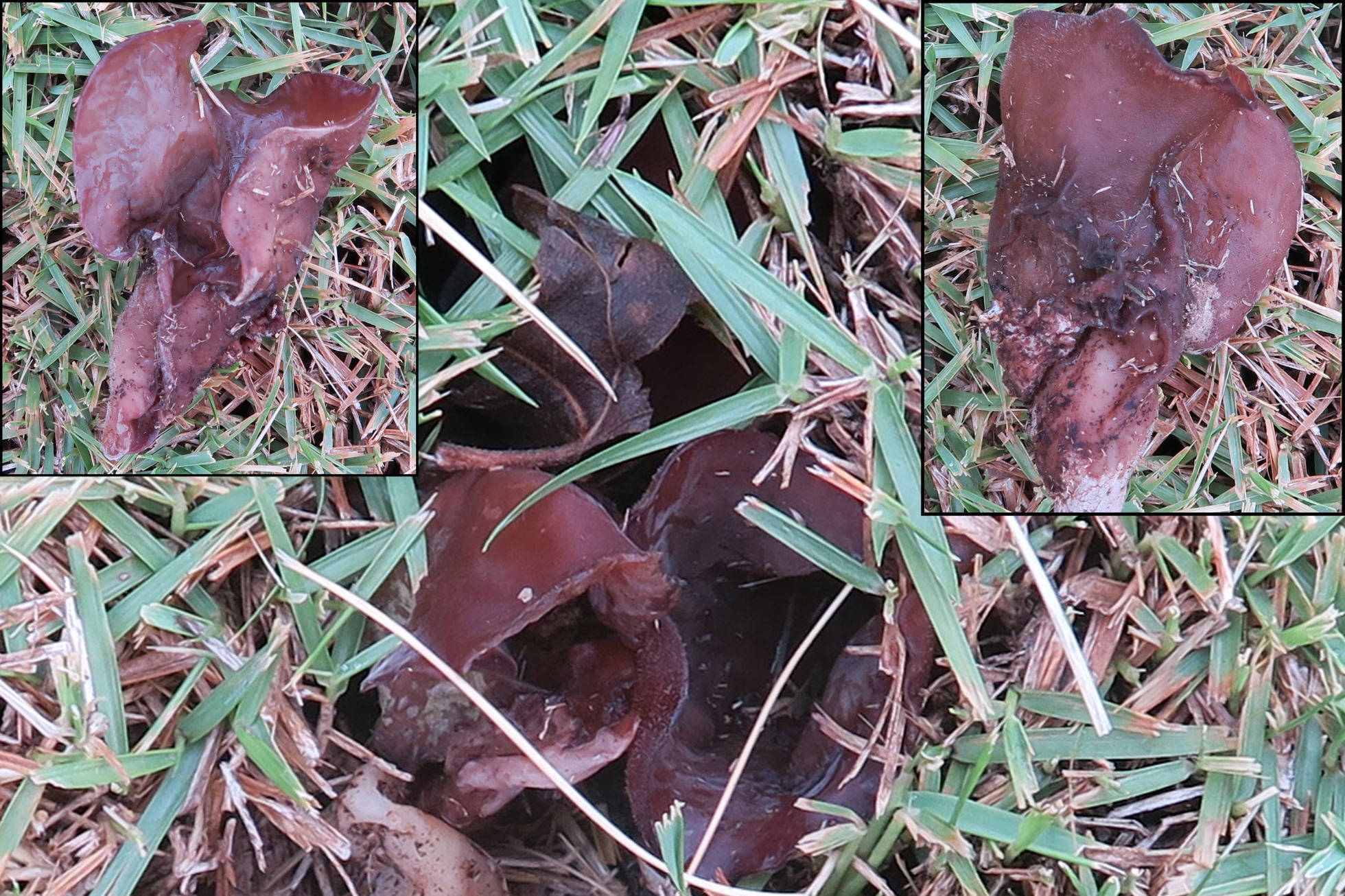 De la primera poco puedo decir, puede ser Auricularia pero no la veo en buen estado como para formarme una opinión, la segunda claramente Peziza, Peziza varía....la tercera la tengo bastante clara, Hypholoma lateritium, un saludo