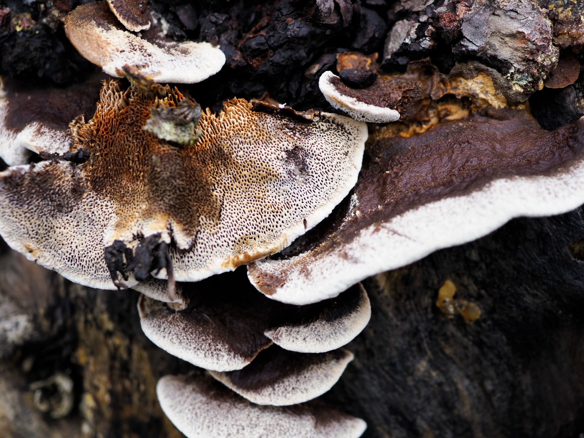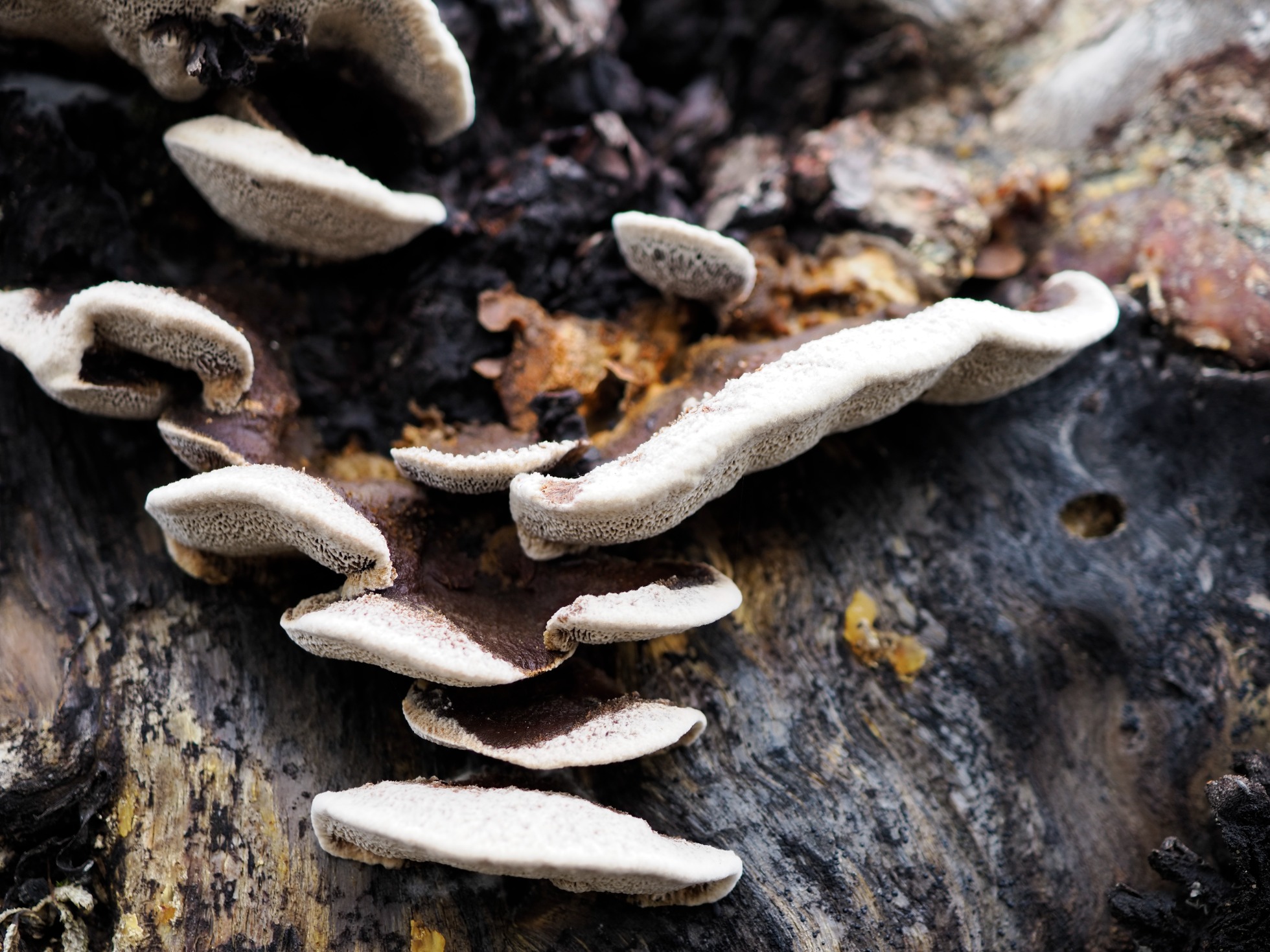 Hola Ángel, con las dos primeras imágenes veo dos cosas muy distintas, con la primera habrías tenido que comprobar si realmente brotaba del suelo o lo hacía sobre algunos restos de madera enterrados, ya que por su aspecto tiene toda la pinta de Auricularia auricula-judae, de tratarse de esta su consistencia debería ser flexible, en el caso de una Otidea estas son sumamente frágiles, con la segunda a falta de micro, a mi modo de ver tiene más pinta de Peziza que de Otidea, con la tercera no descarto que se trate de un Tricholoma (muy importante el color de la esporada en masa, que debería ser blanco), aunque con un aspecto parecido hay varios. Con la última con este borde blanquecino, con sombrero glabro y estos poros, aunque no nos indicas la identidad del huésped, la opción más probable sería la del Gloeophyllum trabeum, y si la madera era de pino entonces Gloeophyllum sepiarium.