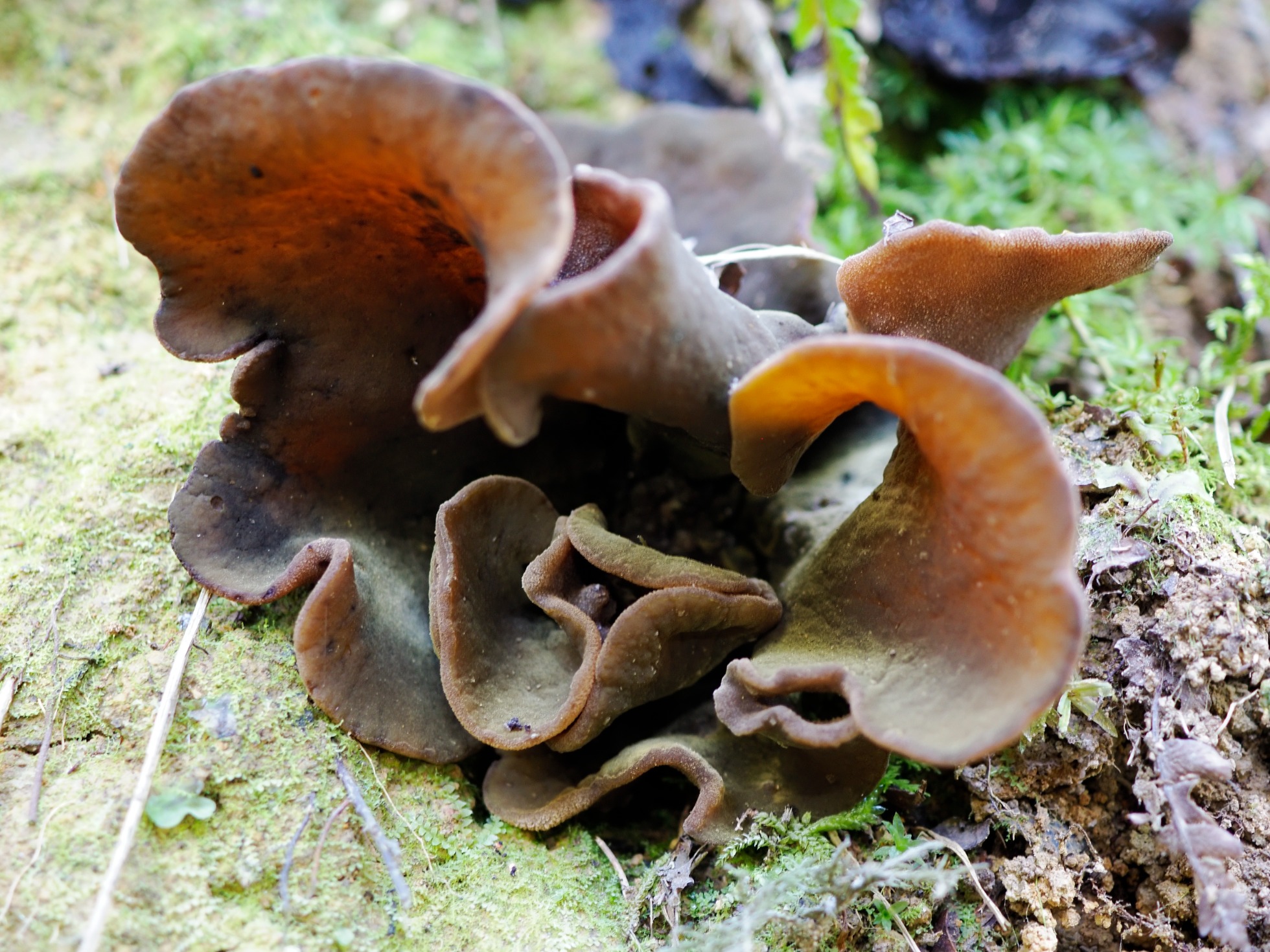 Te añado un par de imágenes mías de Auricularia auricula-judae, una sobre madera y la otra que parece brotar claramente del suelo, cuando en realidad lo hacía sobre unas raíces enterradas.