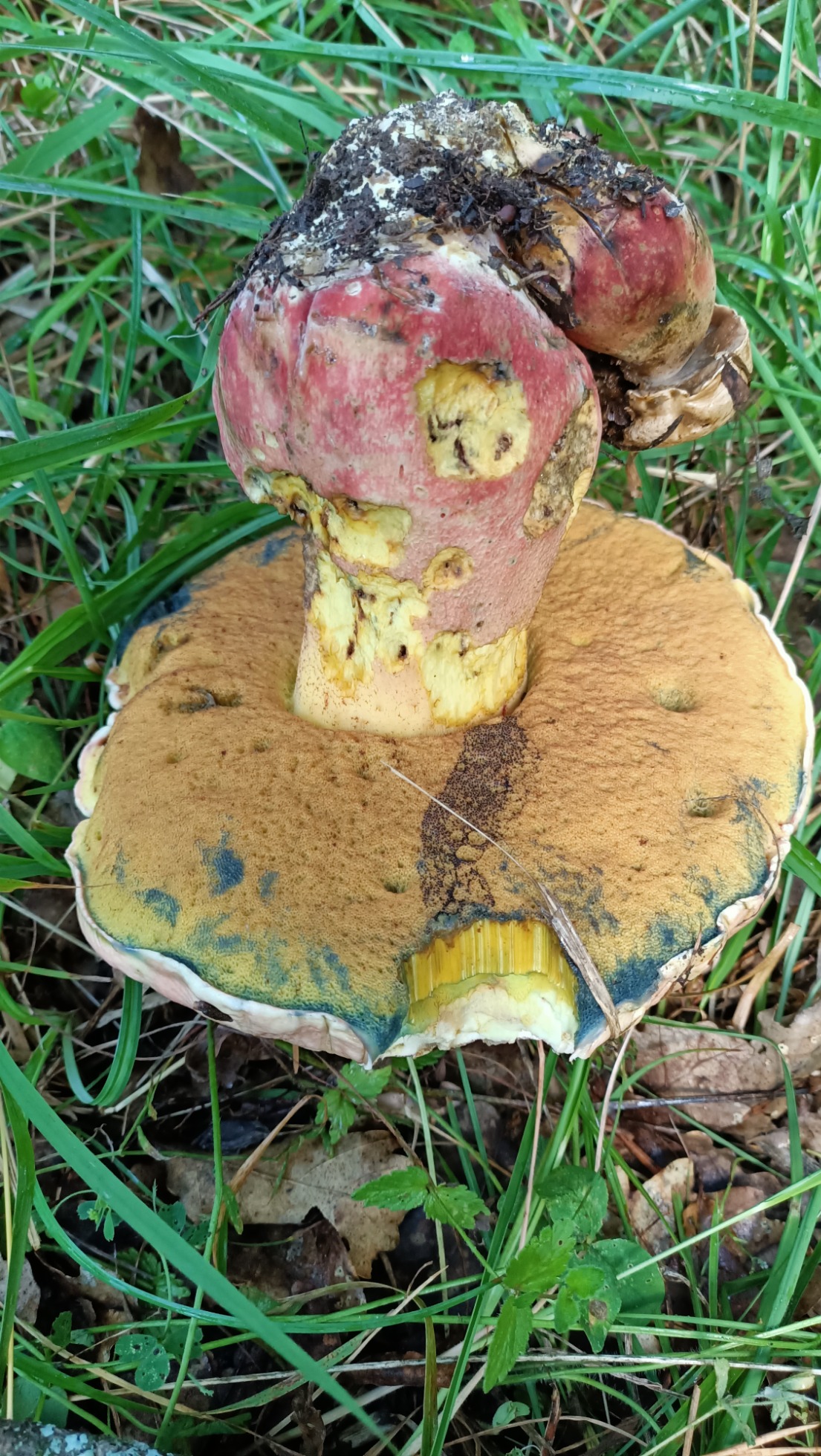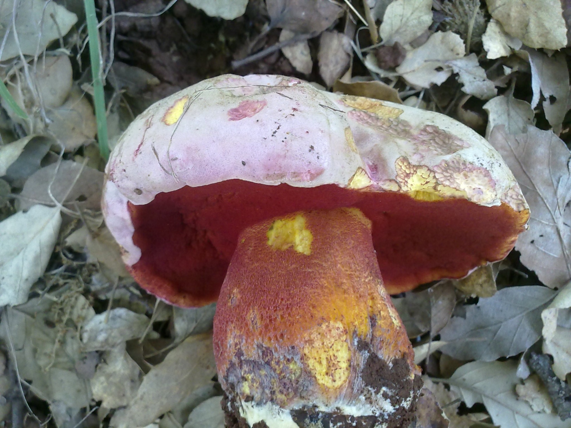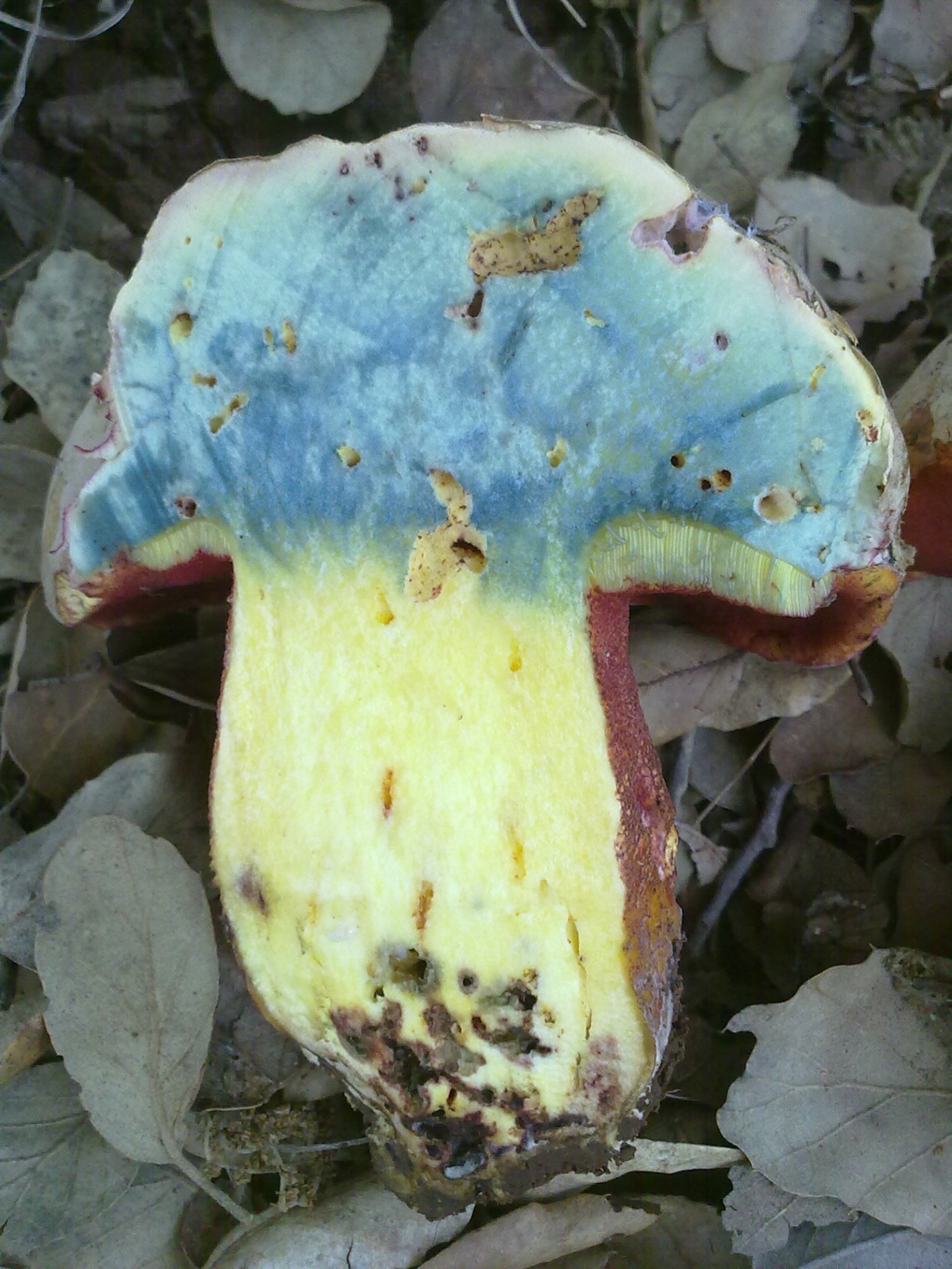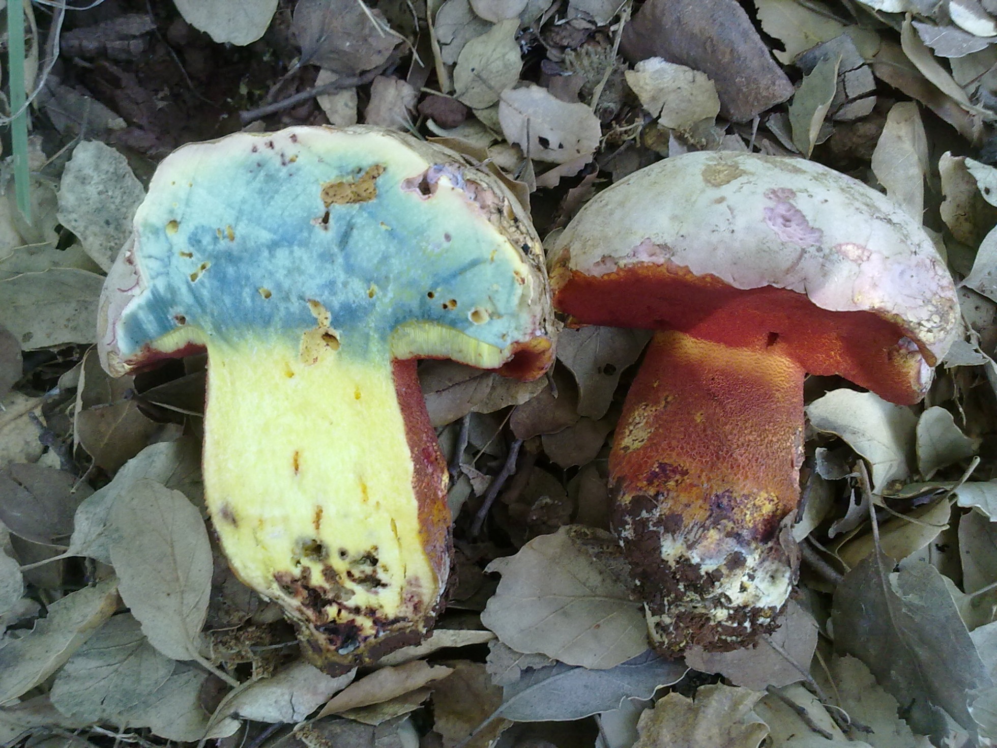 Una sencilla forma de separarlos de otros boletus similares, es practicarle un corte, y si muestra tonos de azul en la parte superior e inmutable amarillo en la parte inferior, sería sin dudas en Boletus rhodoxanthus como os muestro en mis fotos.