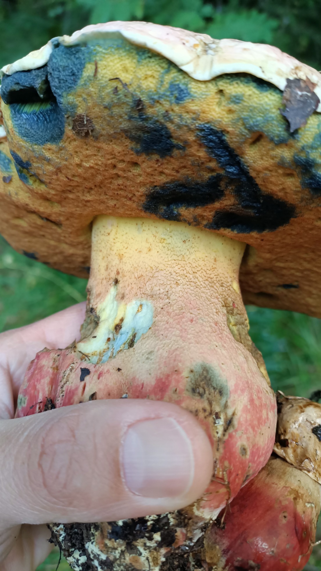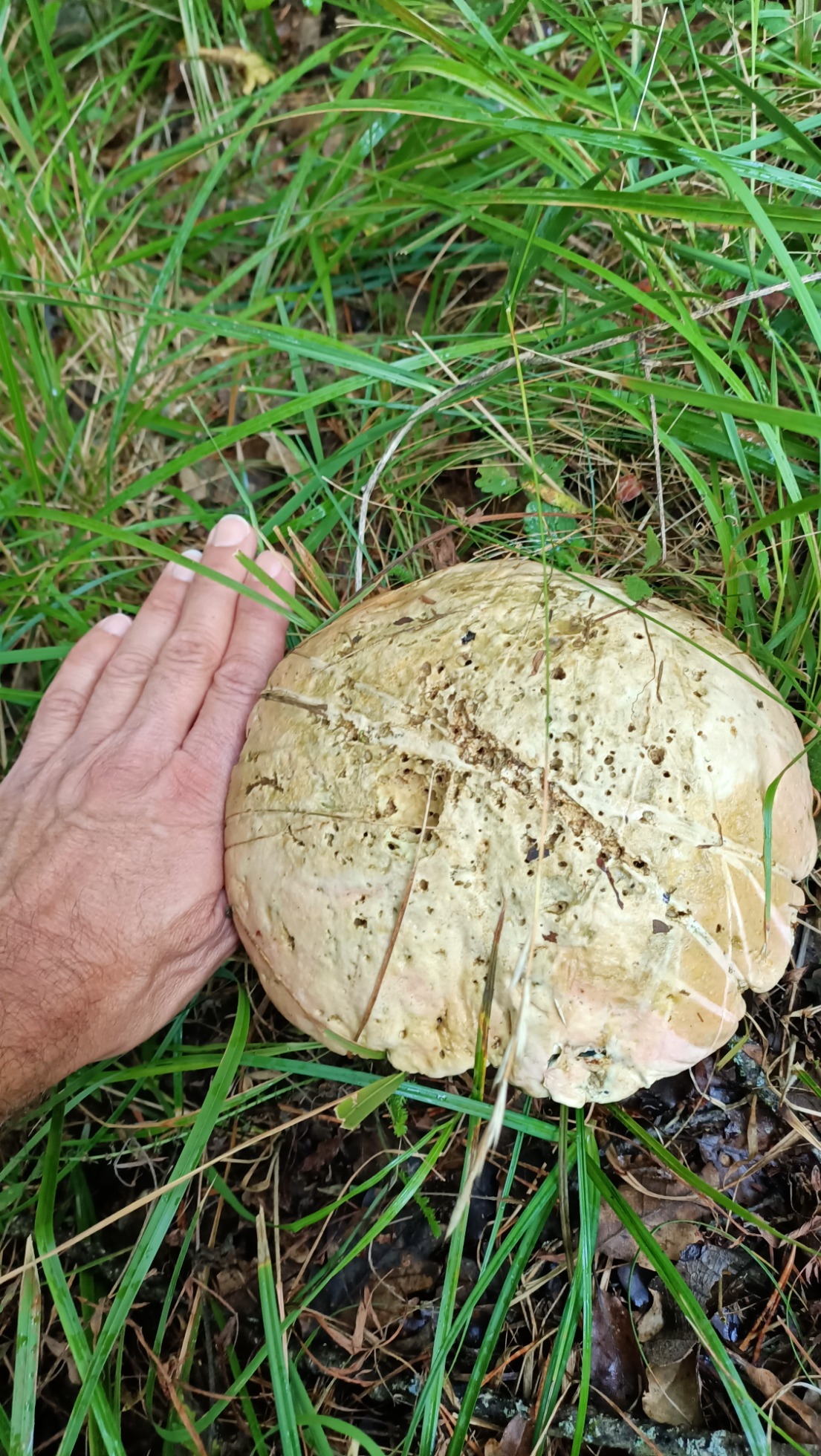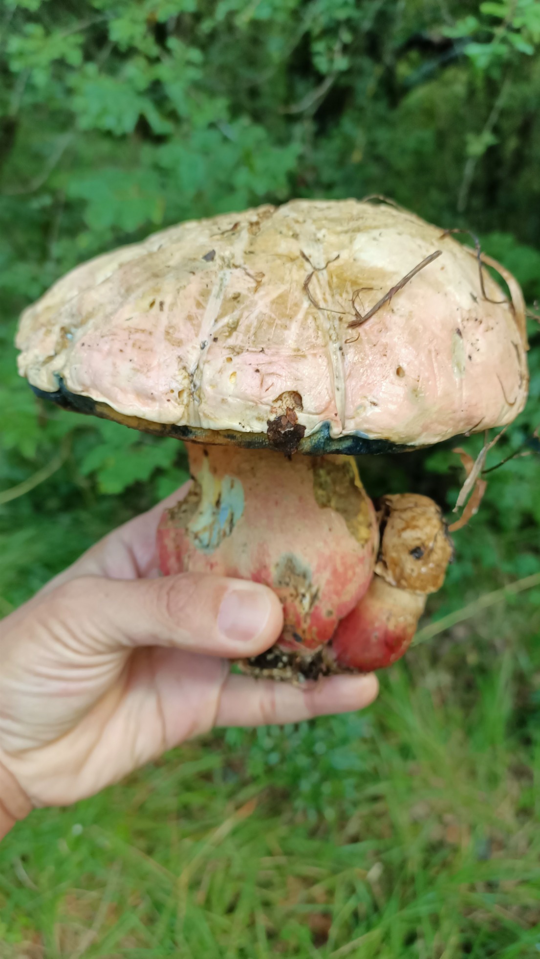 Hola amiguetes. Hace un par de semanas estuve con la familia en el pirineo aragonés en un precioso pueblo llamado Tramacastilla de Tena en pleno valle del Tena a unos 1250 metros. Dando un paseo encontré esta seta enorme. Llegó uno del pueblo la arrancó con delicadeza y me dijo 'esta del pie rojo es tóxica, por aquí salen muchas y cuando envejecen huele toda la zona fatal'. Es cierto que olía desagradable. Es la primera vez que veo esta seta es posible que sea Boletus Satanás o quizá el Boletus rhodoxanthus por los matices rosados del sombrero...